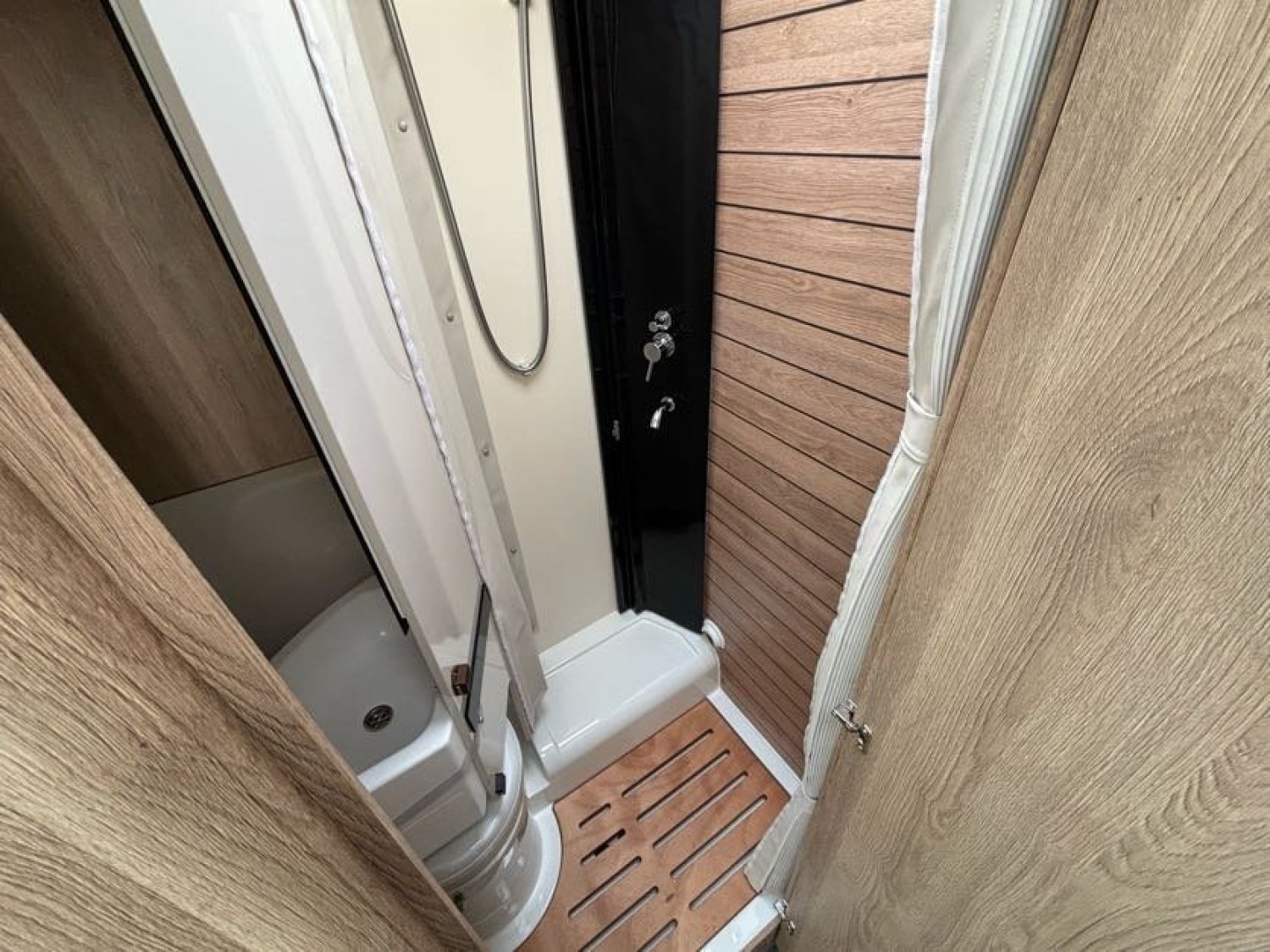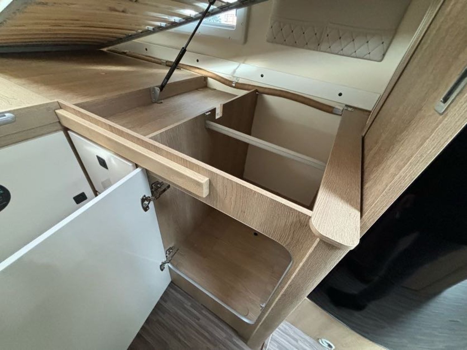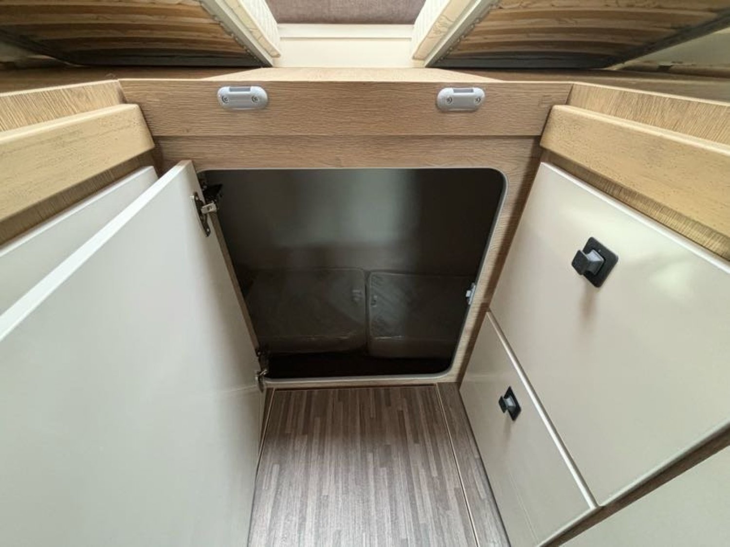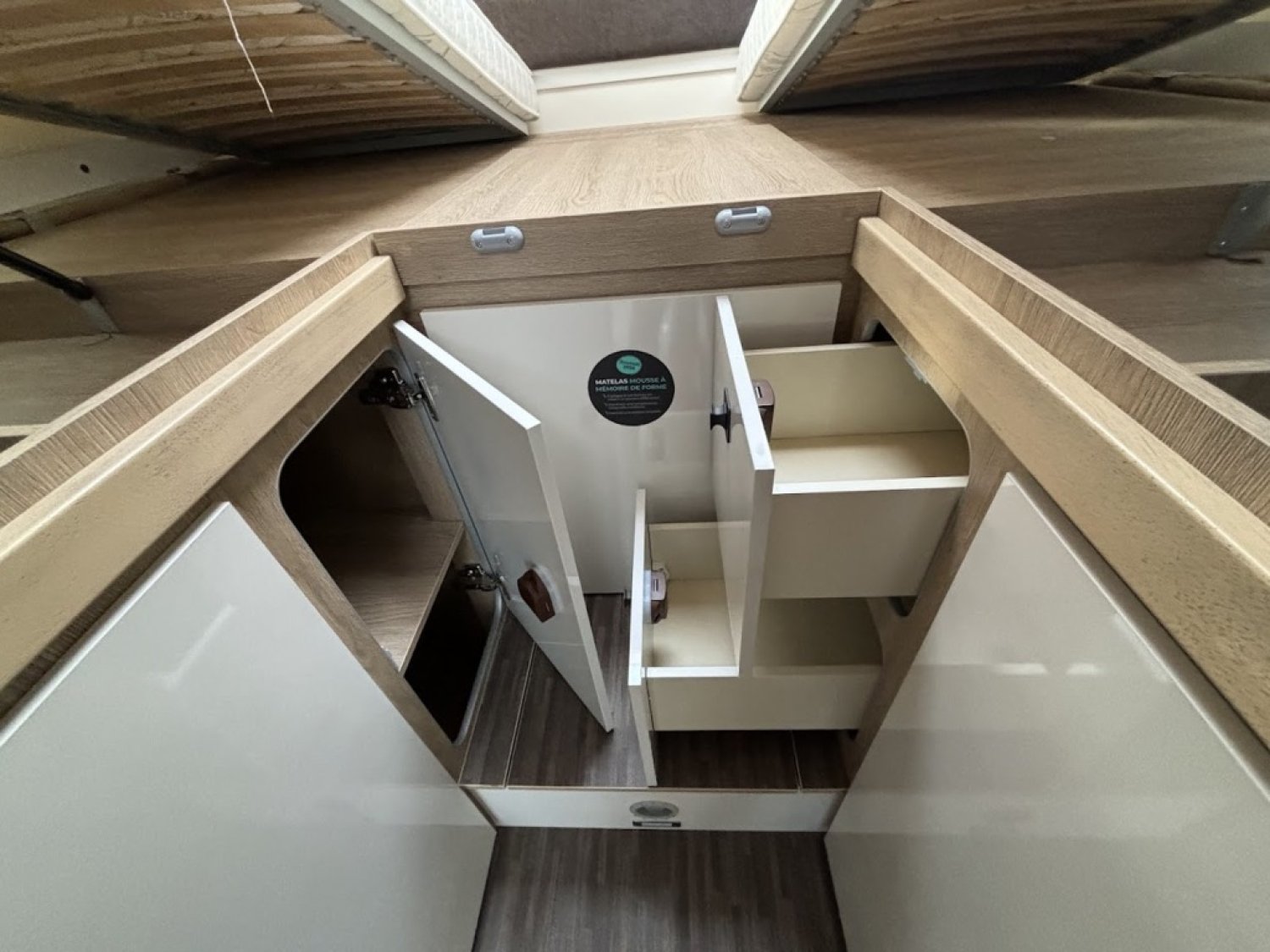 Cuisine en L, Douche à vario, Grande soute, lit jumeaux, lit pavillon cabine, Salon avant banquettes face à face, Salon avant sièges pivotants, WC Cassette.