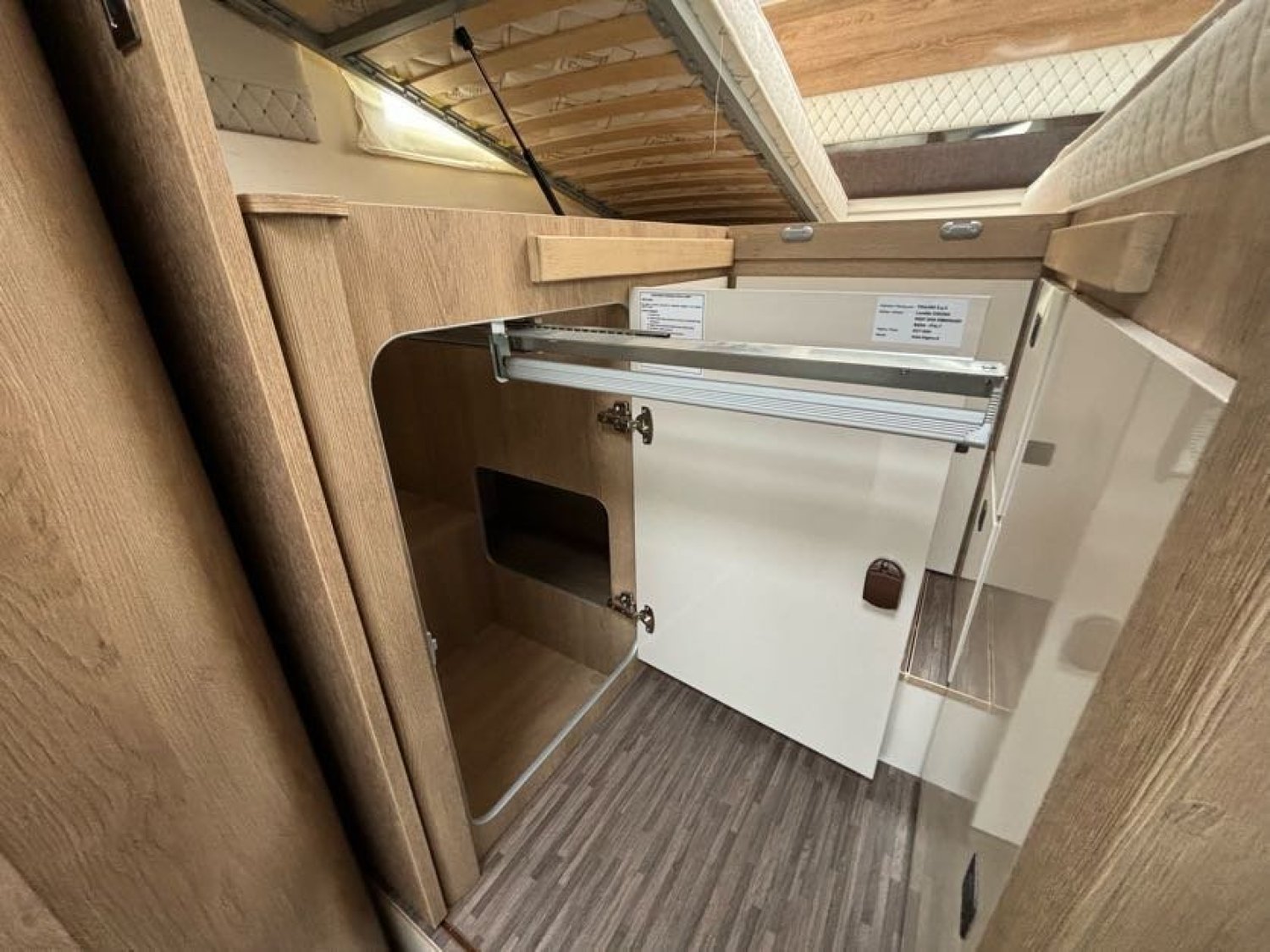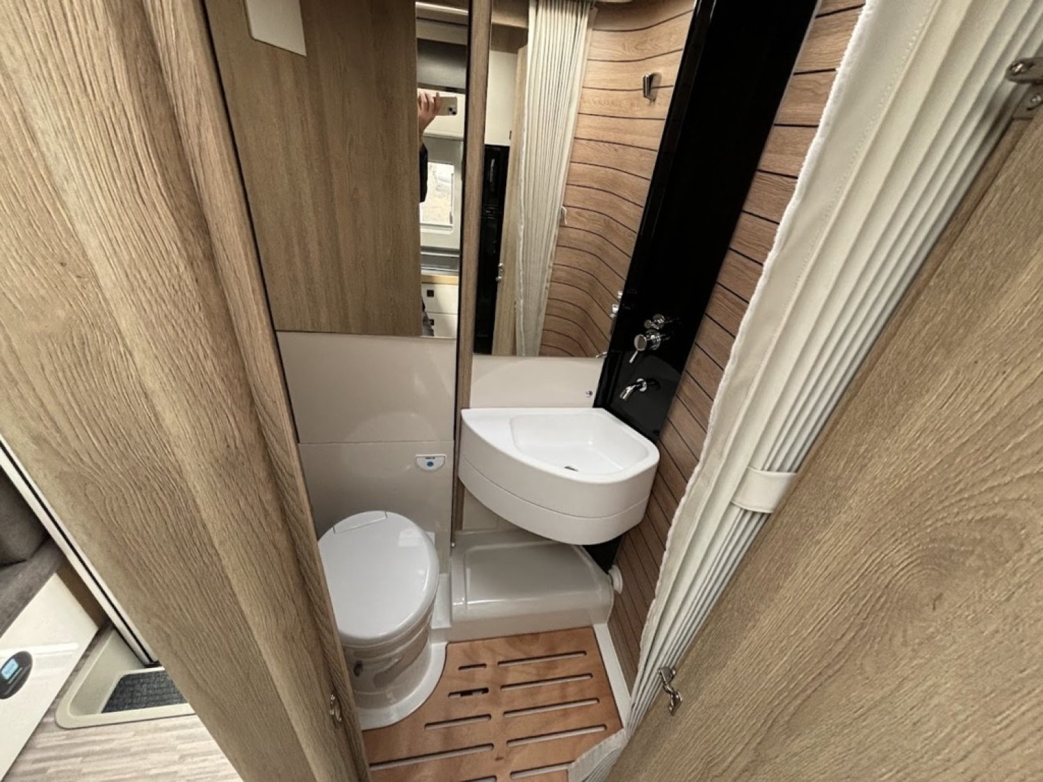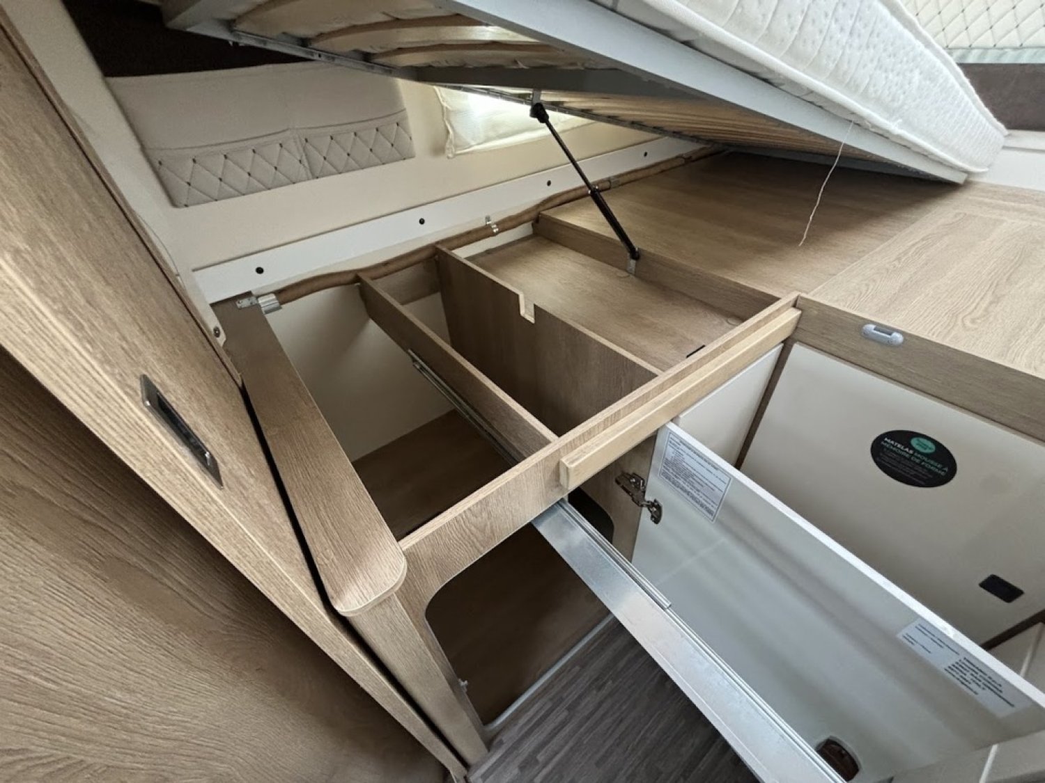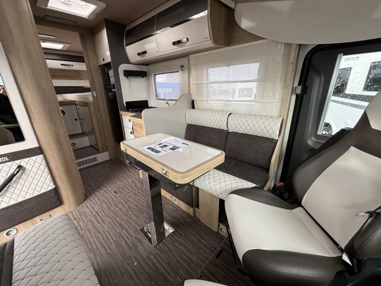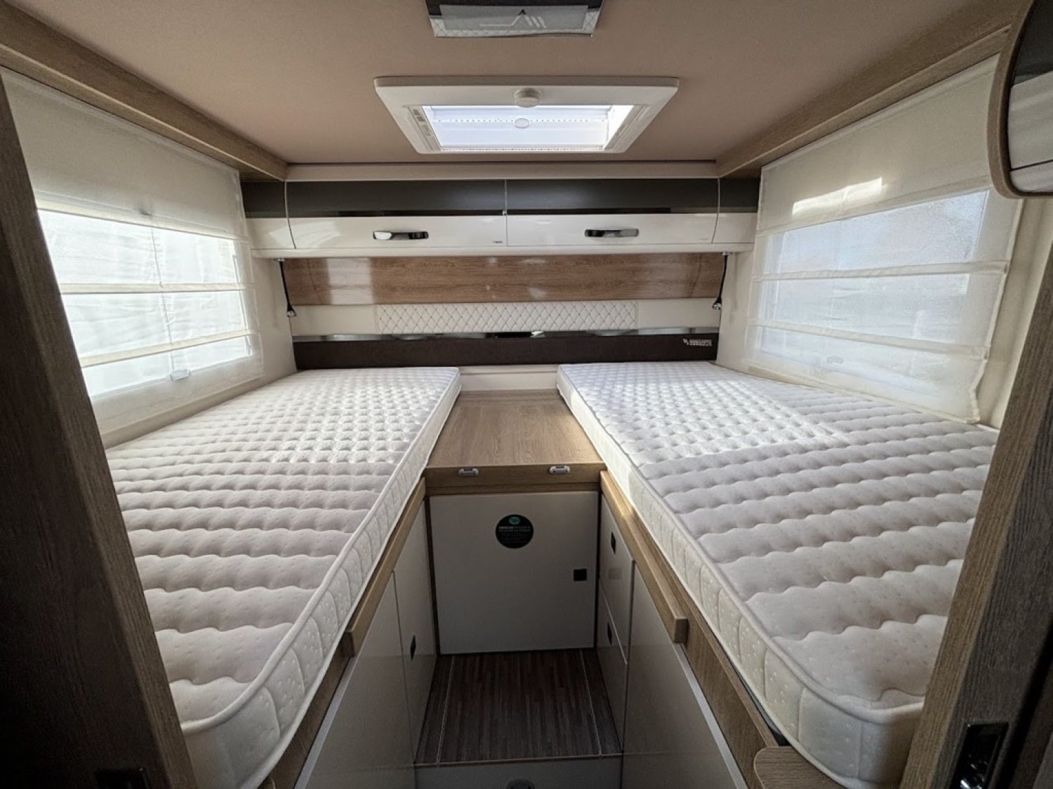 Cuisine en L, Douche à vario, Grande soute, lit jumeaux, lit pavillon cabine, Salon avant banquettes face à face, Salon avant sièges pivotants, WC Cassette.