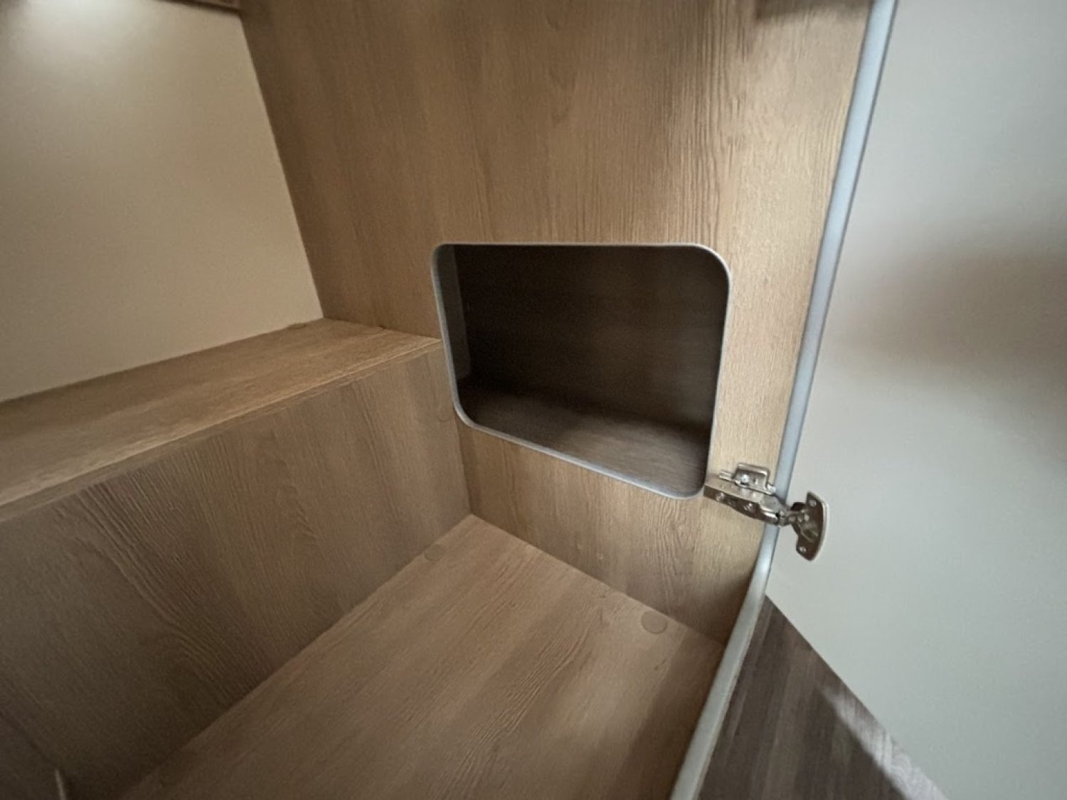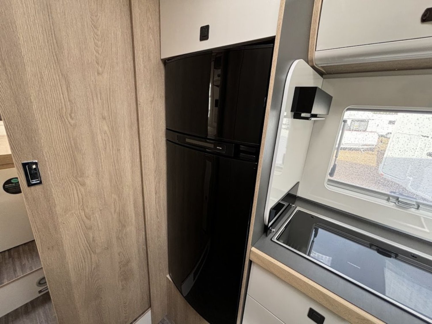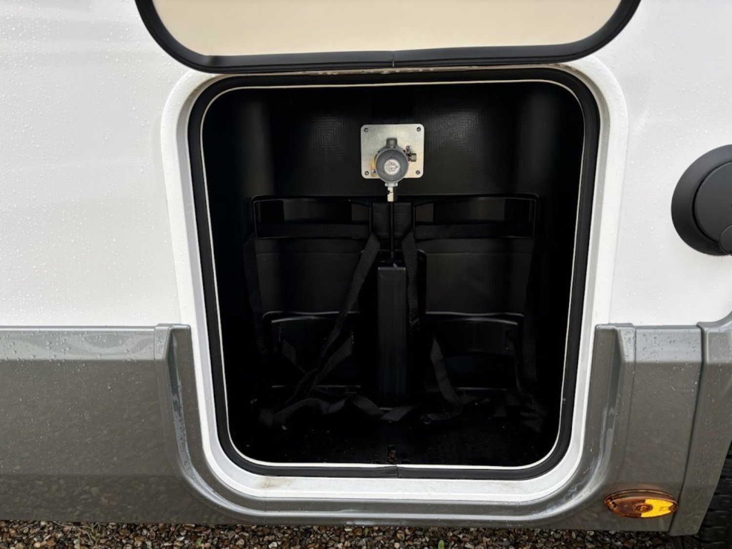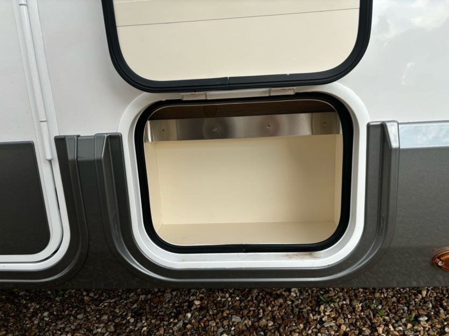Cuisine en L, Douche à vario, Grande soute, lit jumeaux, lit pavillon cabine, Salon avant banquettes face à face, Salon avant sièges pivotants, WC Cassette.