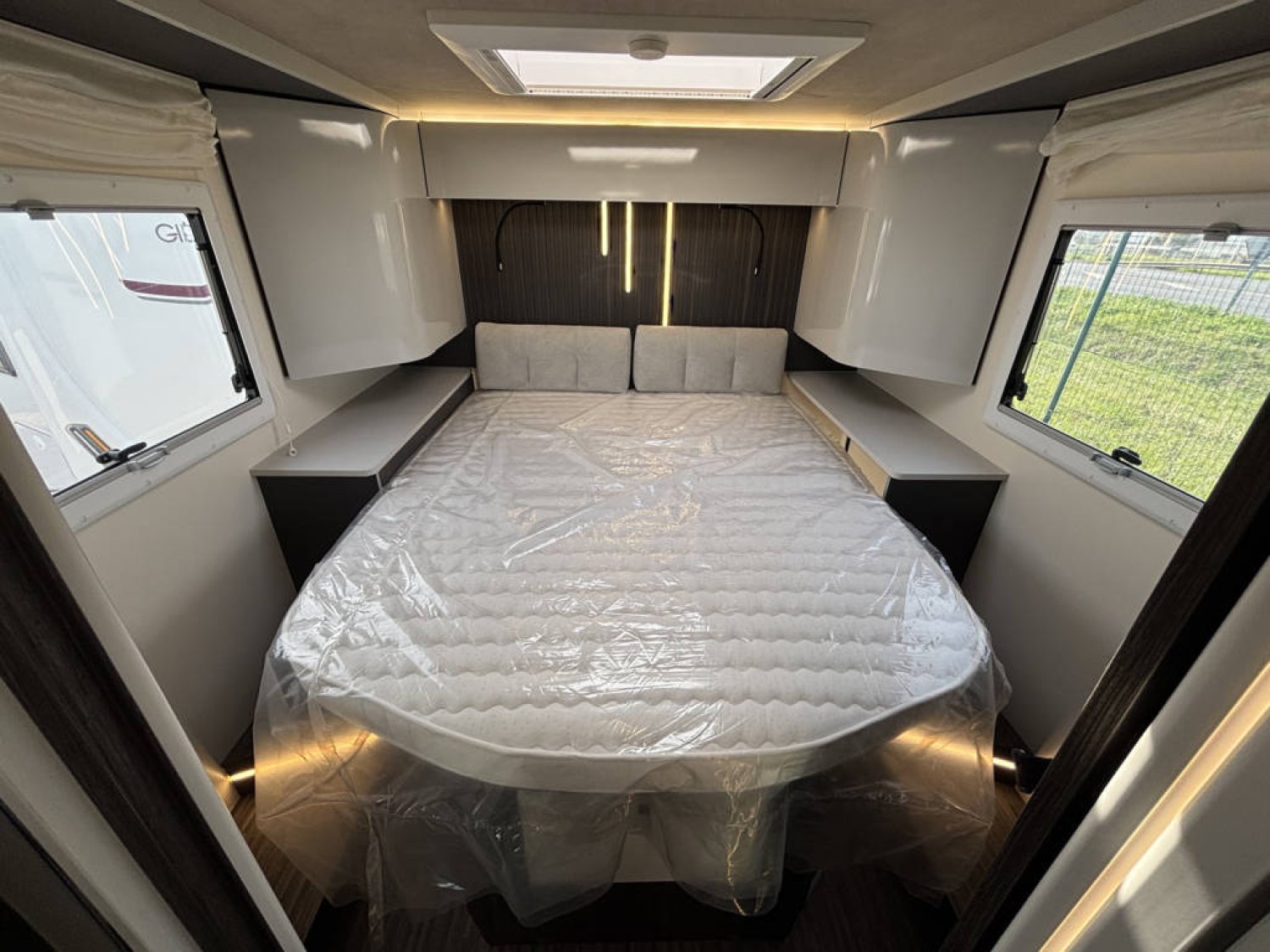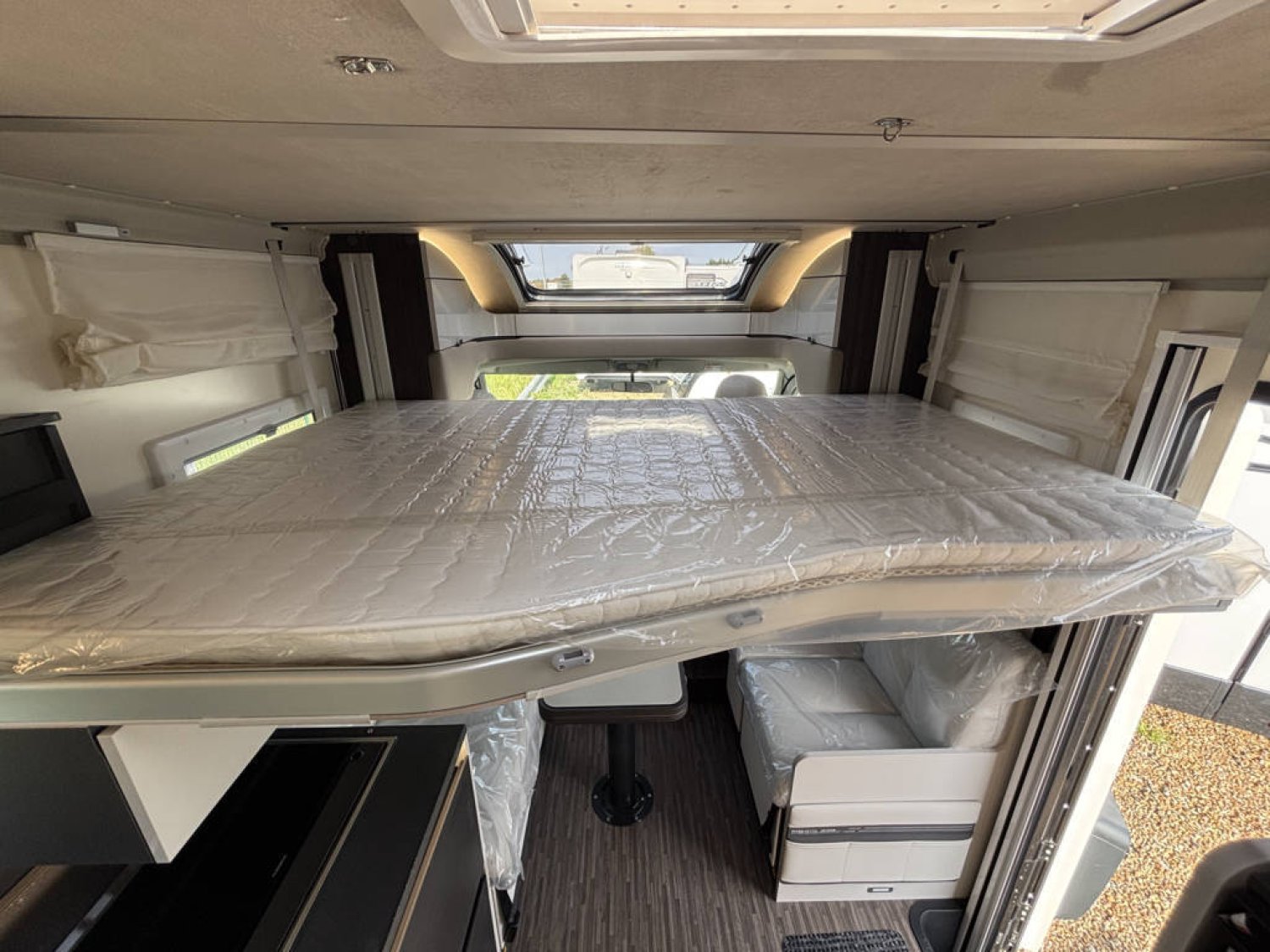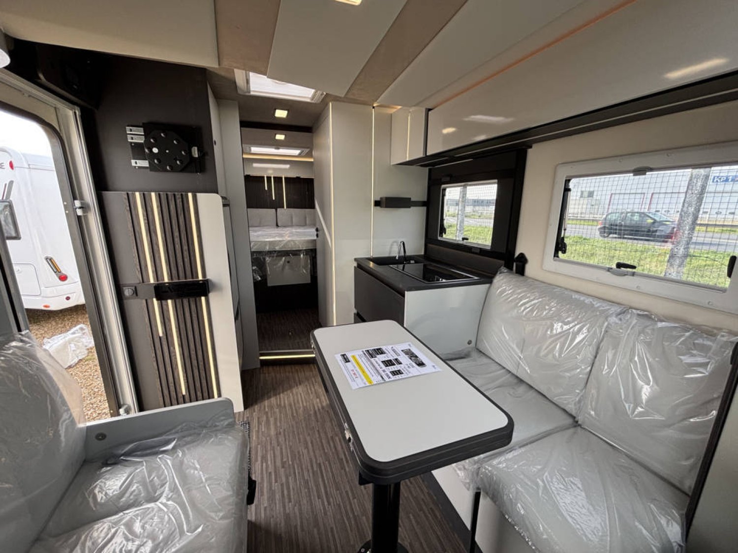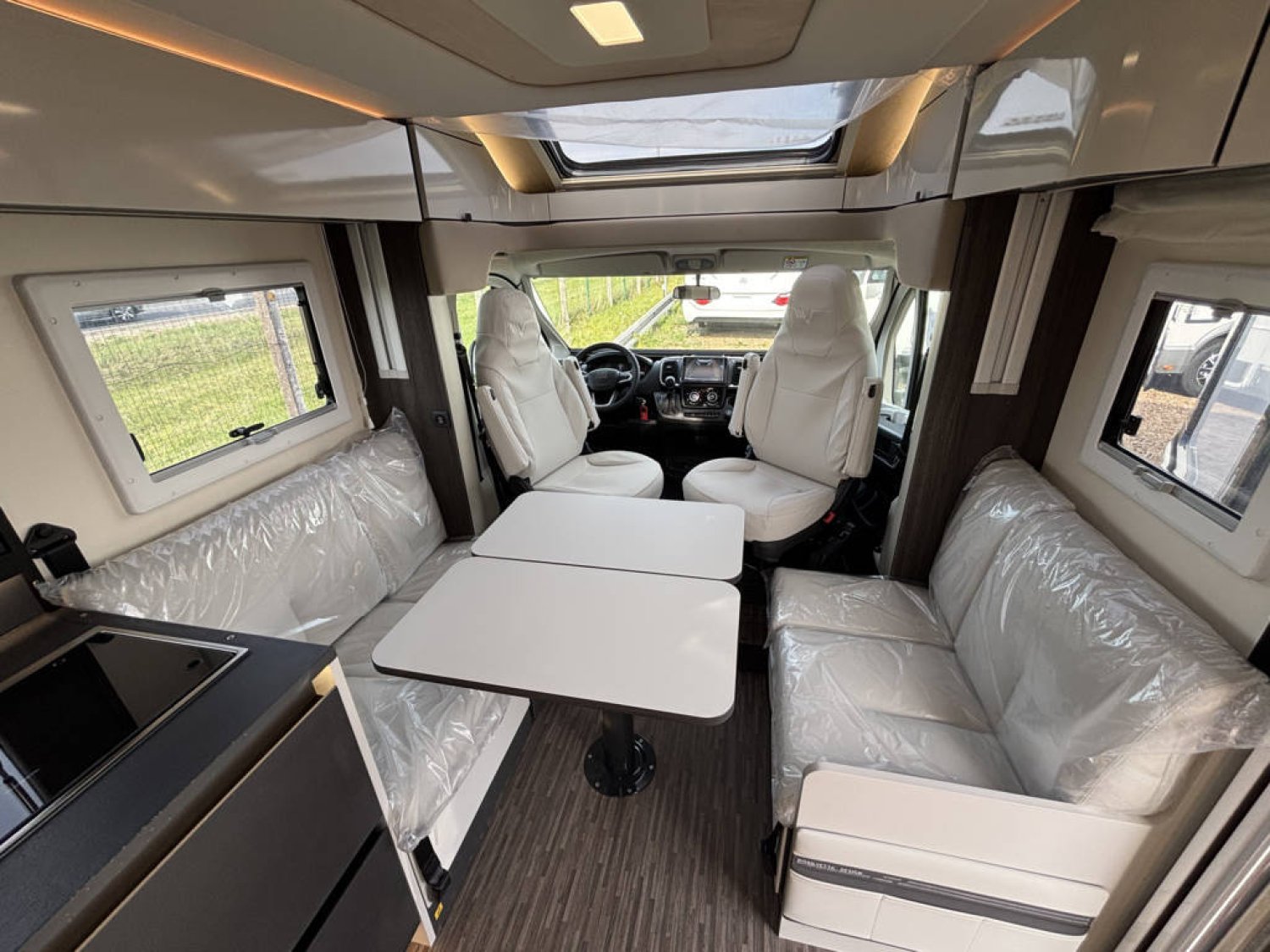 Cuisine en long, Douche indépendante, Grande soute, Lit central, lit pavillon, Salon avant banquettes face à face, Salon avant sièges pivotants, Soute réglable en hauteur, WC Cassette.