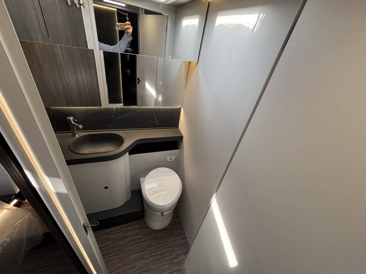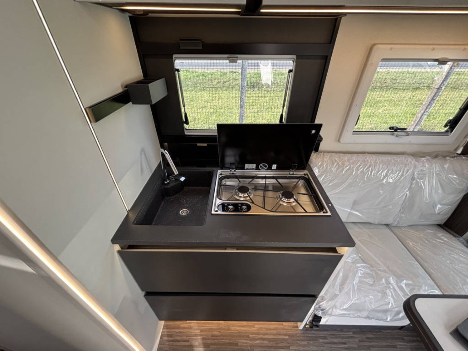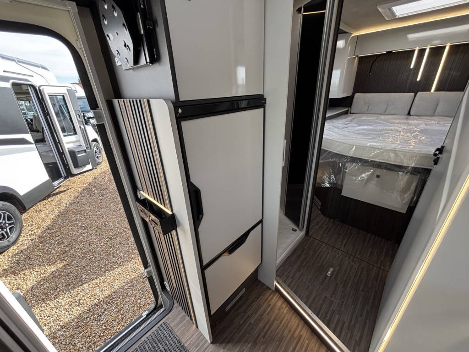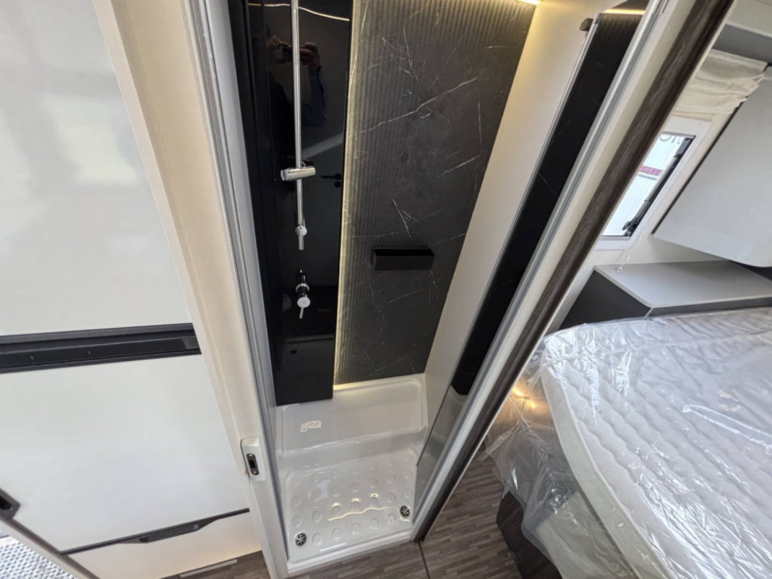 Cuisine en long, Douche indépendante, Grande soute, Lit central, lit pavillon, Salon avant banquettes face à face, Salon avant sièges pivotants, Soute réglable en hauteur, WC Cassette.