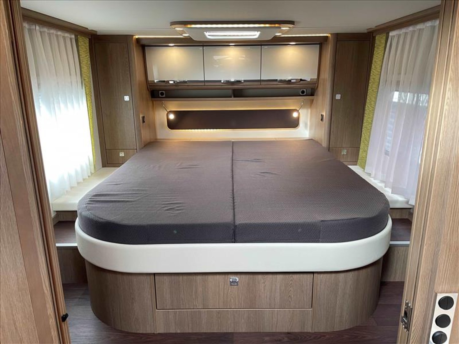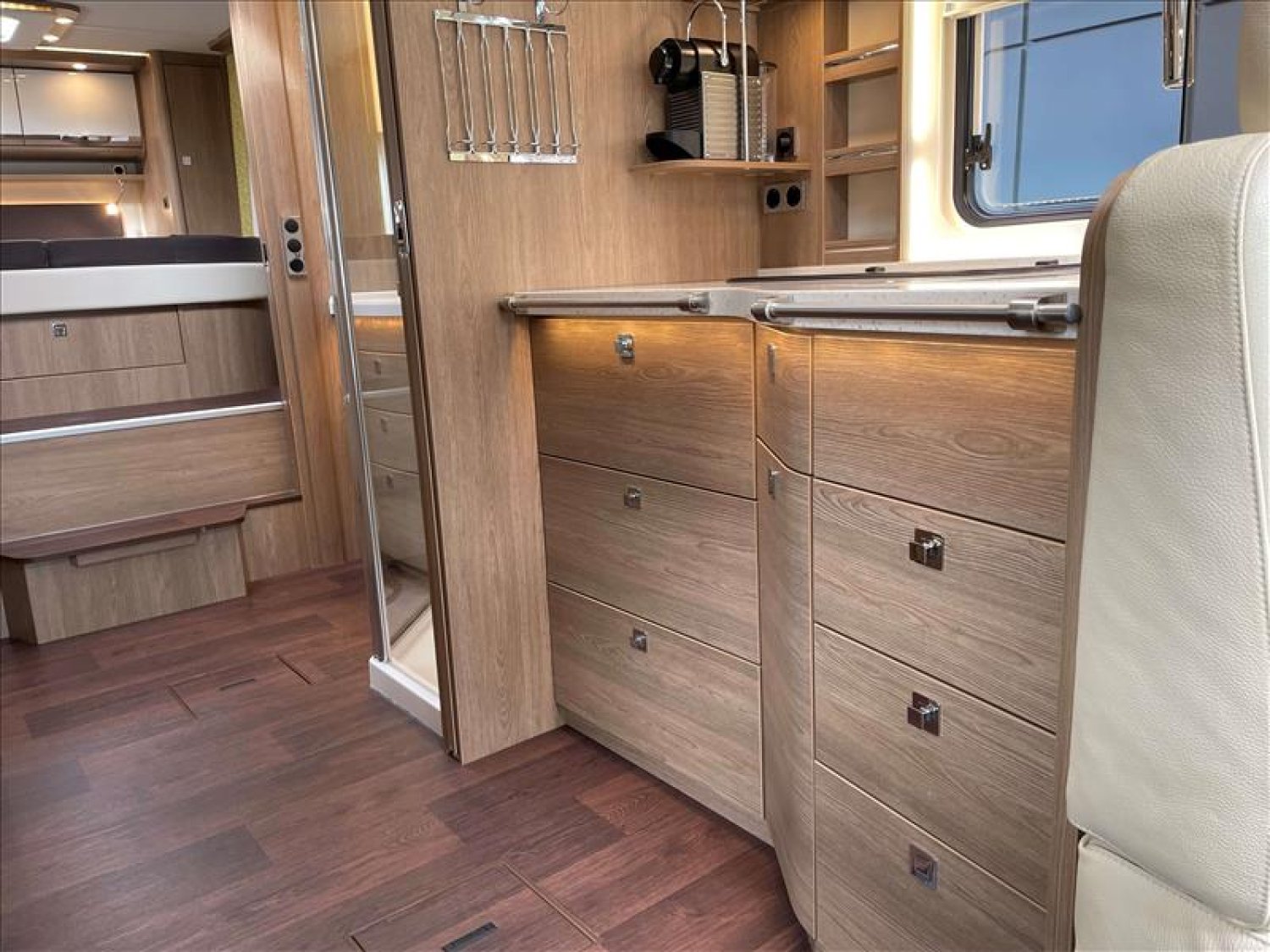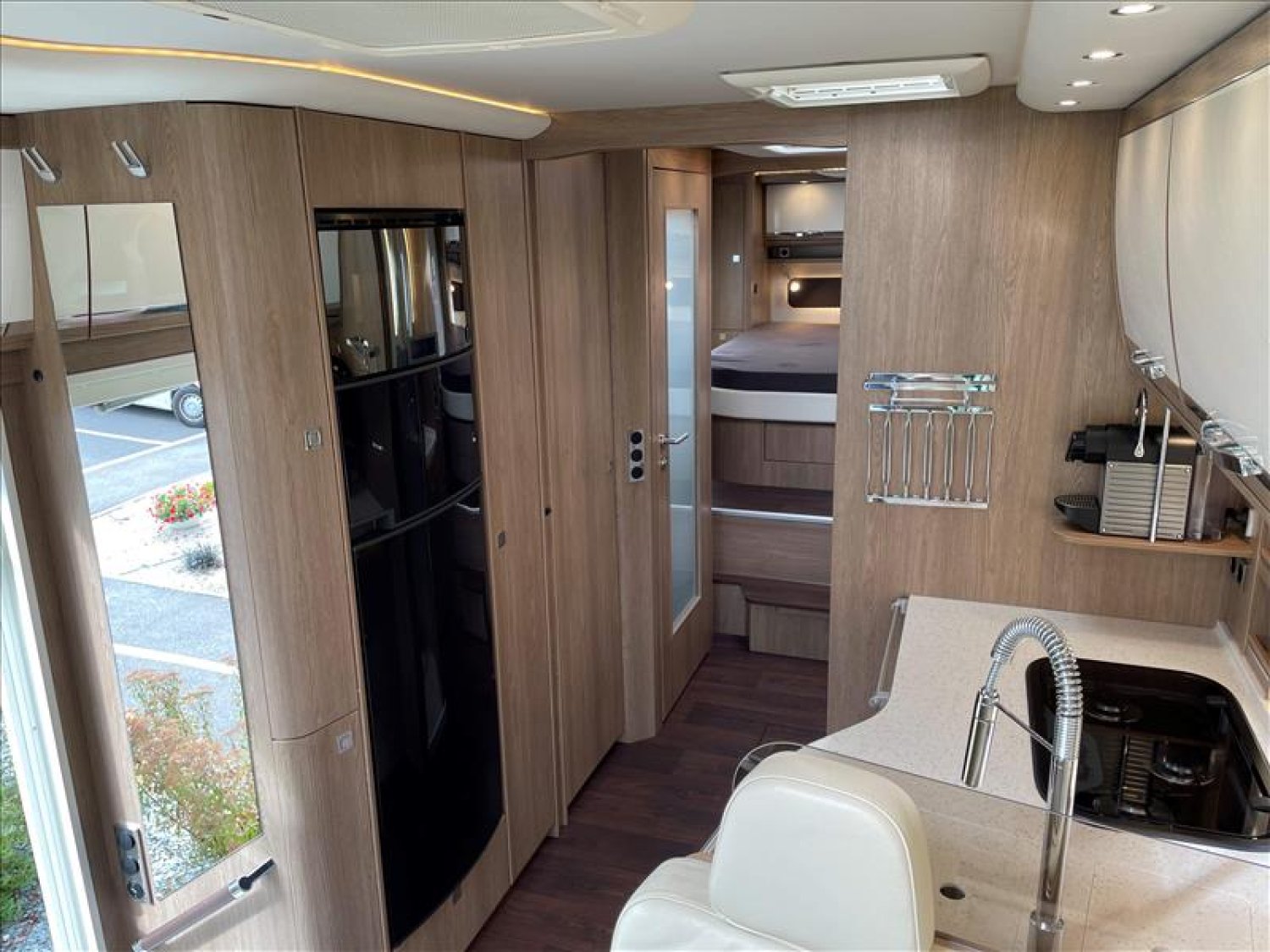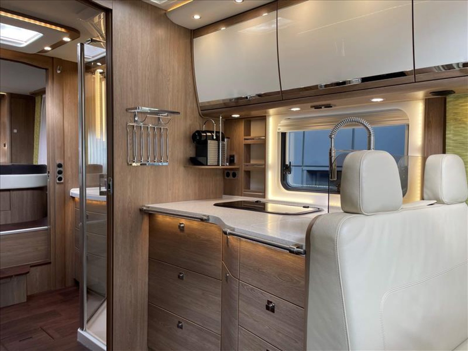 machine à café Nespresso., Plan de travail pleine masse en finition mate +, Double vasque, double tiroir « casserolier » +, Illumination indirecte au-dessus du baldaquin +, Lave-linge, Attelage 3500 kg Max., Réservoir carburant 280L, Lanterneau électrique à extraction/ventilation en cuisine, Prise de gaz extérieure, Salle de bain luxe avec WC séparé, Douchette extérieure, Isolation supplémenataires du comportiment moteur, Pack électrique Lithium 2 X 340 Ah récentes +, Combiné chargeur120 A/convertisseur 3000 W, Power-Sharing +, Protection automatique des batteries,, Panneau de commande Premium, prise 230 V dans le garage, Panneaux solaires avec puissanxe max. de 520 w, Antenne Sat Oyster 5 Twin Skew TV 32" + 24", Réservoir à gaz de 120 L avec remplissage a distance, Cuisine/Salon en version NOVEL:, Pompe de transfert eaux grises vers eaux noires, Système de vérins hydrauliques, Trappes d'inspection des réservoirs, Isolation phonique suppl. pour parois latéraux, Grand coffre de rangement supplémentaire en bas de caisse, Système de navigation avec ecran de 9", Caméra 360° "birdview" avec écran 8", Décor extérieur réalisé en optique carbone, Climatisation cellule, Store électrique 6m intégré au profil de toit, Cuir, Colonne de table réglable en hauteur, Caméra de recul, Habillage des parois et du toit en version lisse