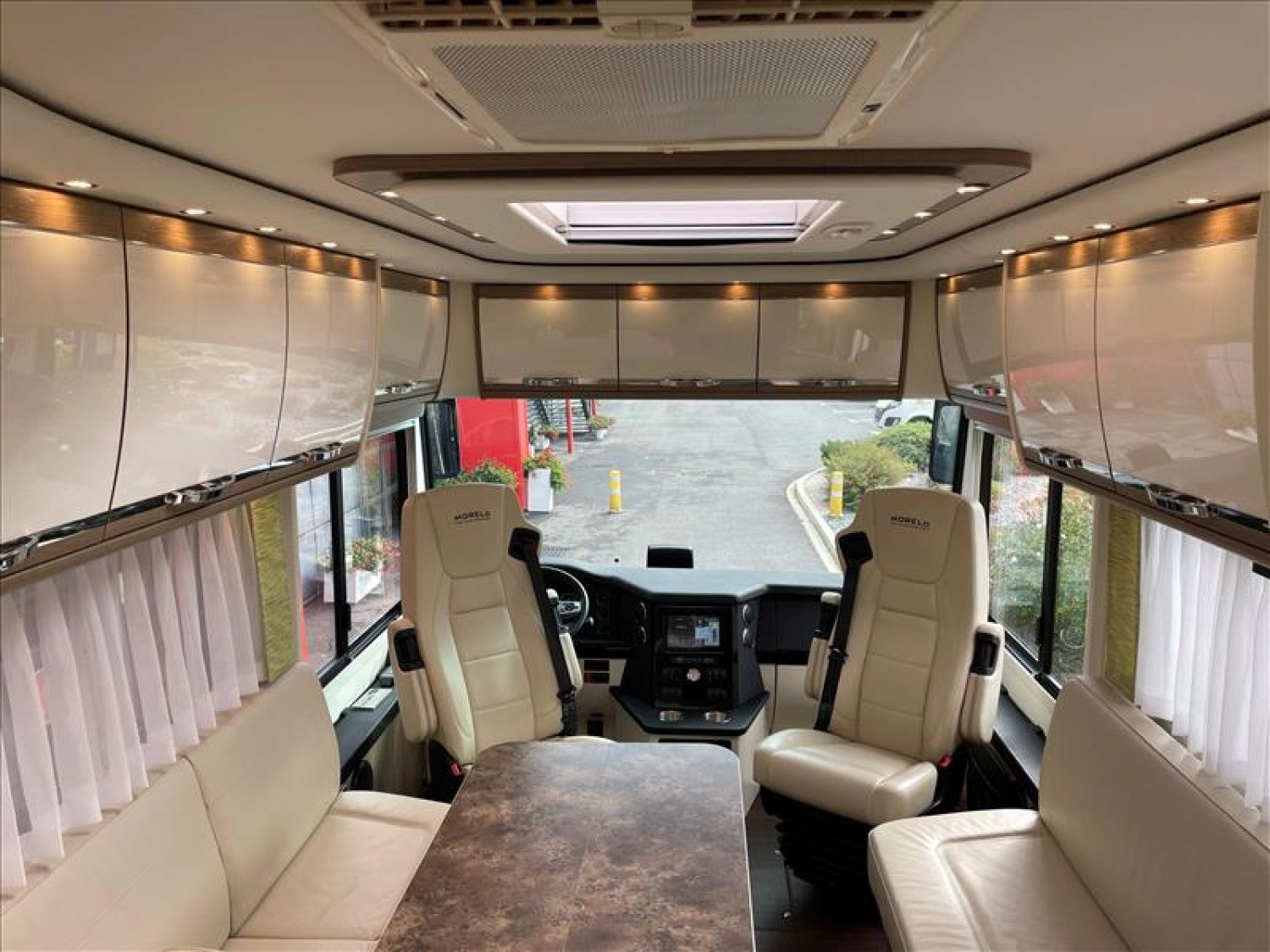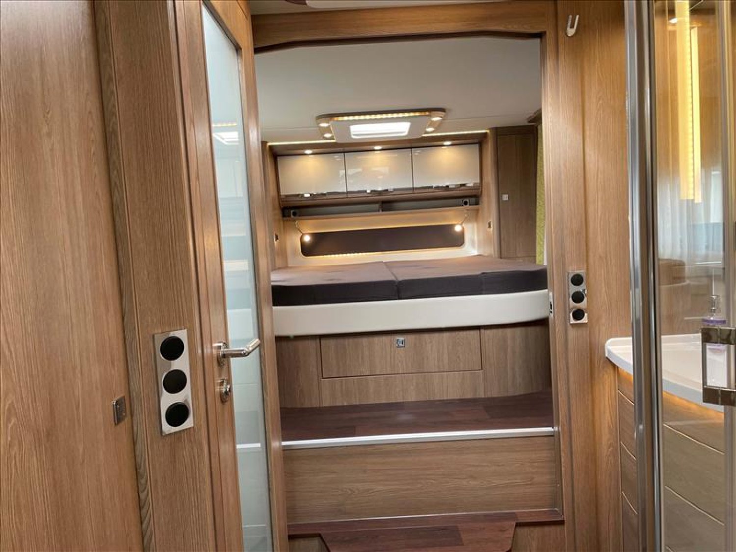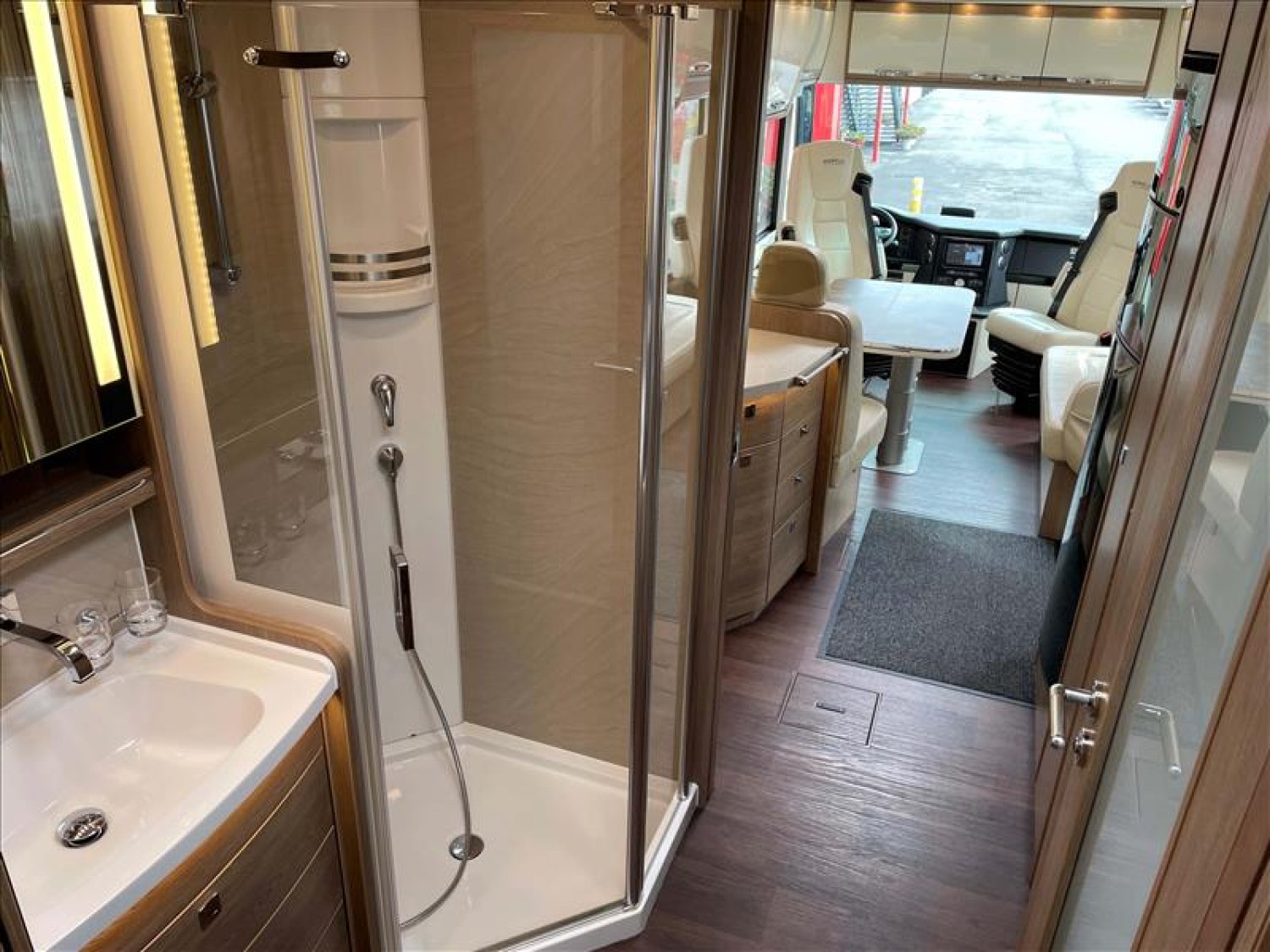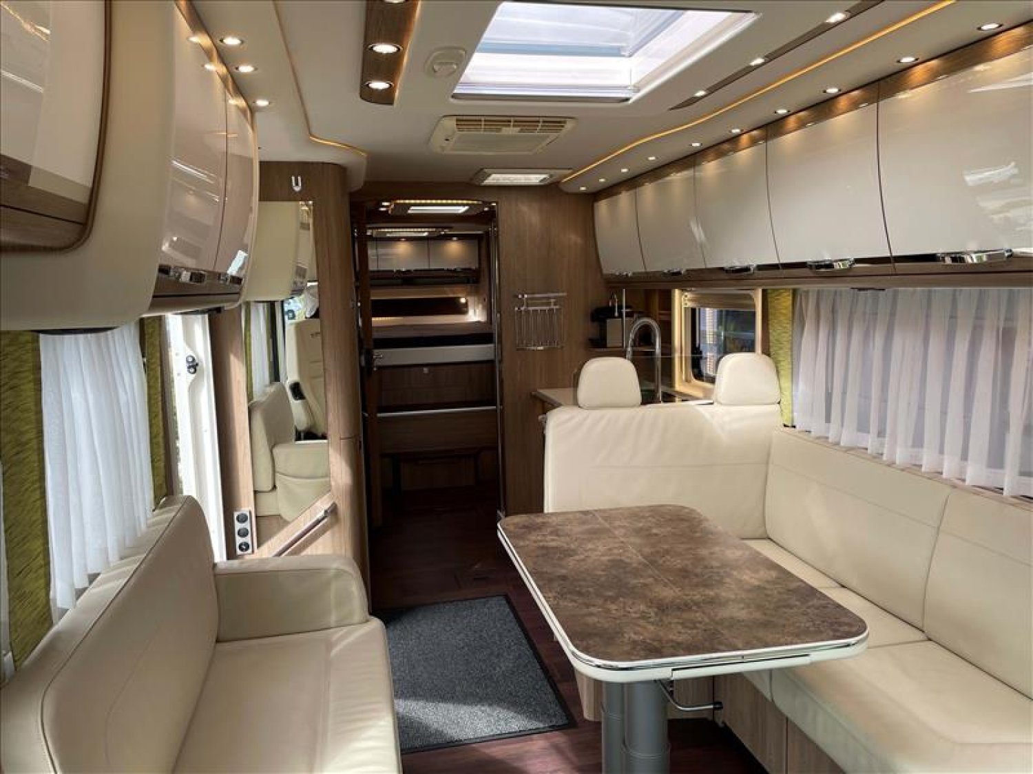 machine à café Nespresso., Plan de travail pleine masse en finition mate +, Double vasque, double tiroir « casserolier » +, Illumination indirecte au-dessus du baldaquin +, Lave-linge, Attelage 3500 kg Max., Réservoir carburant 280L, Lanterneau électrique à extraction/ventilation en cuisine, Prise de gaz extérieure, Salle de bain luxe avec WC séparé, Douchette extérieure, Isolation supplémenataires du comportiment moteur, Pack électrique Lithium 2 X 340 Ah récentes +, Combiné chargeur120 A/convertisseur 3000 W, Power-Sharing +, Protection automatique des batteries,, Panneau de commande Premium, prise 230 V dans le garage, Panneaux solaires avec puissanxe max. de 520 w, Antenne Sat Oyster 5 Twin Skew TV 32" + 24", Réservoir à gaz de 120 L avec remplissage a distance, Cuisine/Salon en version NOVEL:, Pompe de transfert eaux grises vers eaux noires, Système de vérins hydrauliques, Trappes d'inspection des réservoirs, Isolation phonique suppl. pour parois latéraux, Grand coffre de rangement supplémentaire en bas de caisse, Système de navigation avec ecran de 9", Caméra 360° "birdview" avec écran 8", Décor extérieur réalisé en optique carbone, Climatisation cellule, Store électrique 6m intégré au profil de toit, Cuir, Colonne de table réglable en hauteur, Caméra de recul, Habillage des parois et du toit en version lisse