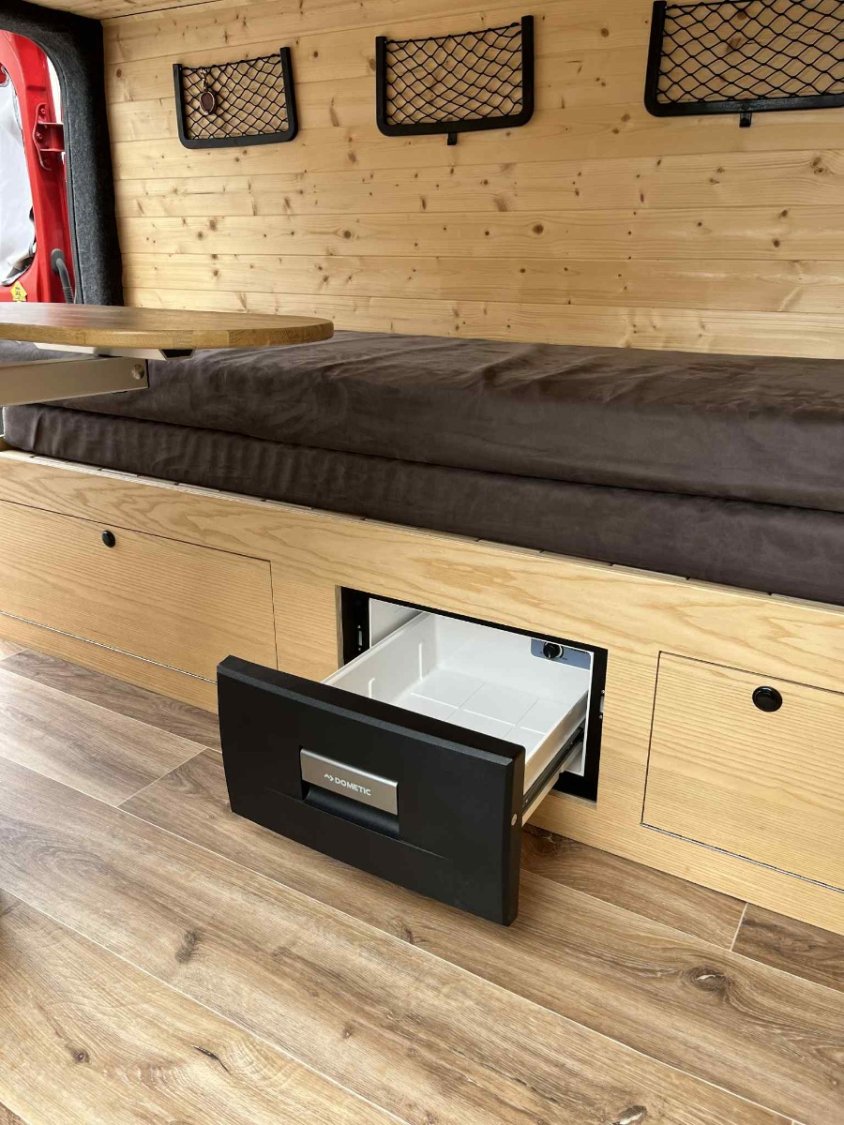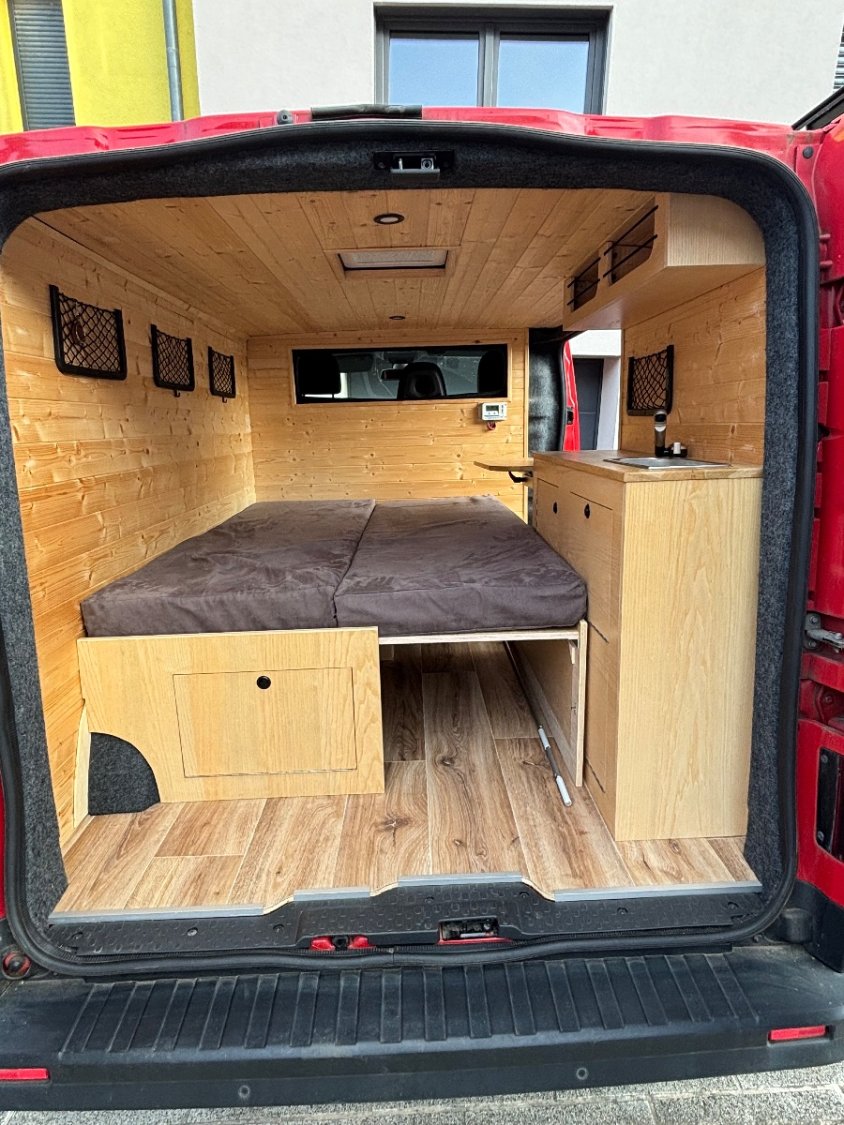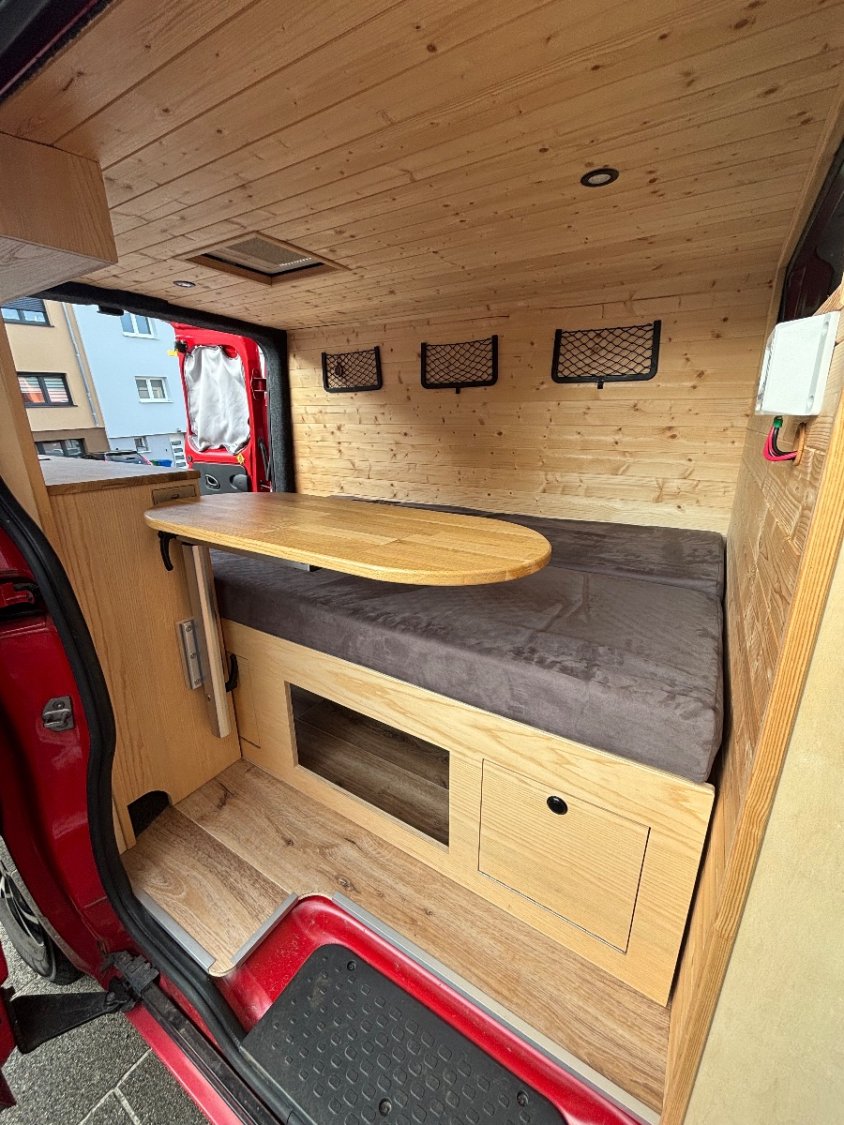 - intérieur tout en bois (+ isolation) aménagé par Vanatipik (société située à Liège) comprenant : - canapé / lit peigne 2 personnes - table amovible - divers meubles de rangement - évier + robinet avec réservoir 5 L (et réservoir eau usée) - frigo - lampes tactiles au plafond - stores et moustiquaires intégrés à la fenêtre latérale et au lanterneau - batterie auxiliaire - prises USB