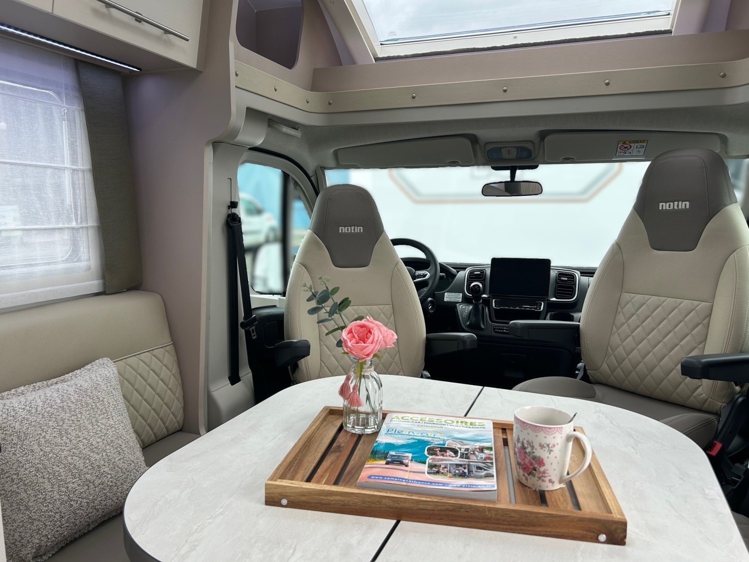 La cellule bénéficie d’une sellerie simili cuir bi-ton, d’une protection de sol et d’une ambiance élégante propre à la marque Notin. Avec ses 6,99 m de long et ses 2,89 m de haut, il reste compact tout en offrant un espace intérieur généreux et bien optimisé.
