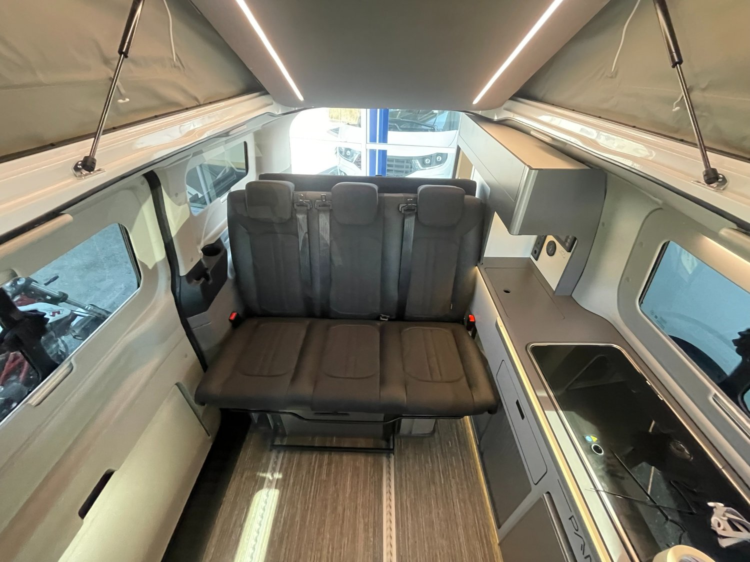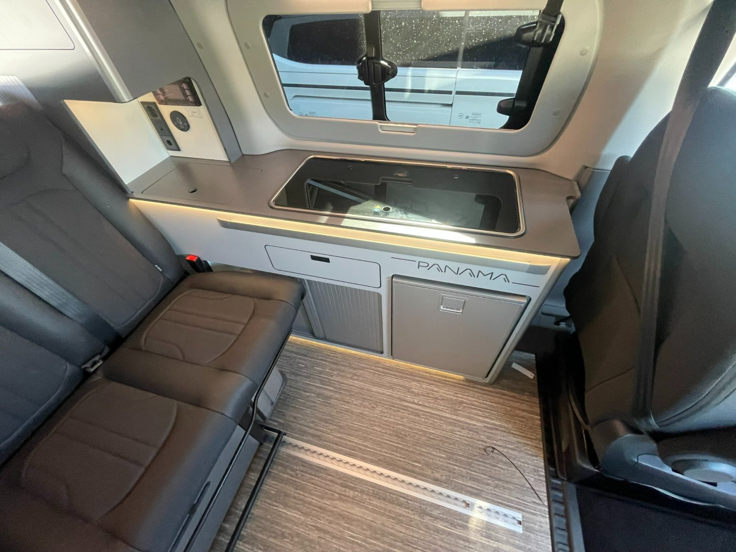 Notre van dispose d’une plaque de cuisson à gaz (deux feux) et d’un évier intégré, d’un réfrigérateur avec freezer et ouverture avant, de nombreux espaces de rangement… entre autres options.