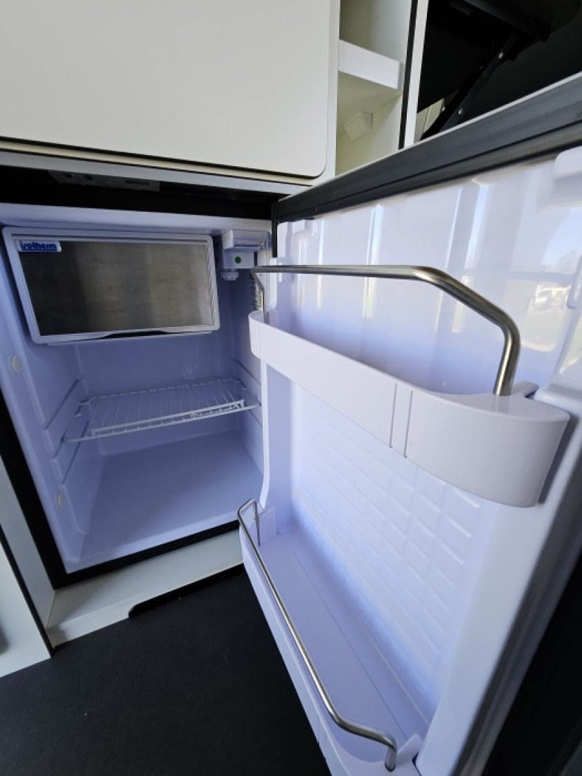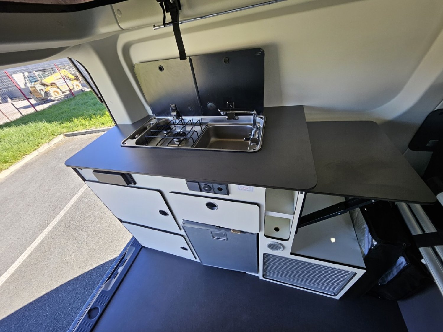 Nombreuses prises USB, 12V et 230V - Nombreux éclairages dans la cellule - Aménagement intérieur et équipements de cuisine : Plaque de cuisson à 2 feux gaz et bouteilles de gaz fournies - Évier avec mitigeur eau chaude eau froide - Réfrigérateur de 50L avec freezer