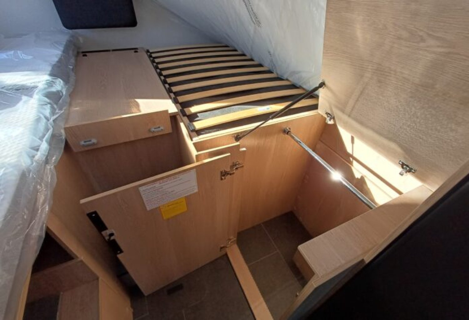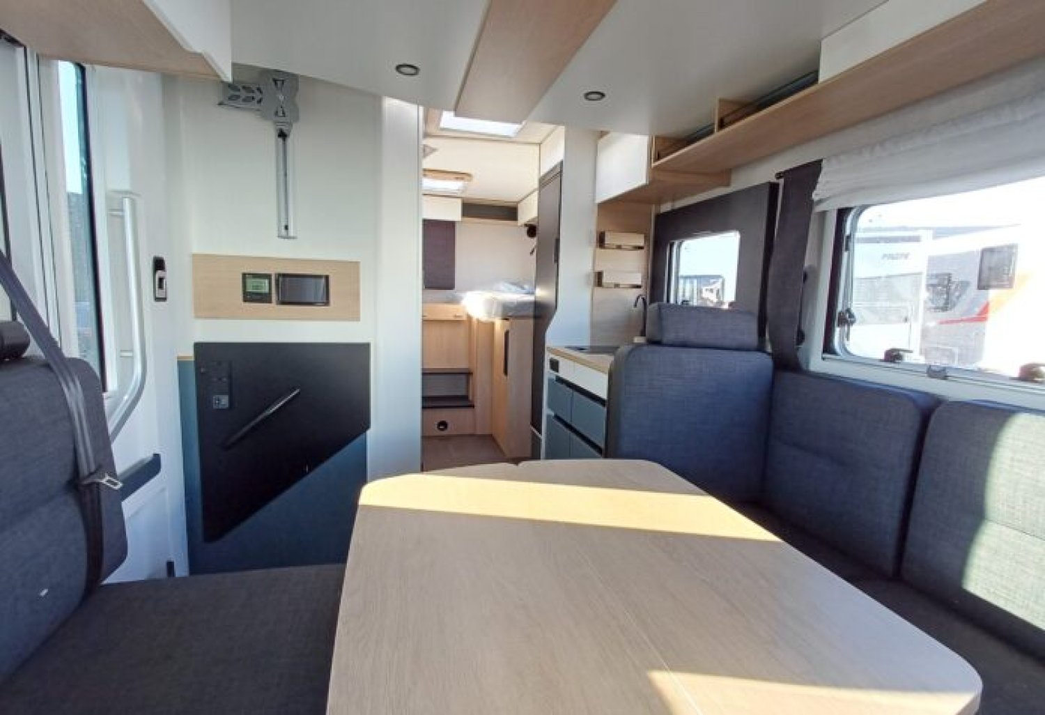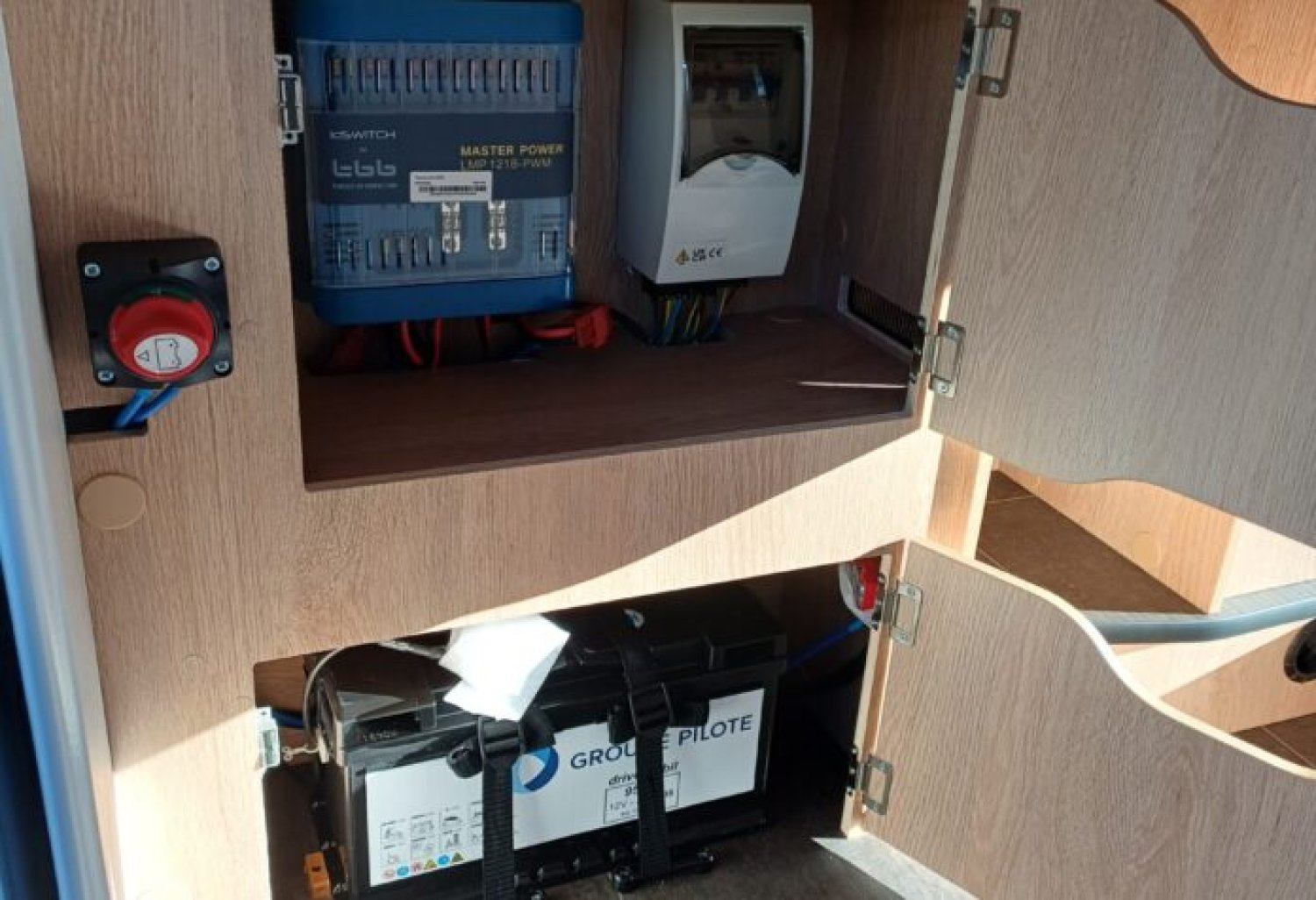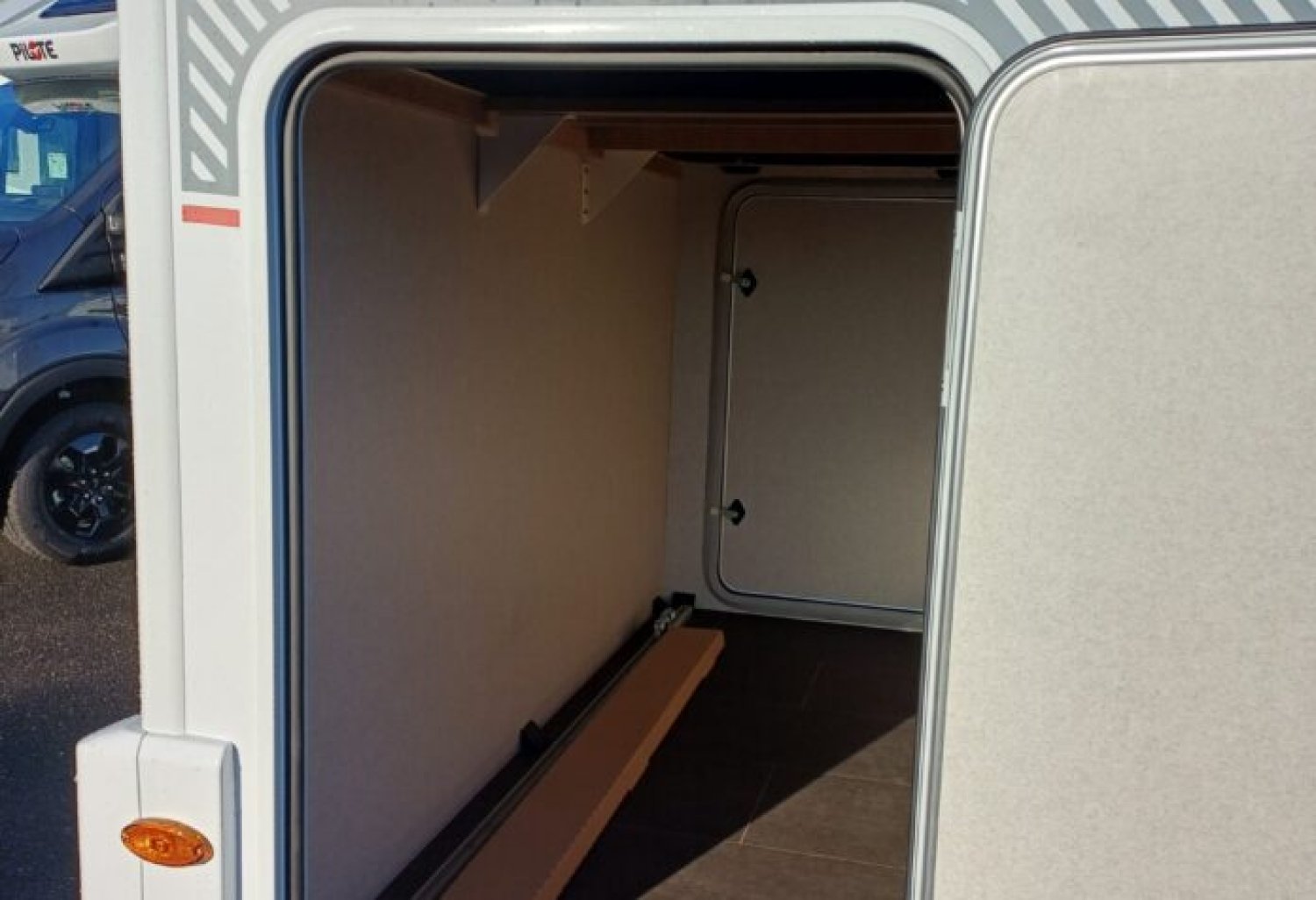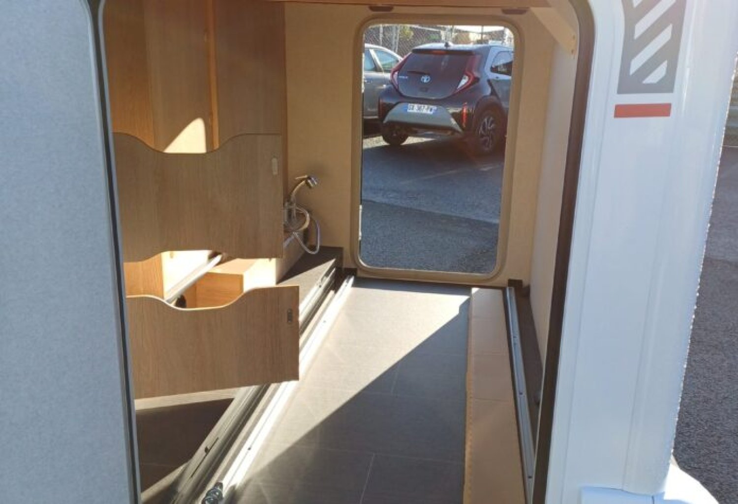 Soit : éclairage, prise 230V et rails en soute, douchette, store banne, caillebotis, inverseur automatique, crash sensor, réservoir eaux usées hors-gel, poubelle intégrée et porte-serviette