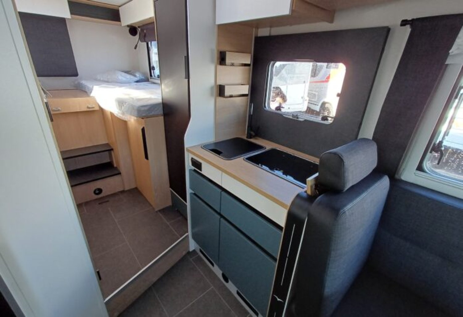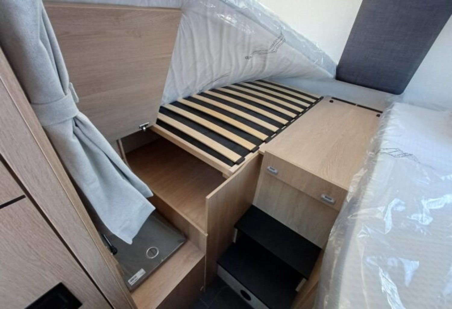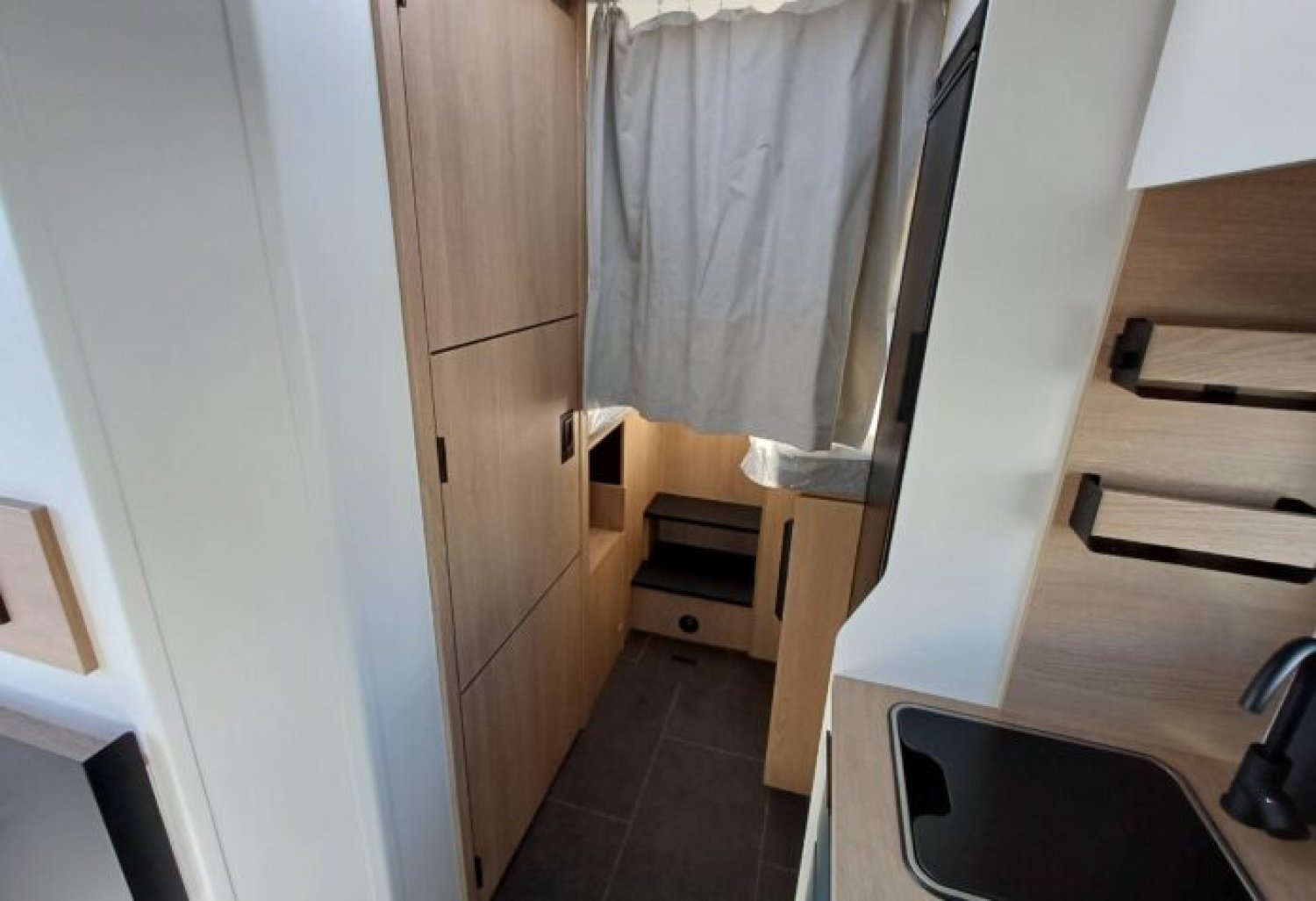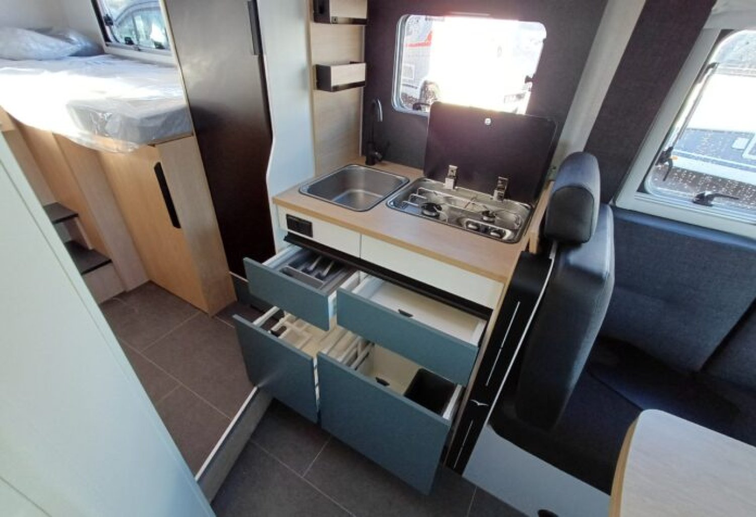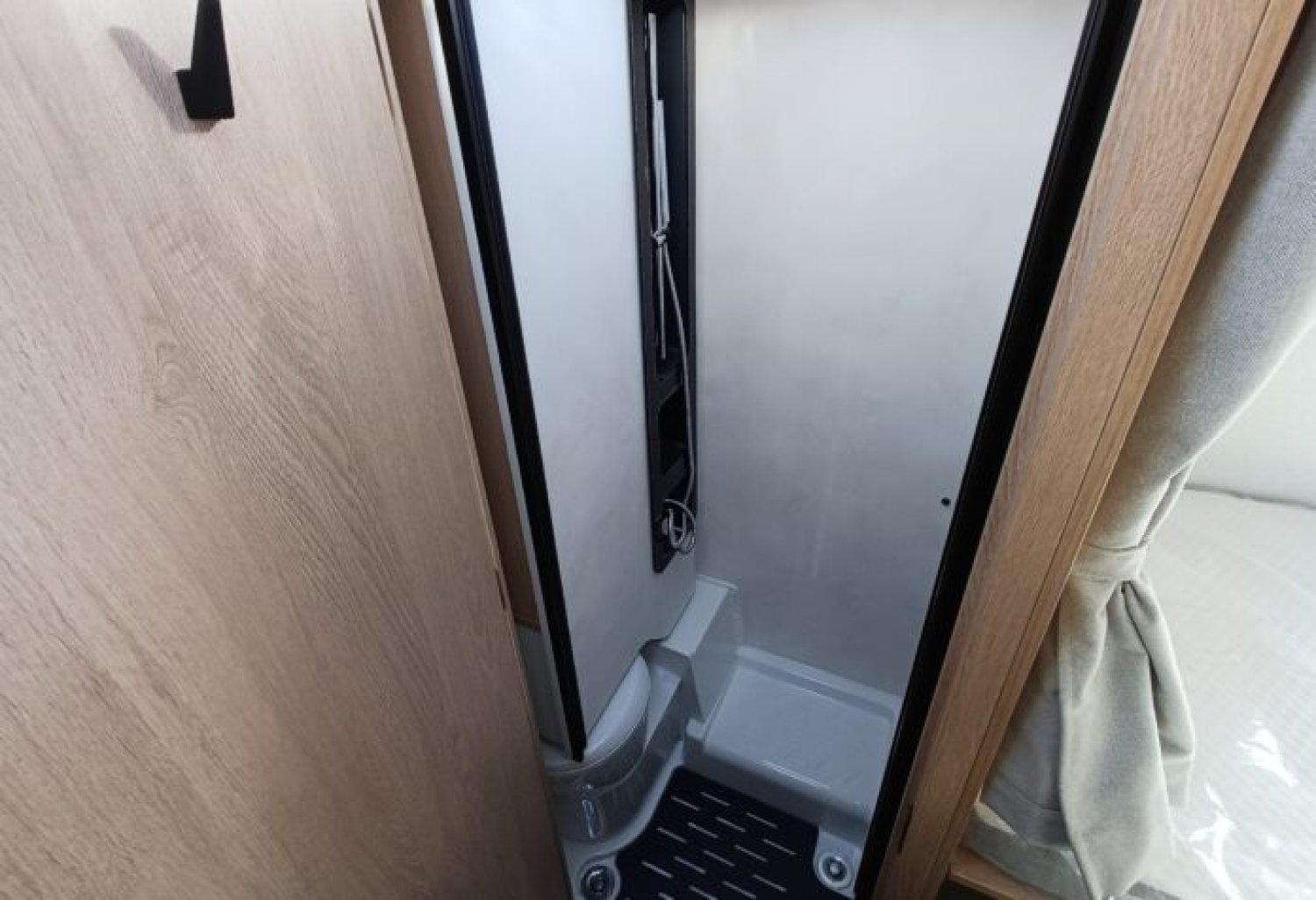 Soit : éclairage, prise 230V et rails en soute, douchette, store banne, caillebotis, inverseur automatique, crash sensor, réservoir eaux usées hors-gel, poubelle intégrée et porte-serviette