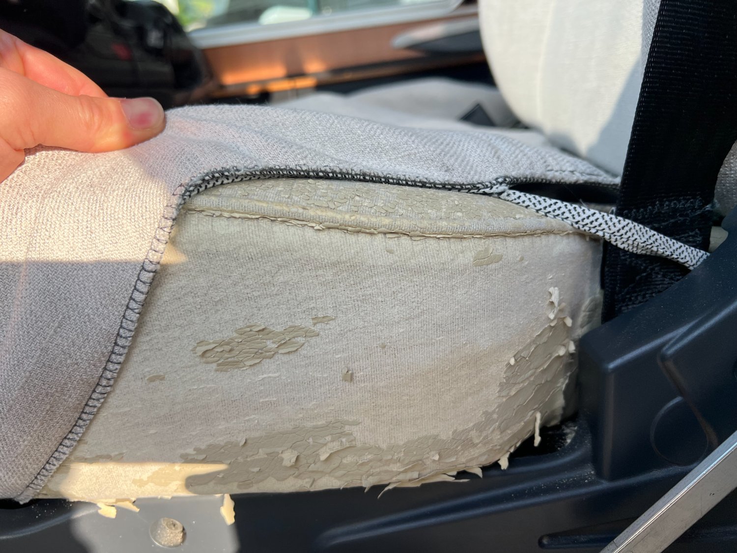 -Le simili cuir situé sous les housses des sièges conducteur et passager présente des traces d’écaillement.