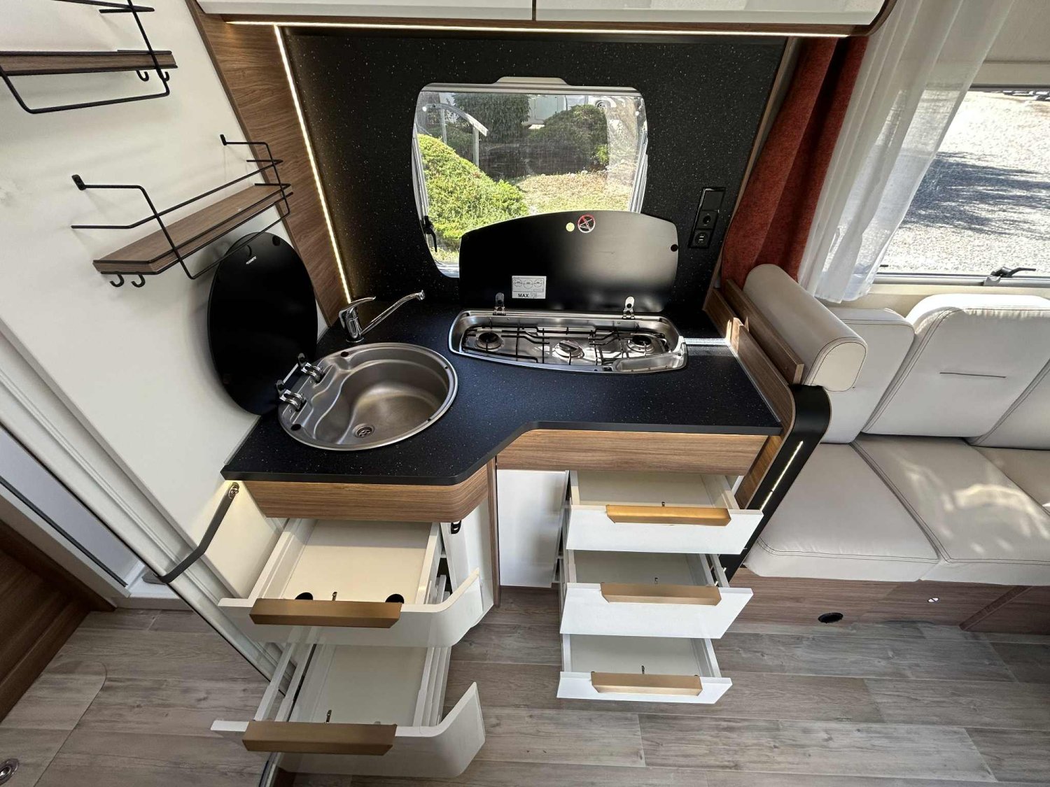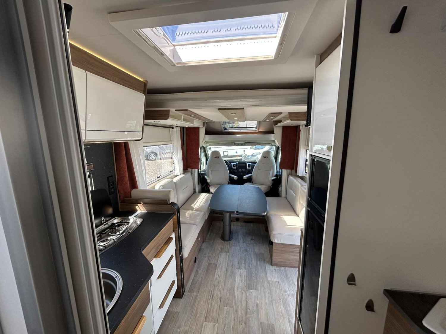Ce profilé compact de 6,99 m a été conçu pour répondre aux attentes des camping-caristes recherchant de vastes espaces de vie. Ils apprécieront l’utilisation optimisée du véhicule, notamment grâce aux dimensions généreuses du salon et du lit, à une cuisine spacieuse équipée d’un réfrigérateur de grande capacité, à un dressing fonctionnel et à une soute volumineuse, le tout pensé pour un aménagement des plus ergonomiques.