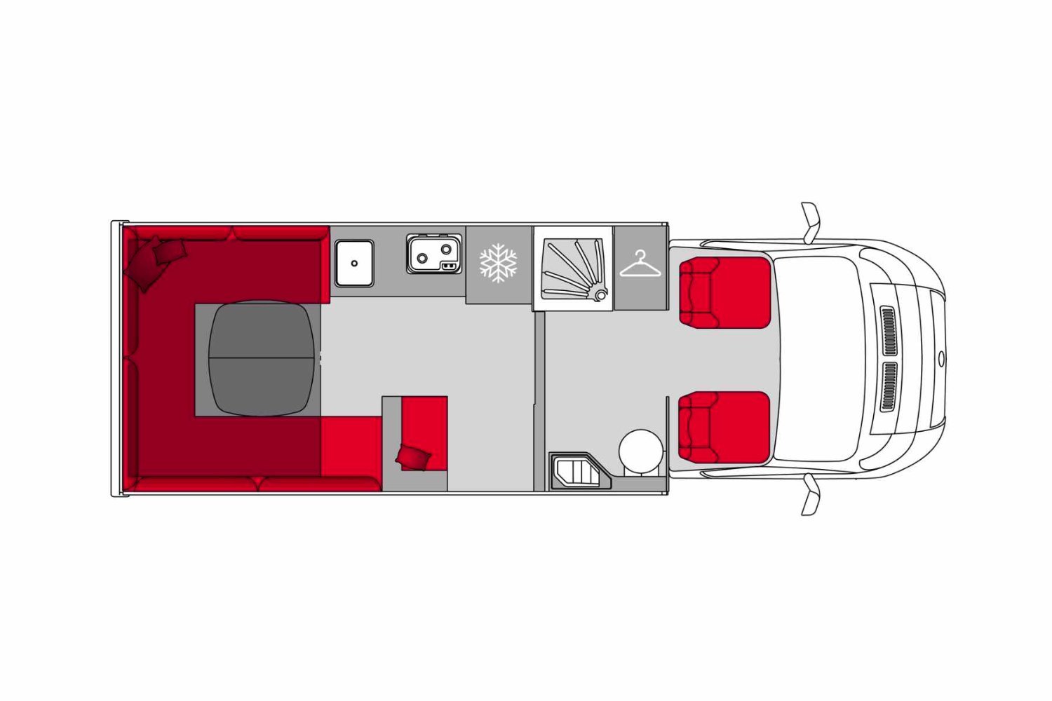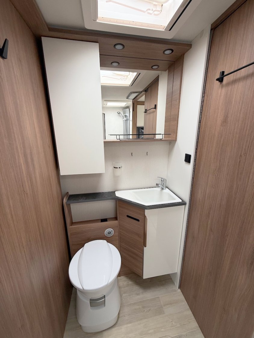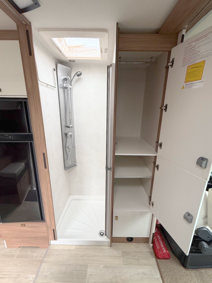 La salle d’eau occupe l’avant du véhicule : le cabinet de toilette, avec w.c. à cassette, est derrière le siège passager, la douche étant de l’autre côté.