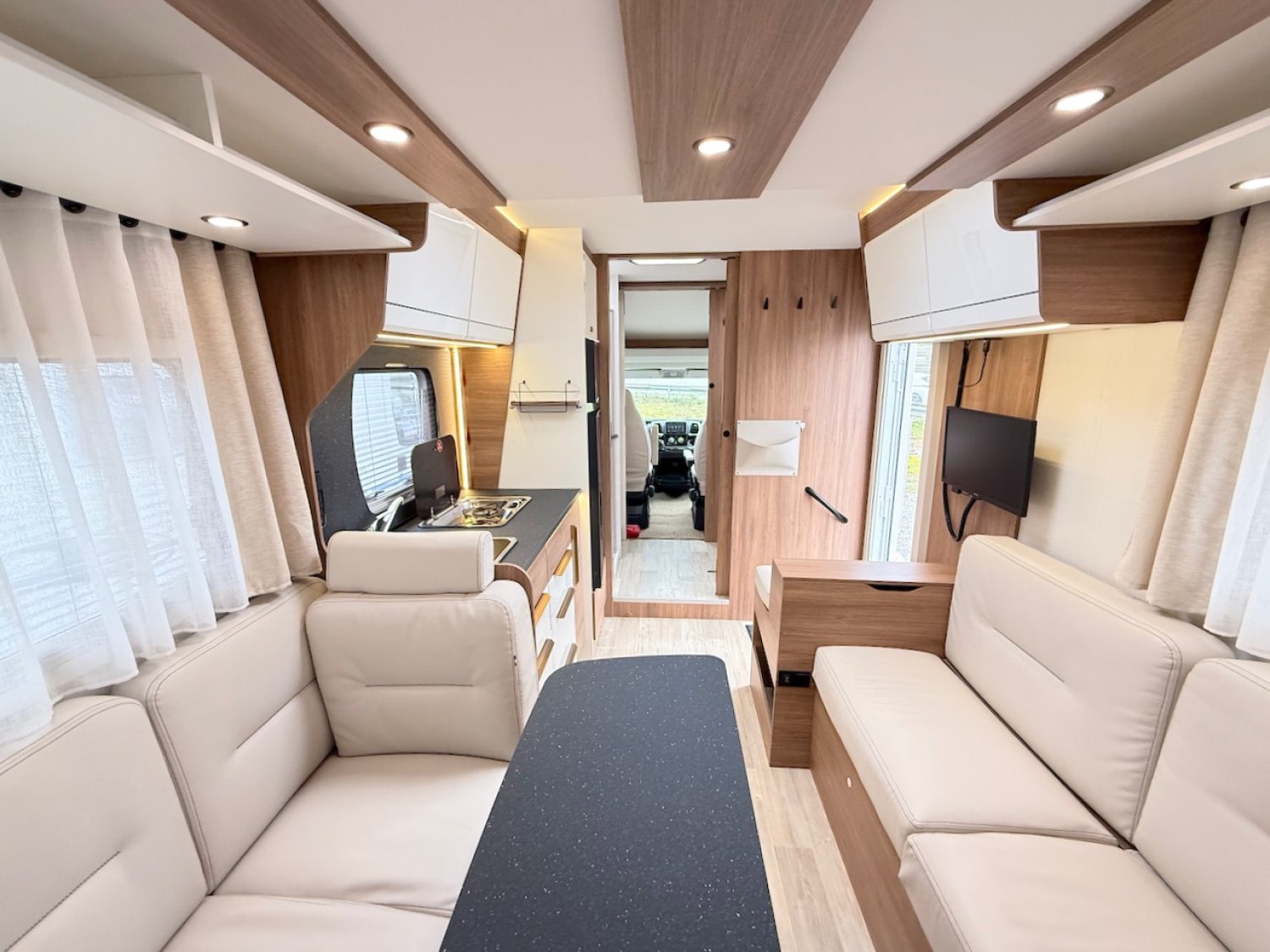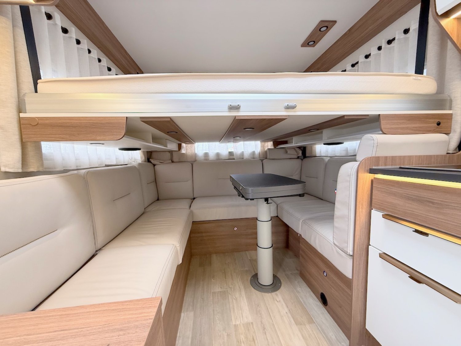 le salon occupe l’arrière du véhicule, avec un grand salon en U pouvant accueillir jusqu’à 7 convives.