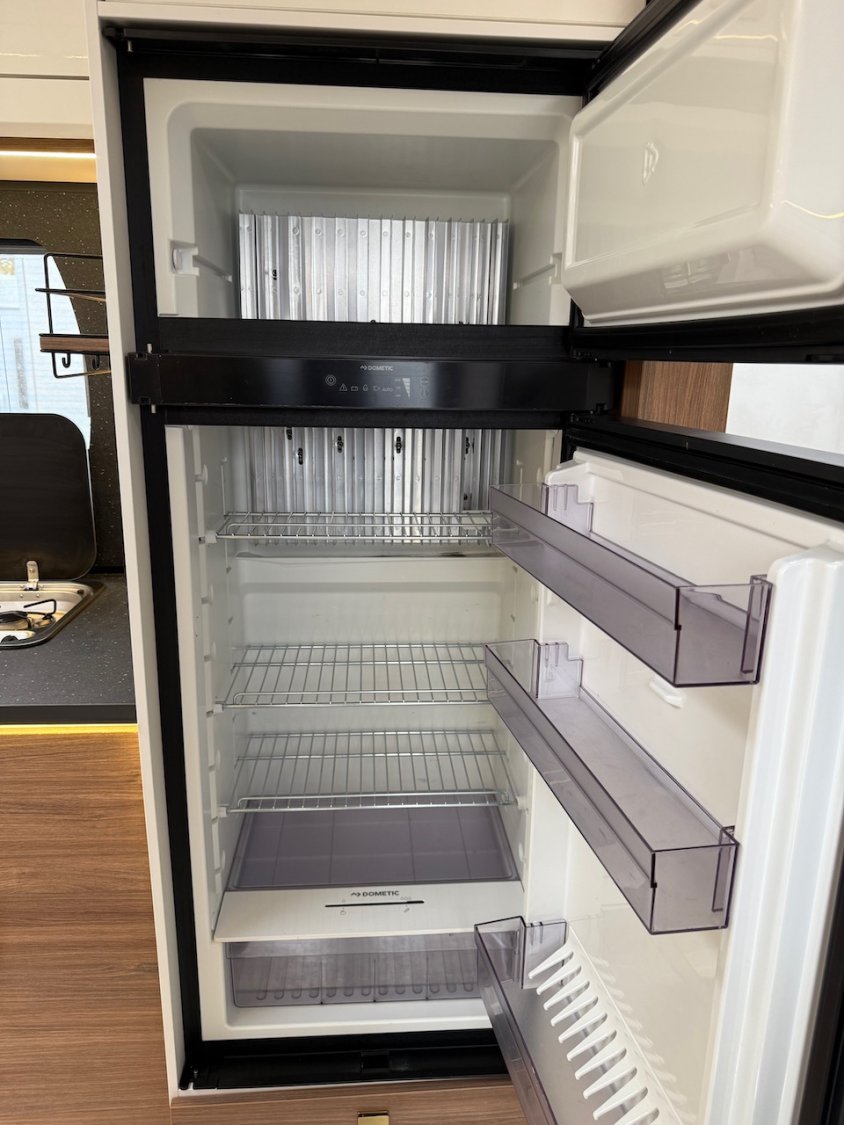La cuisine présente de nombreux rangements, un grand réfrigérateur trimixte de 153 L, avec congélateur indépendant.