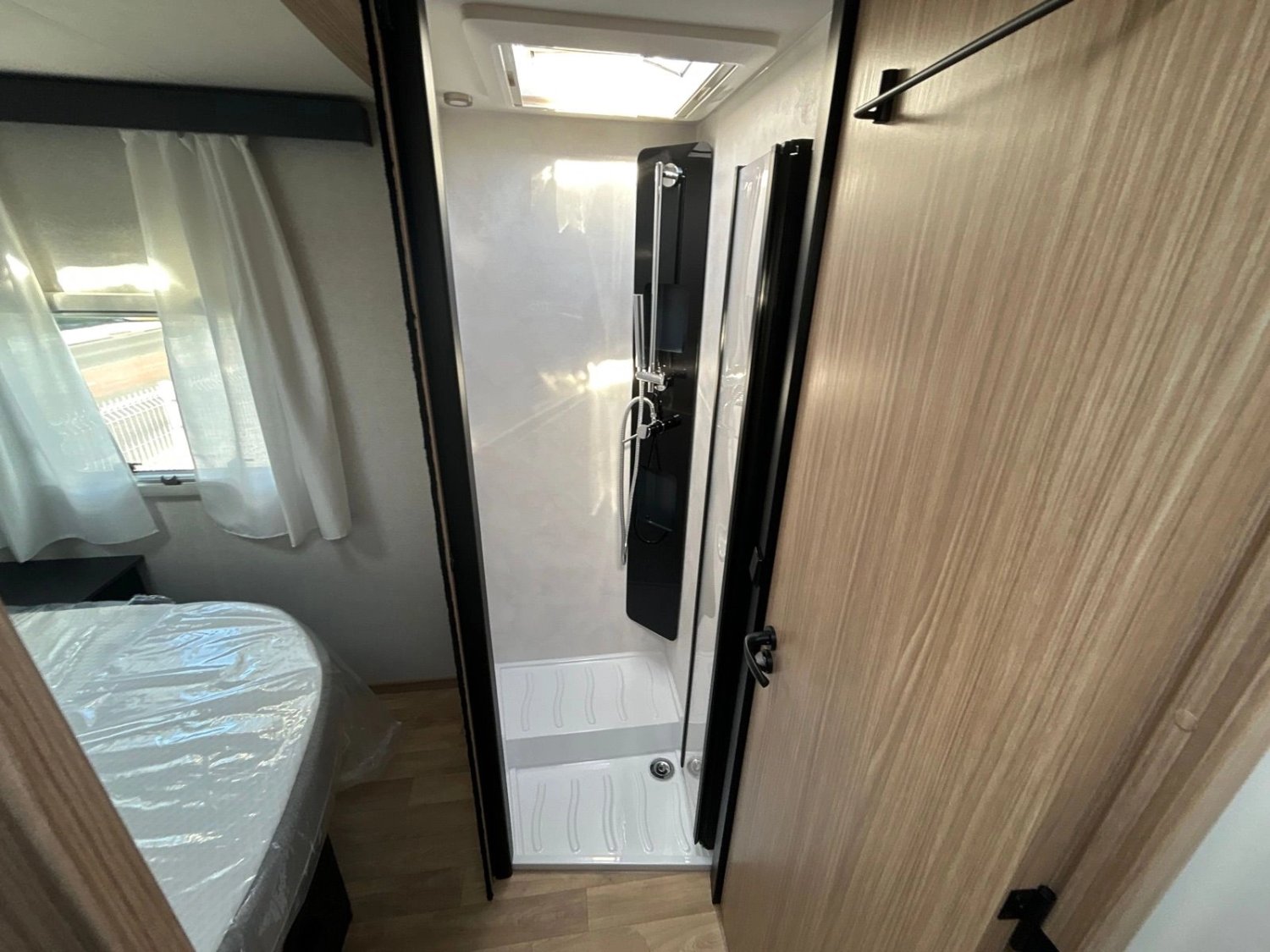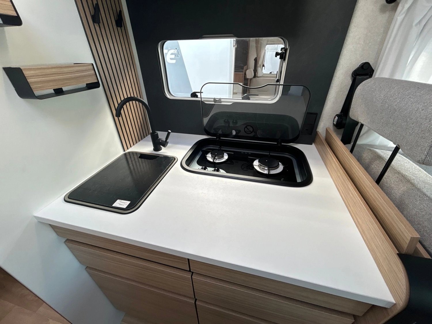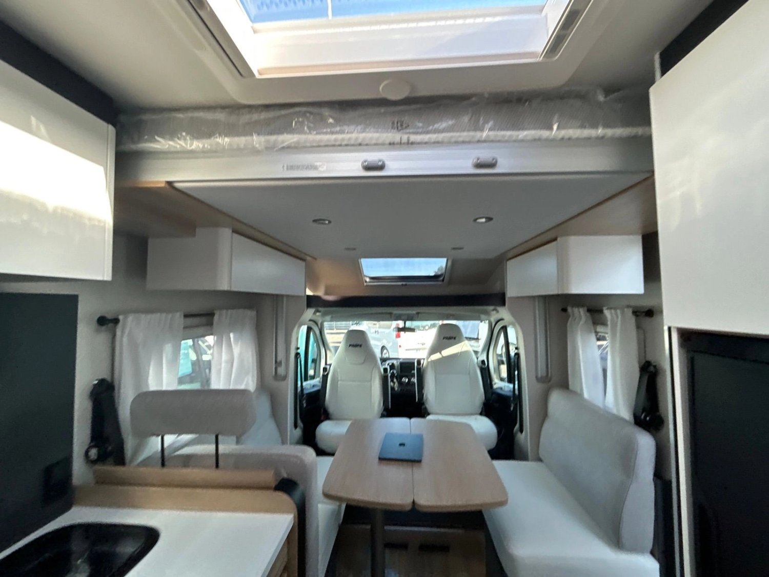 • Motorisation 2,2 L - 140 ch - boîte automatique. • Châssis Fiat 3,5 T. • Cabine noire. • PACK JANTES : jantes alliage 16”, volant en simili, aérateurs gris aluminium. • PACK MÉDIA 7” : autoradio 7” Pioneer® , DAB, AppleCar / Android Auto, caméra de recul, haut-parleurs dans la cabine et la cellule. • Batterie lithium 200 Ah et 2 panneaux solaires 100 W monocristallin TOPCon haute performance. • Booster pour une charge rapide de la batterie • Chauffage hybride Truma® D 6E (Diesel / 230 V). • Réfrigérateur à compression Thedford® 150 ou 158 l, selon modèle. • Store banne. • Tiroir bas de caisse. • Douchette eau froide/chaude dans la soute arrière. • Lit pavillon électrique avec sommier à lattes. • Sellerie bi-ton et bi-matière simili et tissu «Sand»