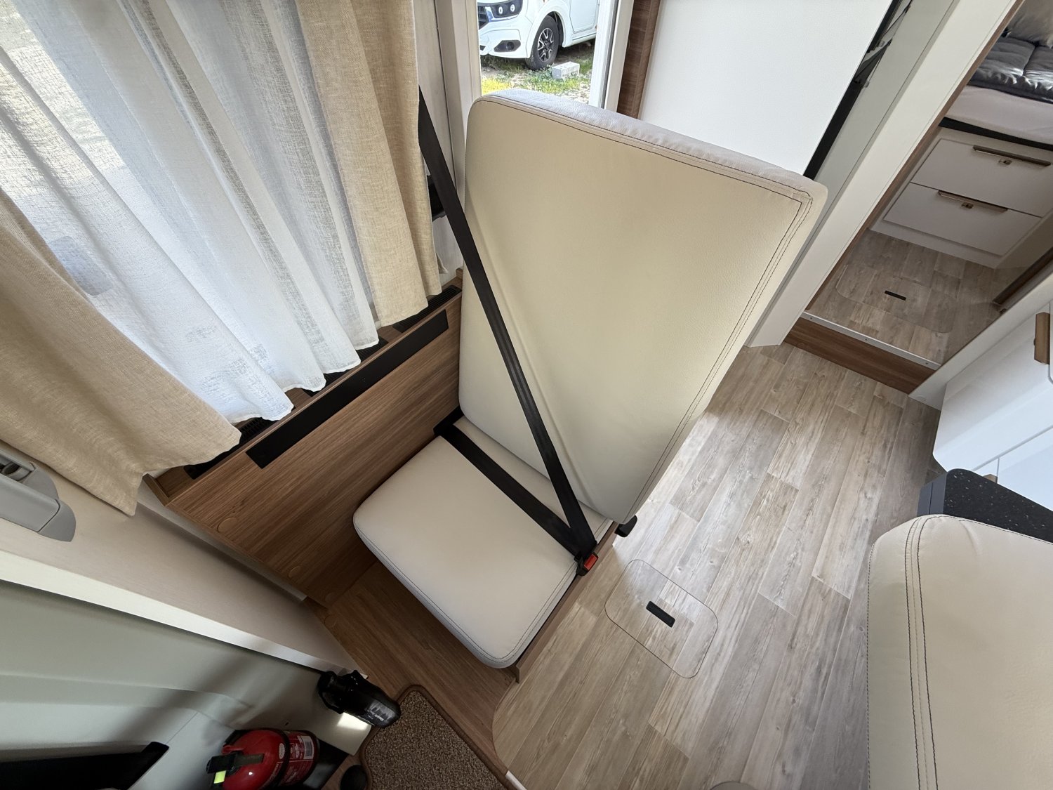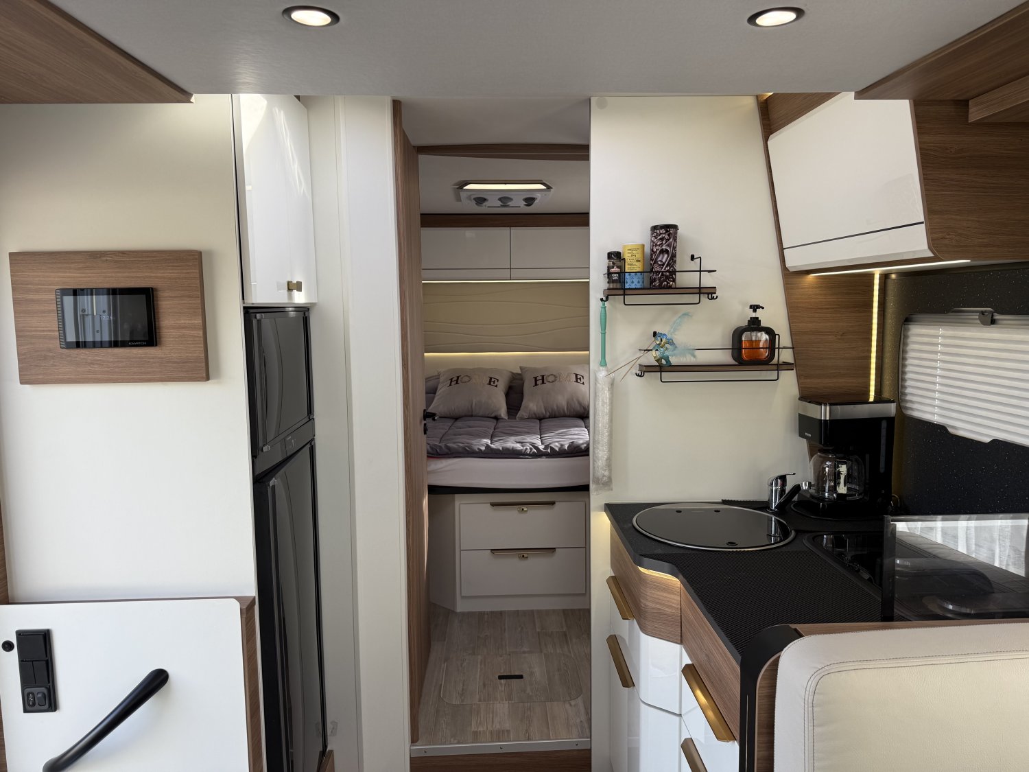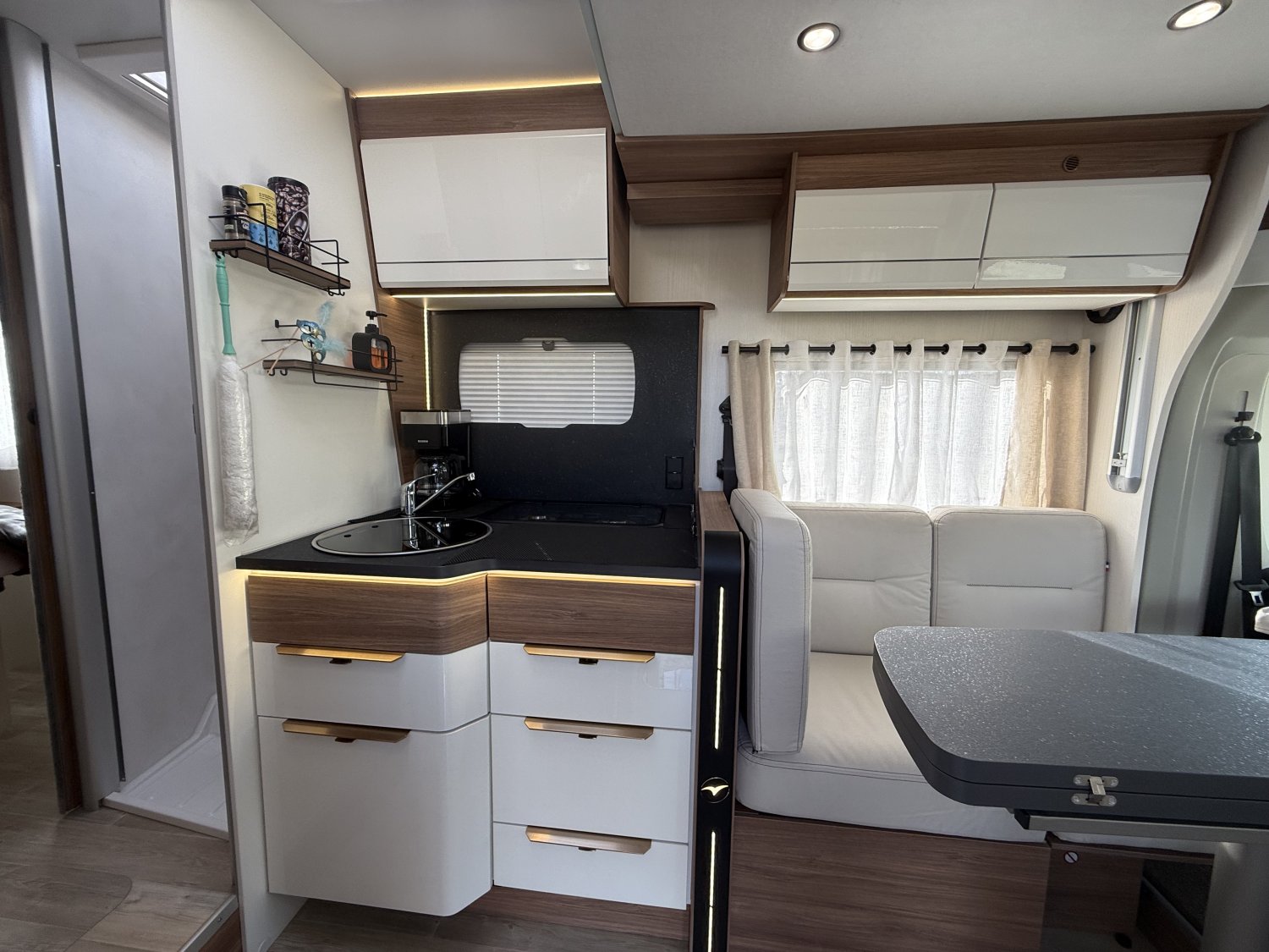 À l’intérieur, l’ambiance est lumineuse et chaleureuse. Le salon face-face accueille confortablement jusqu’à cinq personnes dans un véritable esprit « pièce de vie », sublimé par de larges baies vitrées et un grand lanterneau panoramique. La cuisine fonctionnelle dispose d’un grand plan de travail, de tiroirs à fermeture amortie, d’un casserolier et d’un réfrigérateur de 150 L à gestion automatique, permettant de cuisiner au quotidien avec un vrai confort.