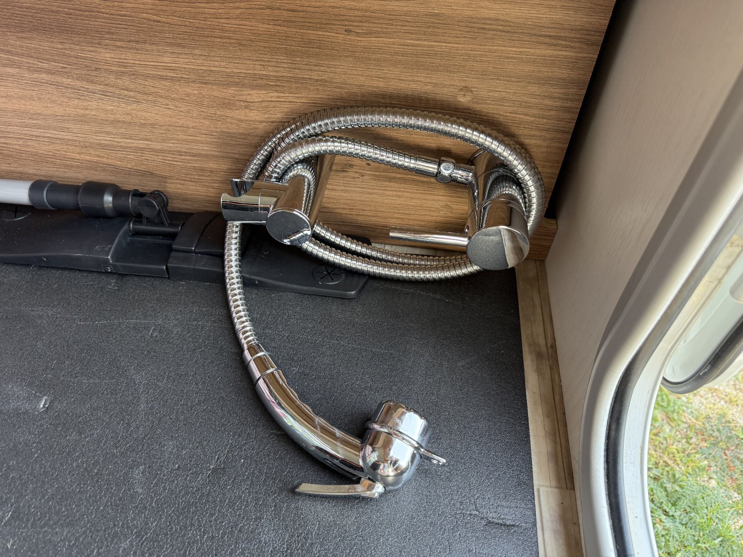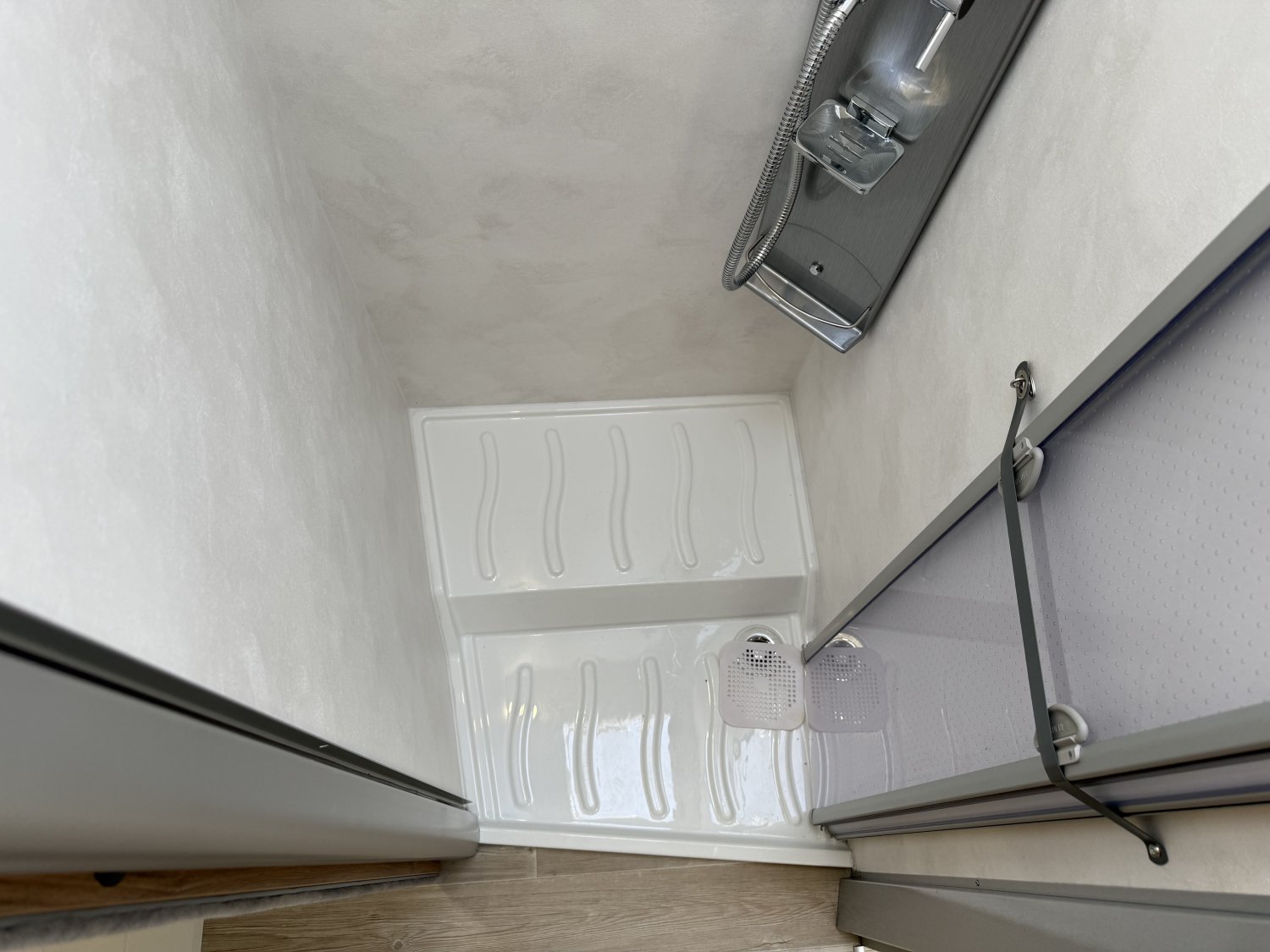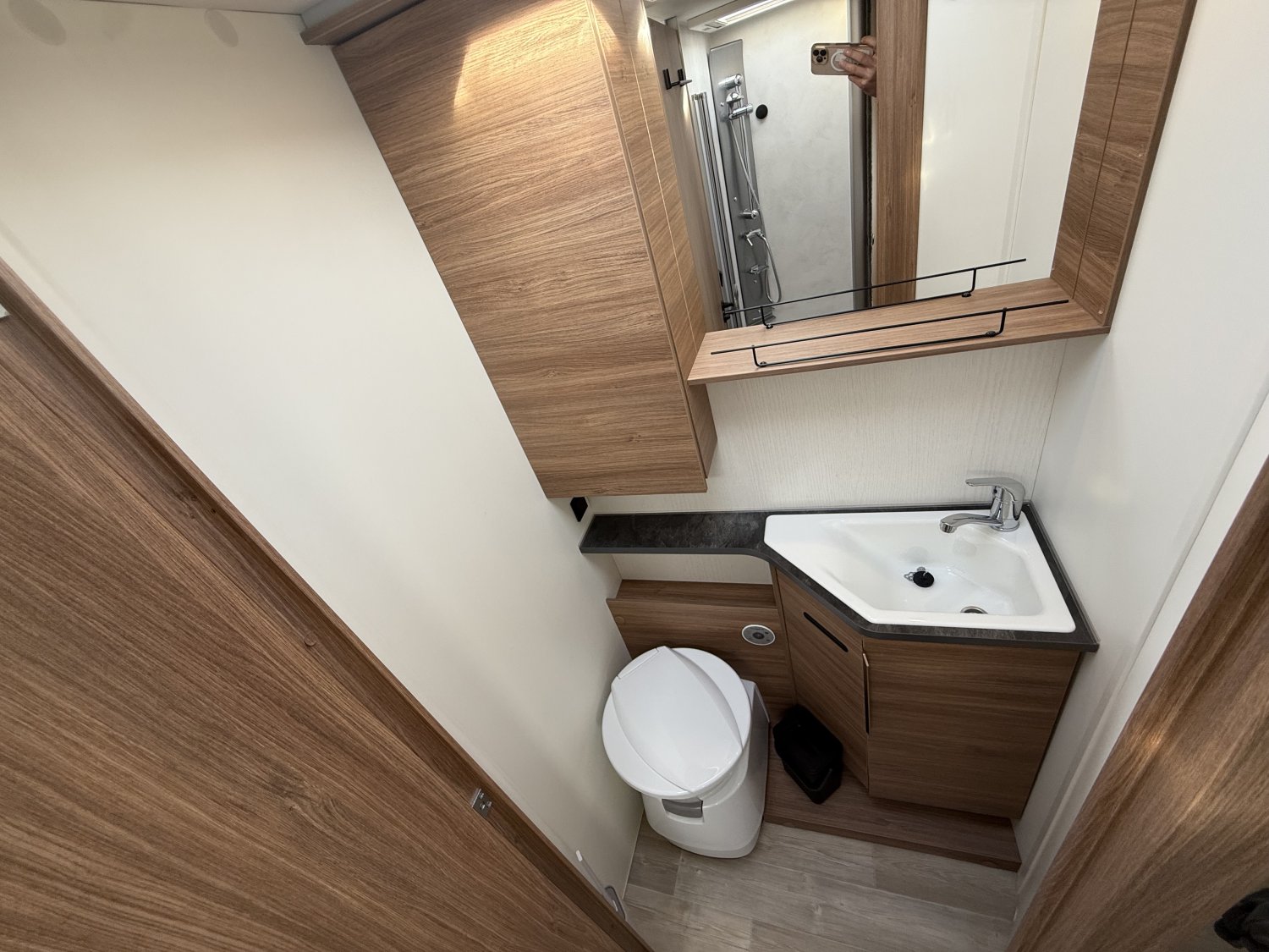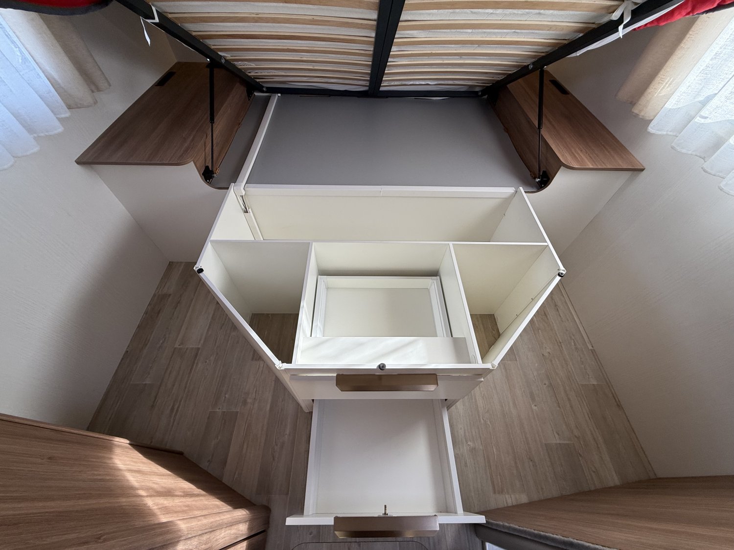 À l’intérieur, l’ambiance est lumineuse et chaleureuse. Le salon face-face accueille confortablement jusqu’à cinq personnes dans un véritable esprit « pièce de vie », sublimé par de larges baies vitrées et un grand lanterneau panoramique. La cuisine fonctionnelle dispose d’un grand plan de travail, de tiroirs à fermeture amortie, d’un casserolier et d’un réfrigérateur de 150 L à gestion automatique, permettant de cuisiner au quotidien avec un vrai confort.