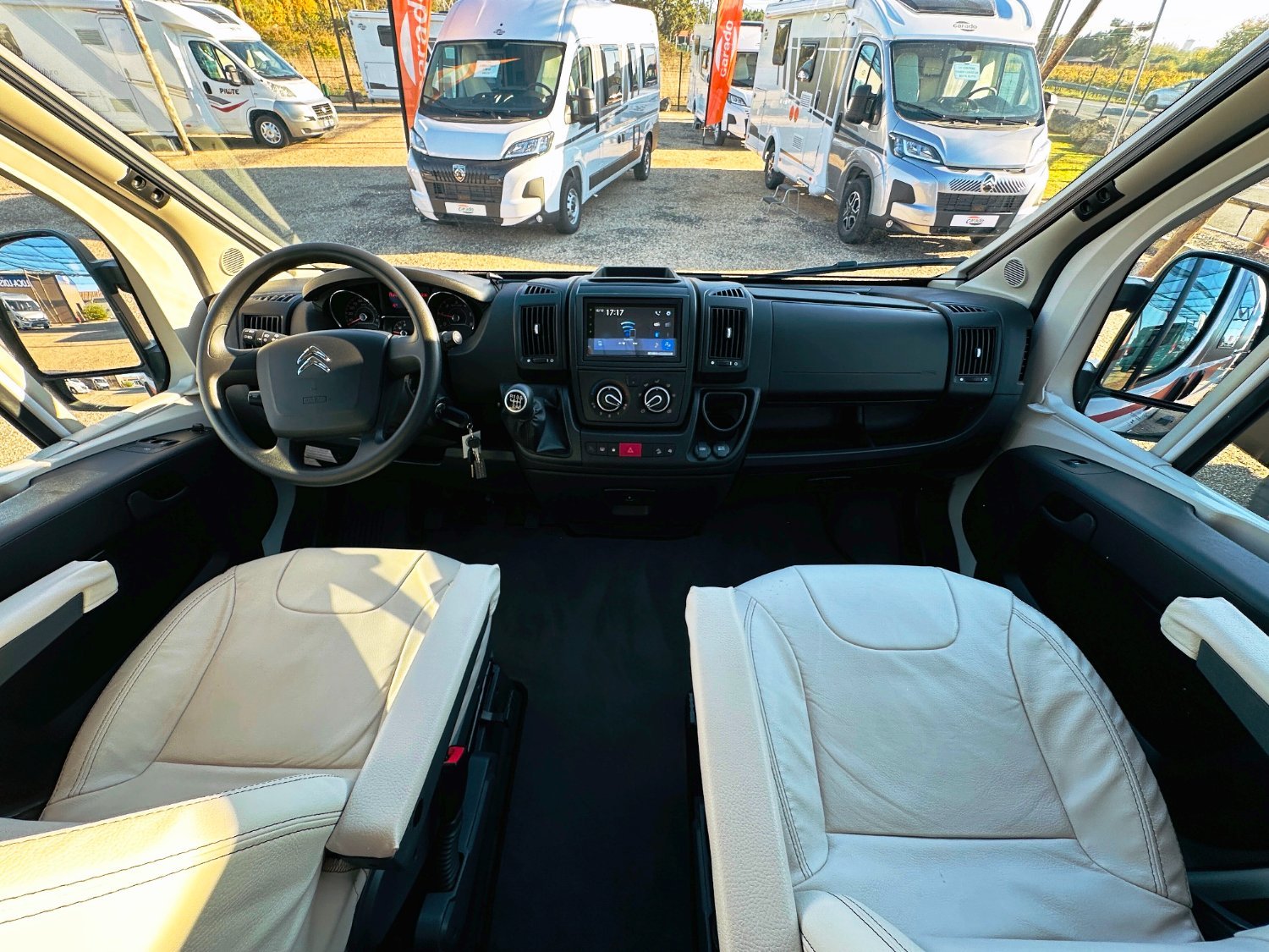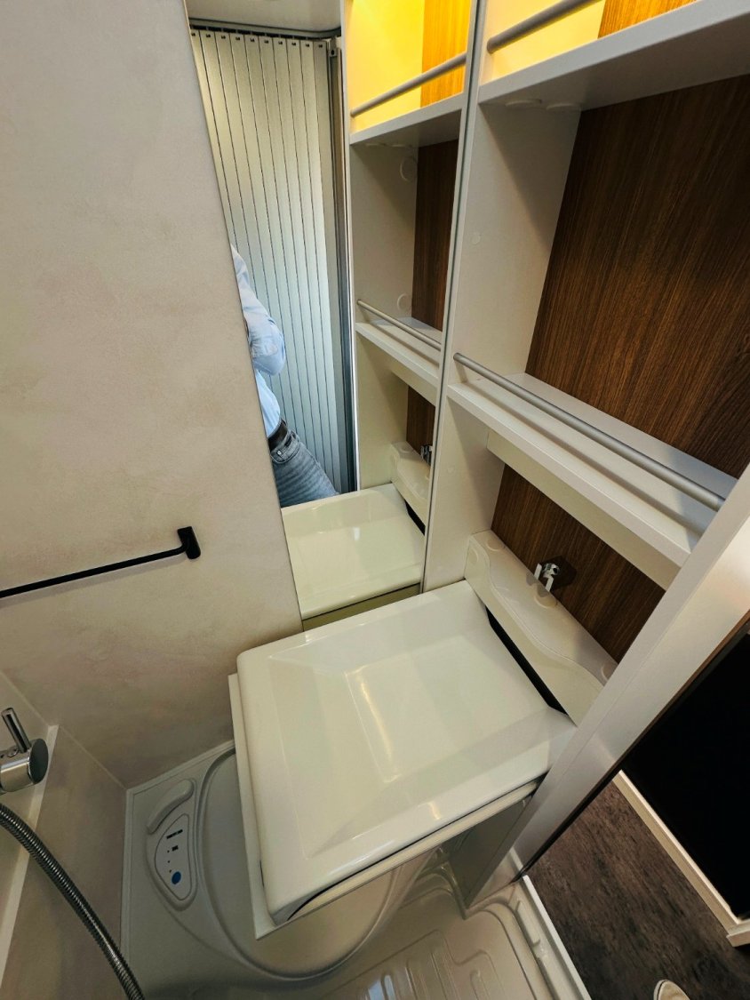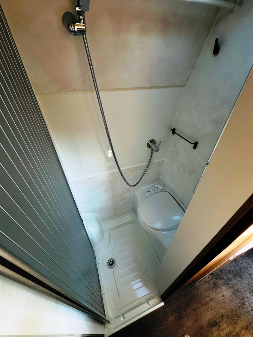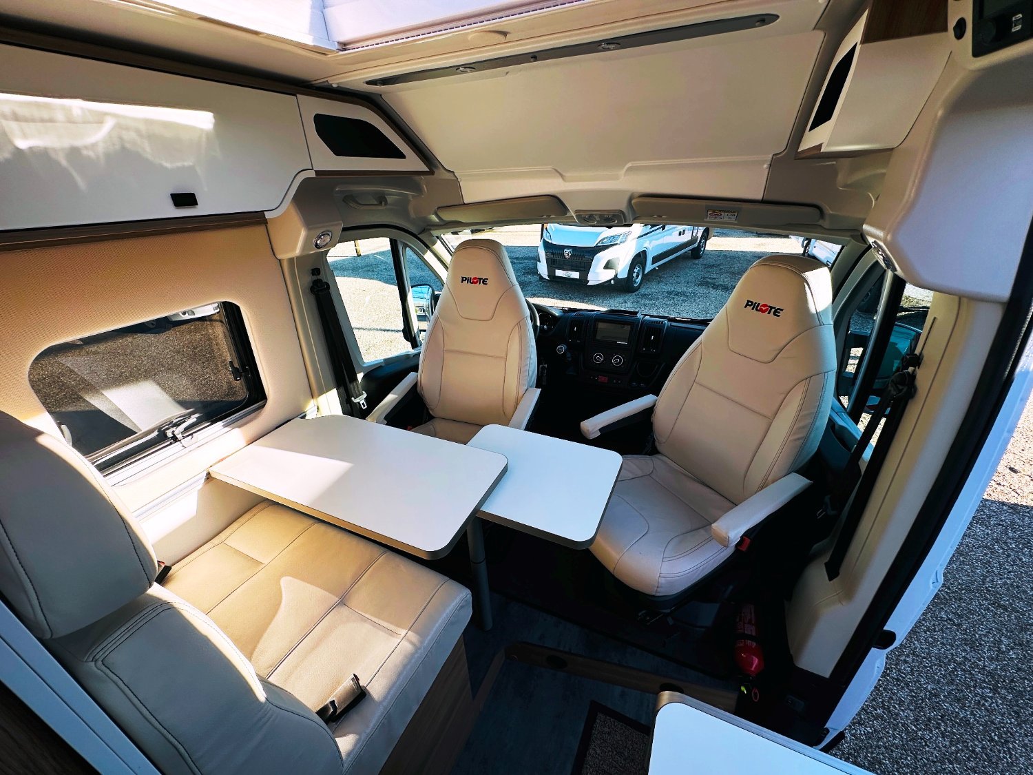 Fourgon Pilote compact (5.41 M), lit permanent arrière transversale modulable (possibilité de dégager le couloir), salle de bain avec douche intégrée et évier amovible, salon avant avec sièges pivotant convertible en un couchage d’appoint, cuisine droite équipée de nombreux rangements, d’un plan de travail rabattable et d’un frigo par compression.