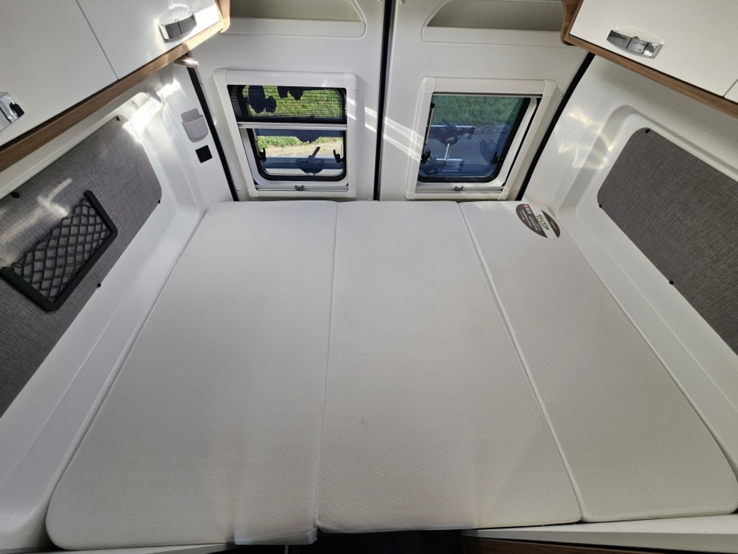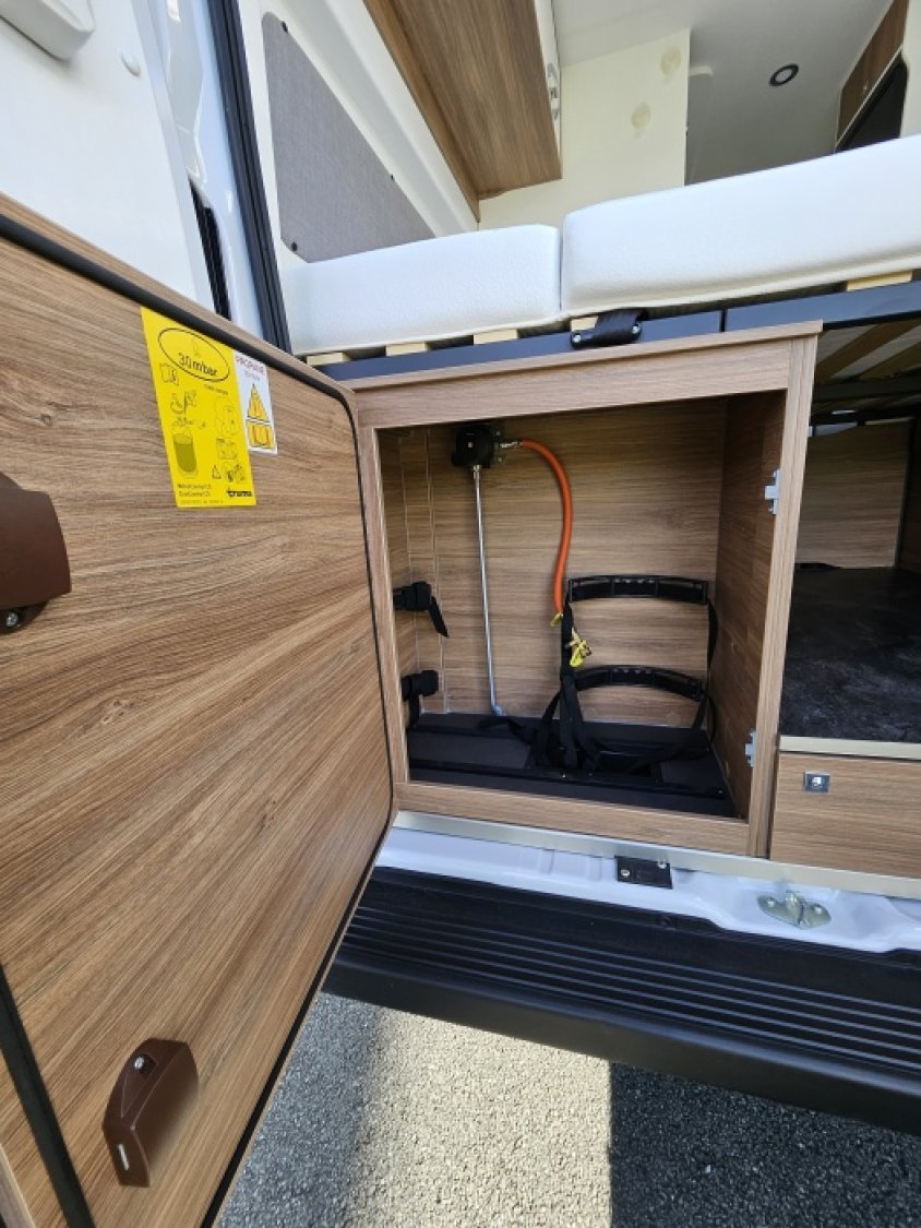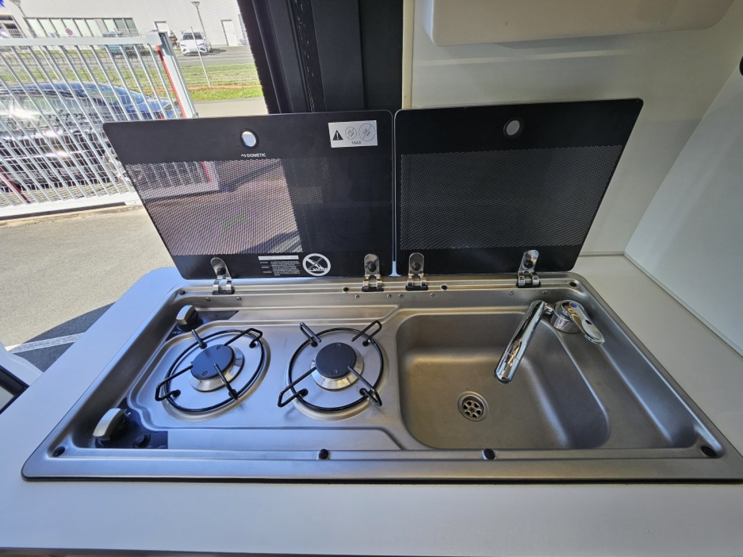Cuisine : avec réchaud 2 feux - Réfrigérateur 126L + Freezer à compression - Couchage : Lit transversal (135 x 180 cm) – Toilette : WC à cassette Thetford amovible – douche - Banquette / siège en face à face avec table centrale - Chauffage / chauffe-eau Truma Combi – store coulissant plissée de série REMIS – coffre 2 bouteilles de gaz 13kg -