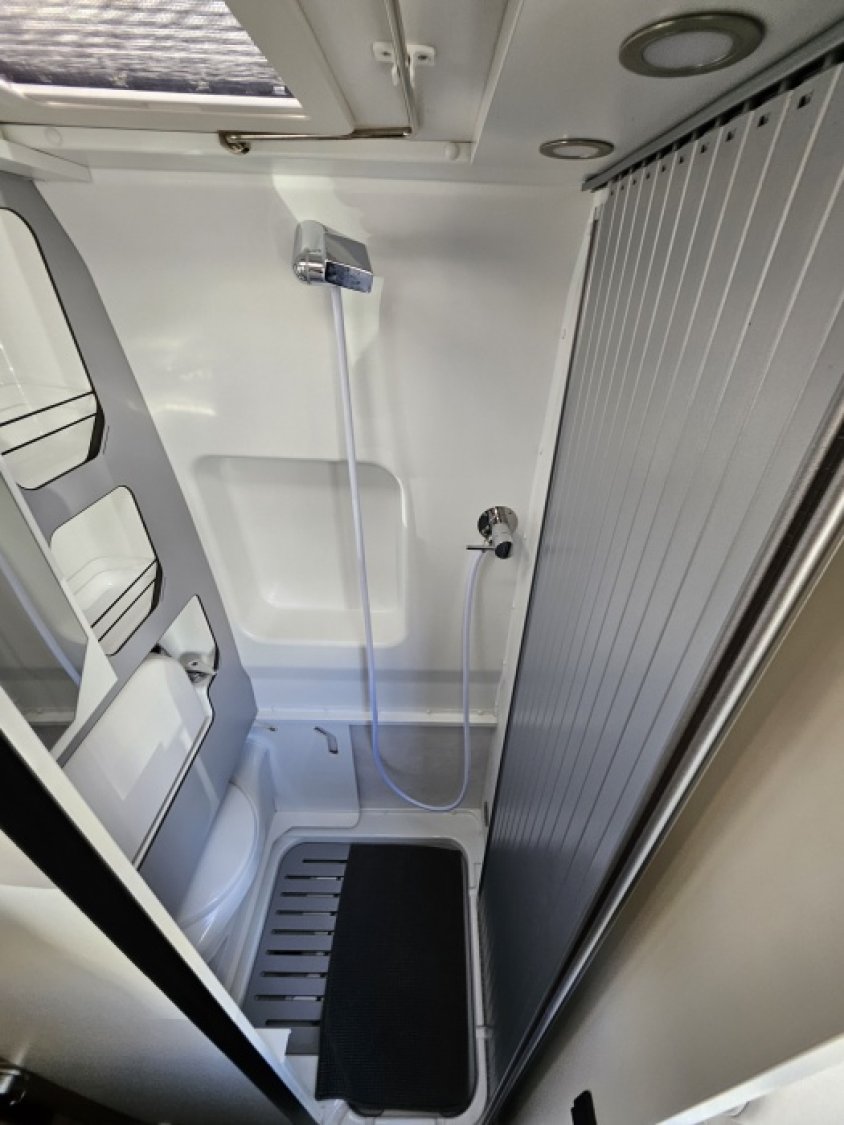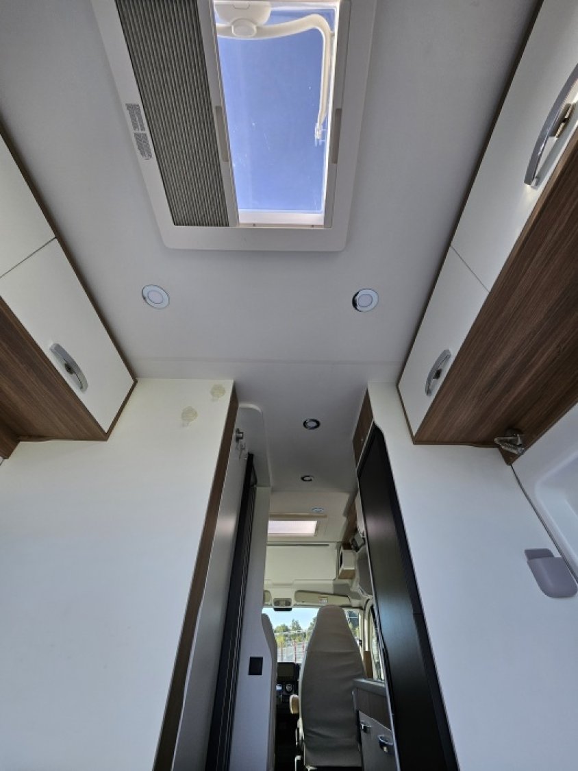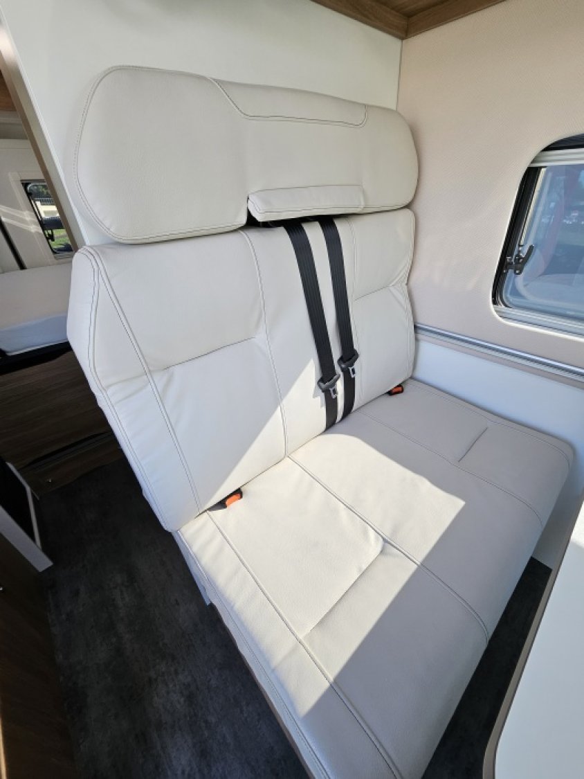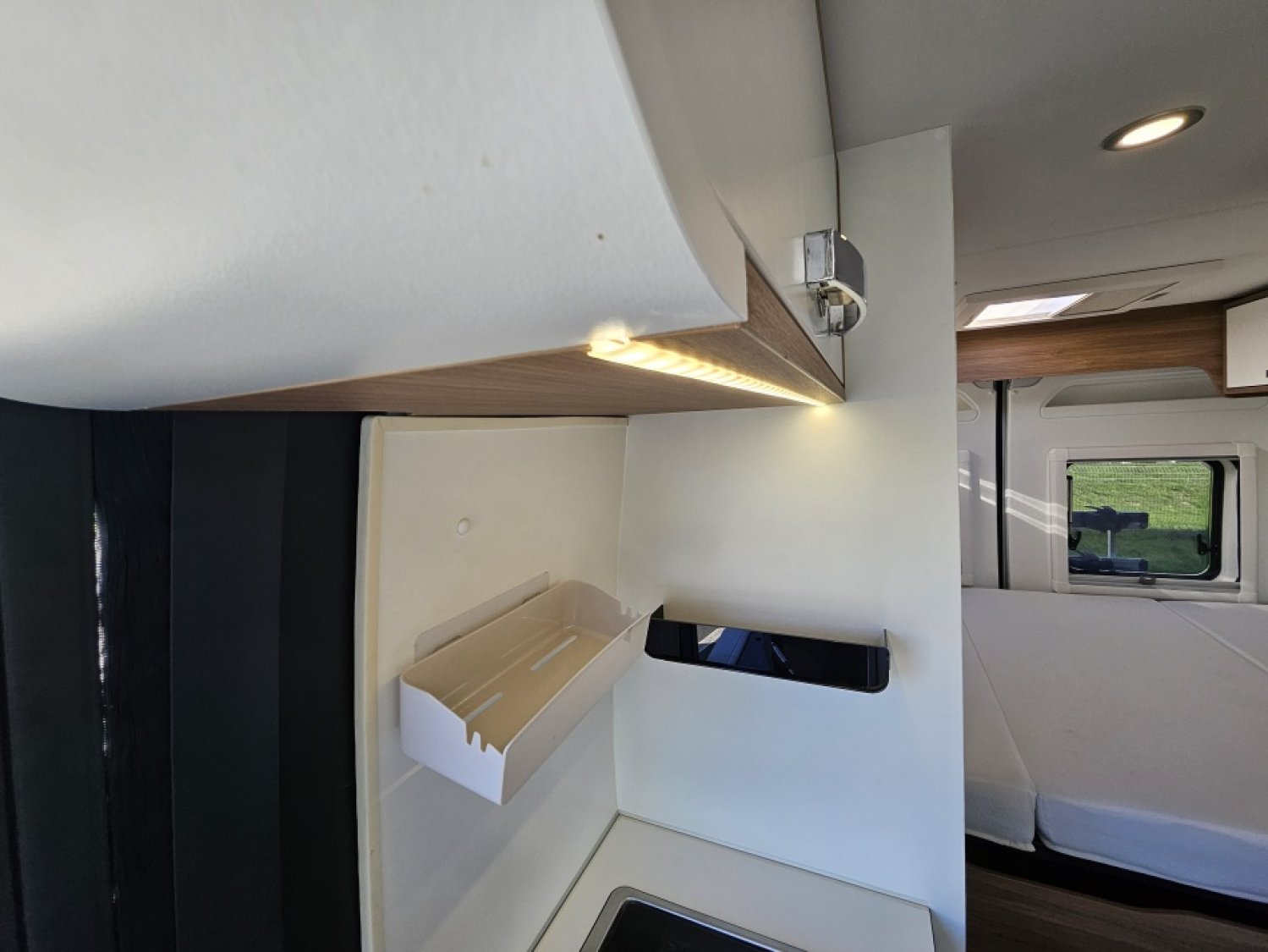 Cuisine : avec réchaud 2 feux - Réfrigérateur 126L + Freezer à compression - Couchage : Lit transversal (135 x 180 cm) – Toilette : WC à cassette Thetford amovible – douche - Banquette / siège en face à face avec table centrale - Chauffage / chauffe-eau Truma Combi – store coulissant plissée de série REMIS – coffre 2 bouteilles de gaz 13kg -