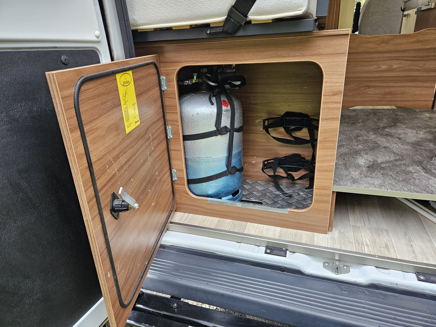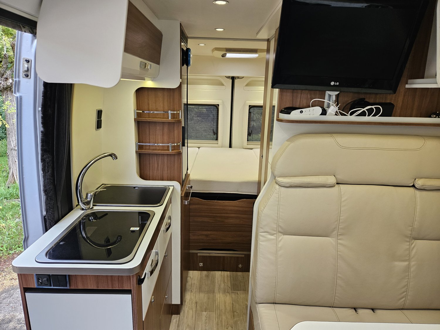 La partie cellule est très bien équipée avec un chauffage combi Truma 4, un éclairage LED, une gazinière deux feux, un réfrigérateur à compression en 12 volt avec freezer.