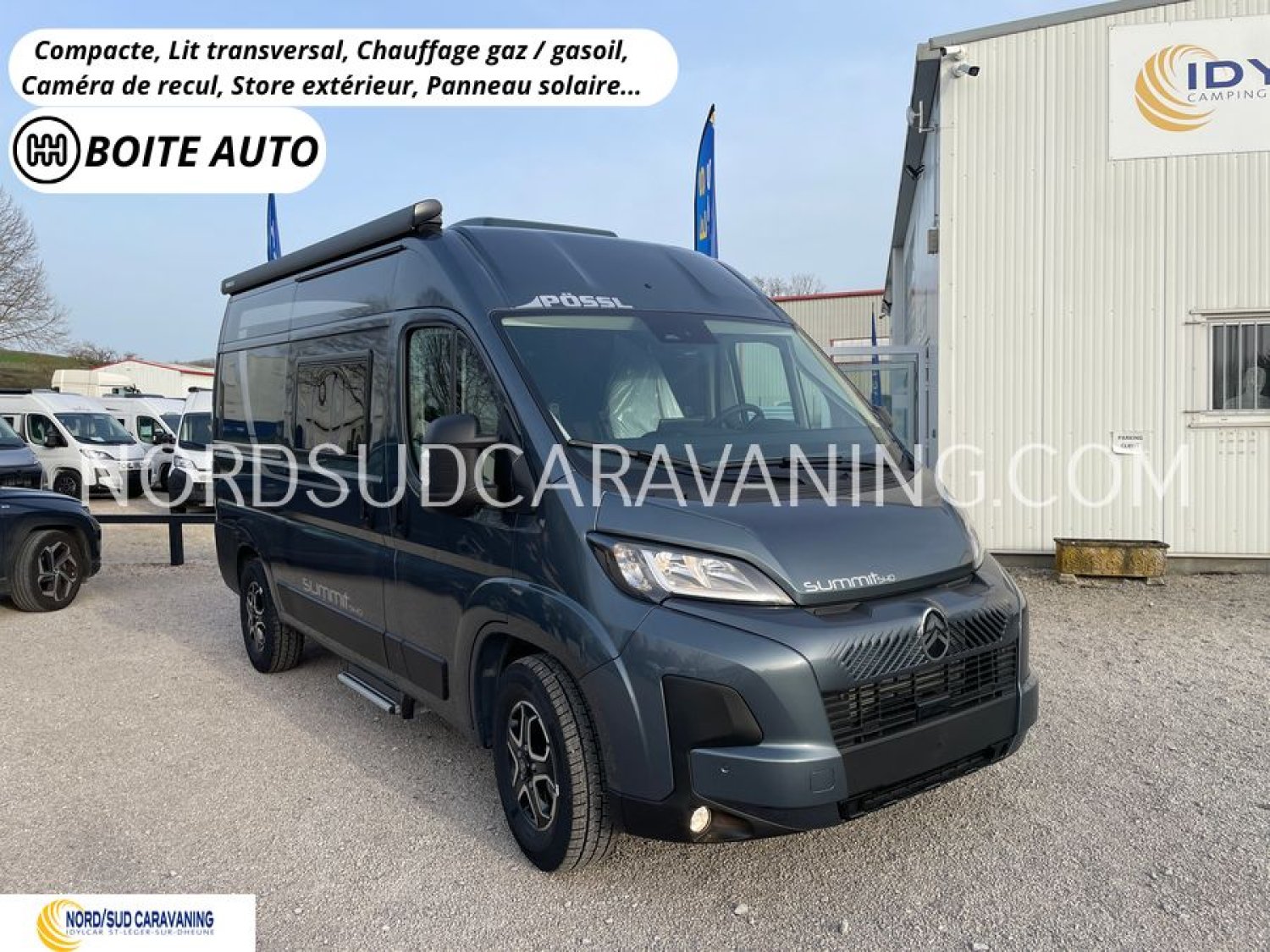 Magnifique Fourgon Compact Pössl, Boite Automatique, Lit transversal, Caméra de recul, Chauffage gaz / gasoil, Store extérieur, Panneau solaire…