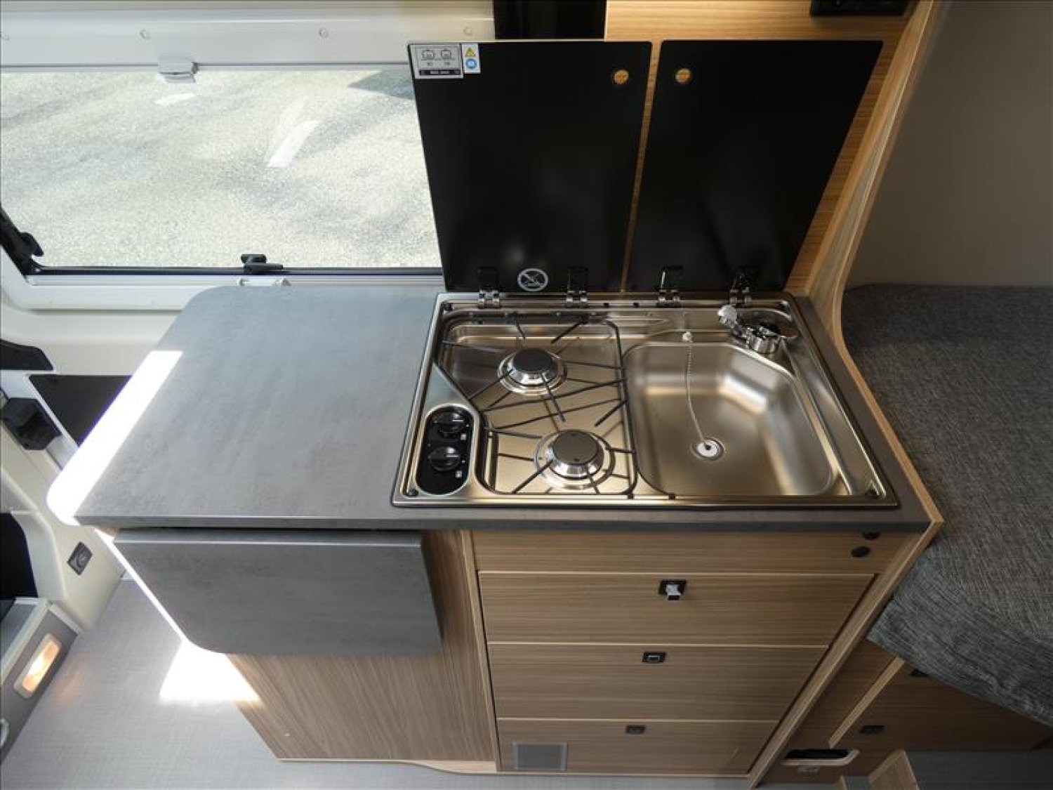 Haut de gamme, chez la déjà très qualitative marque allemande PÖSSL, le SUMMIT 600 SHINE L vous propose un aménagement de fourgon en lits jumeaux sur 5.99 m seulement. Le tout, agrémenter d'une douche vario très pratique.