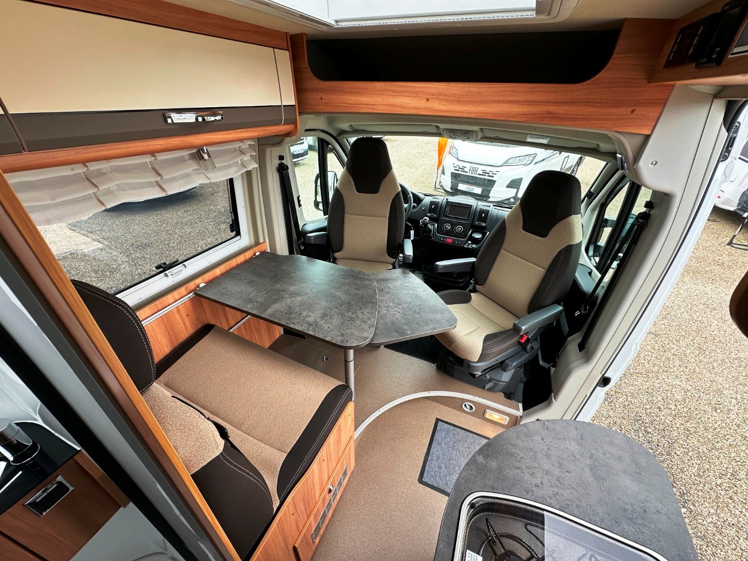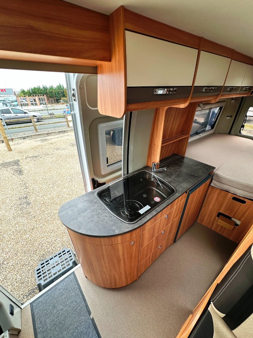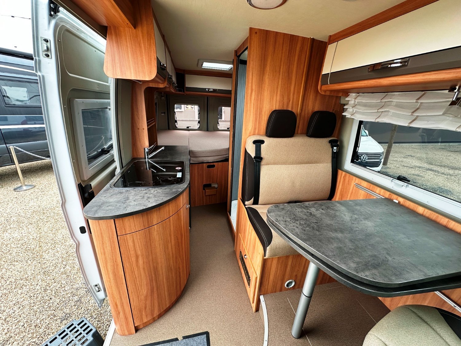Fourgon Possl (5.99 M), lit transversal (possibilité de dégager le couloir), salle de bain vario convertible en vaste douche, salon avant avec sièges pivotant, table centrale, cuisine droite équipée de nombreux rangements et d’un grand frigo par compression de 90L.