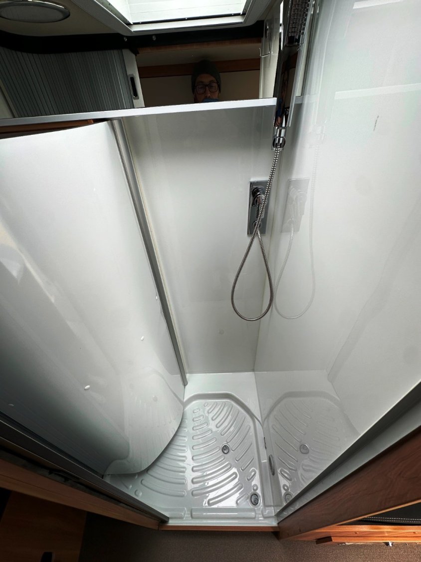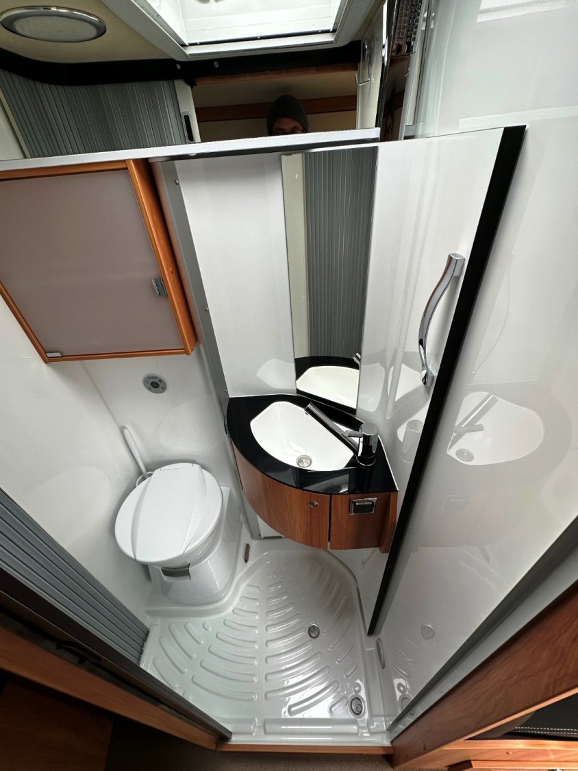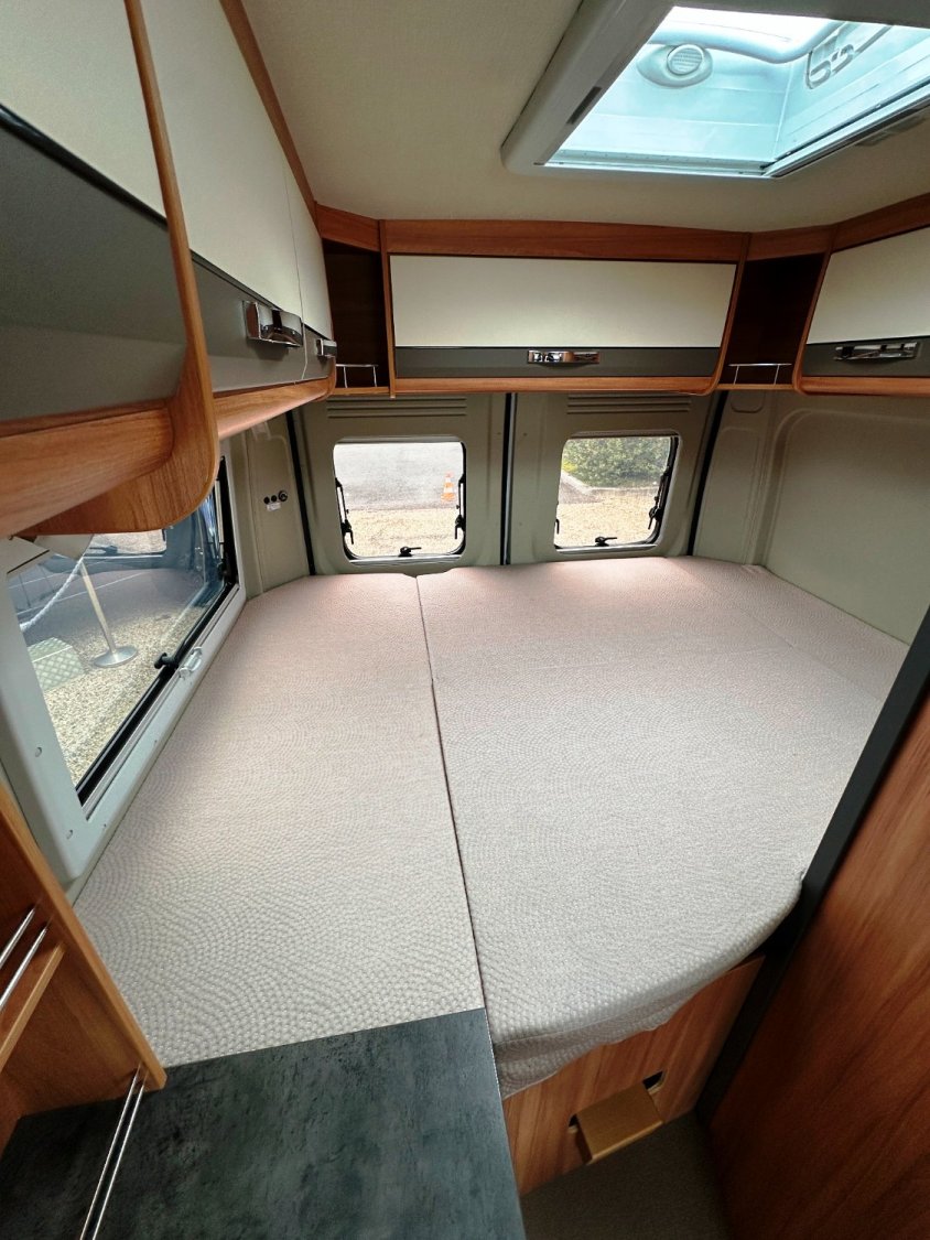 Fourgon Possl (5.99 M), lit transversal (possibilité de dégager le couloir), salle de bain vario convertible en vaste douche, salon avant avec sièges pivotant, table centrale, cuisine droite équipée de nombreux rangements et d’un grand frigo par compression de 90L.