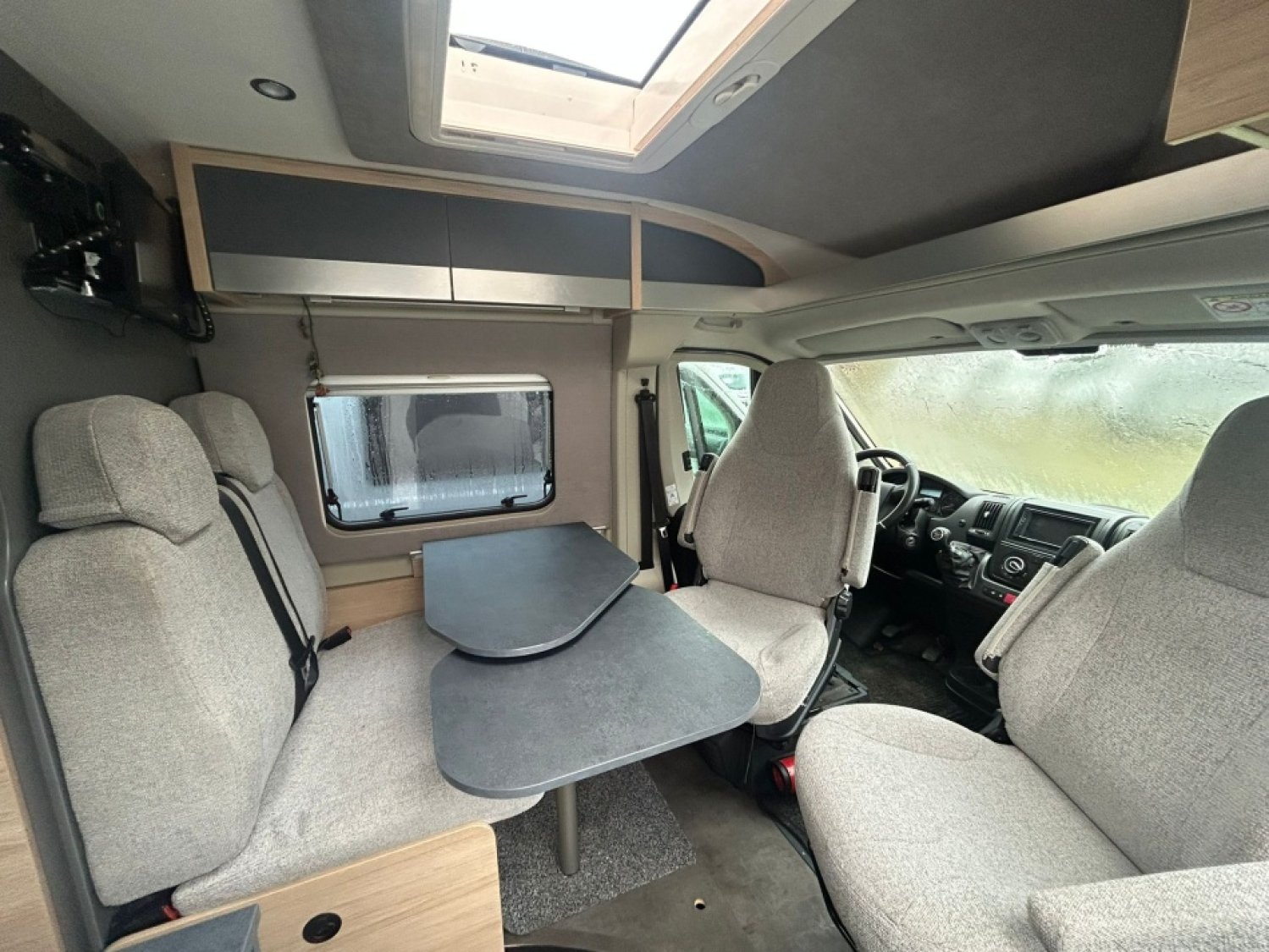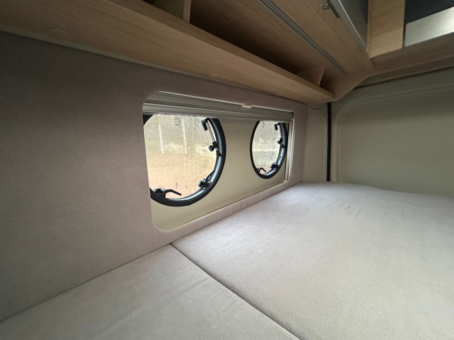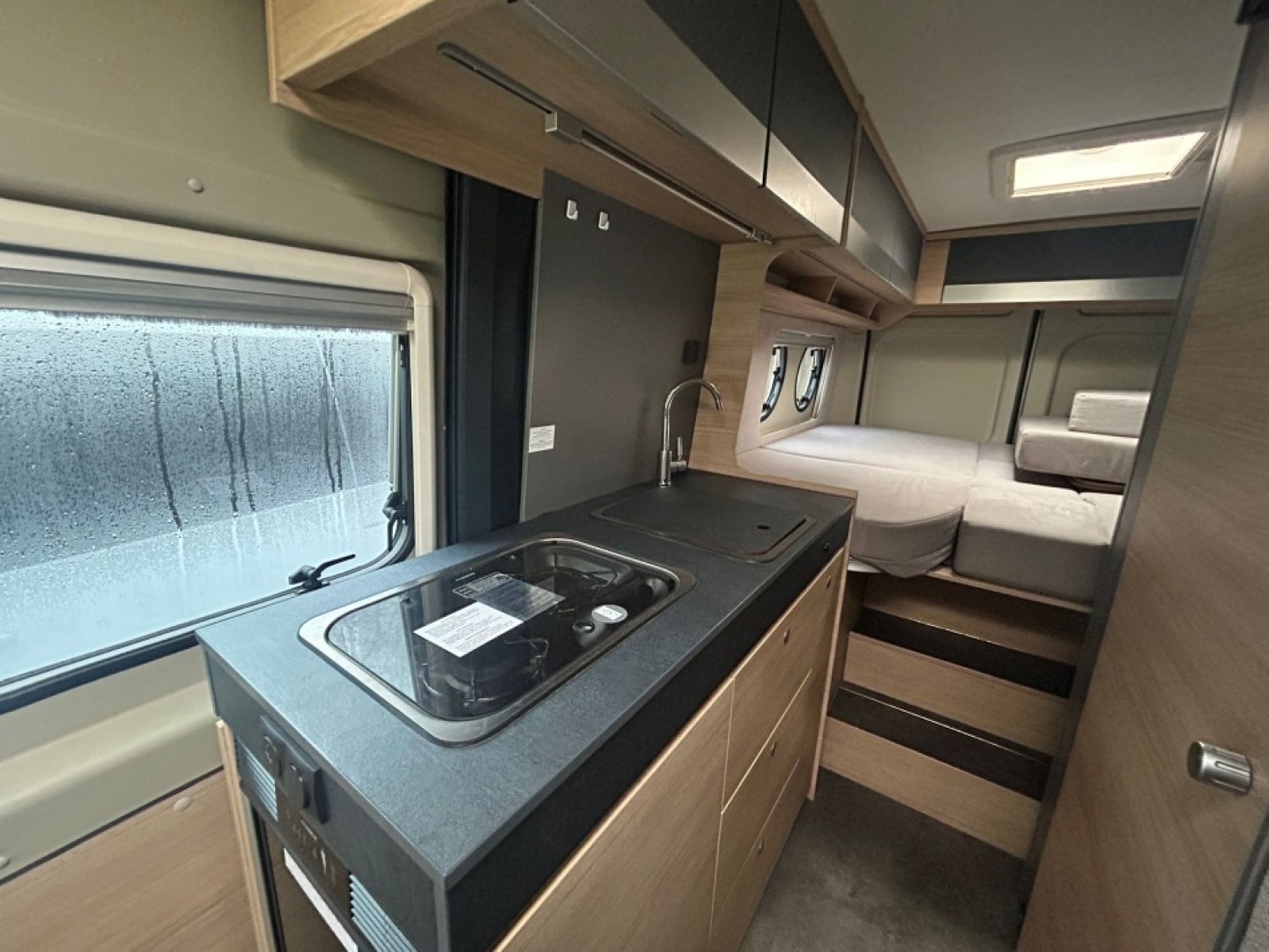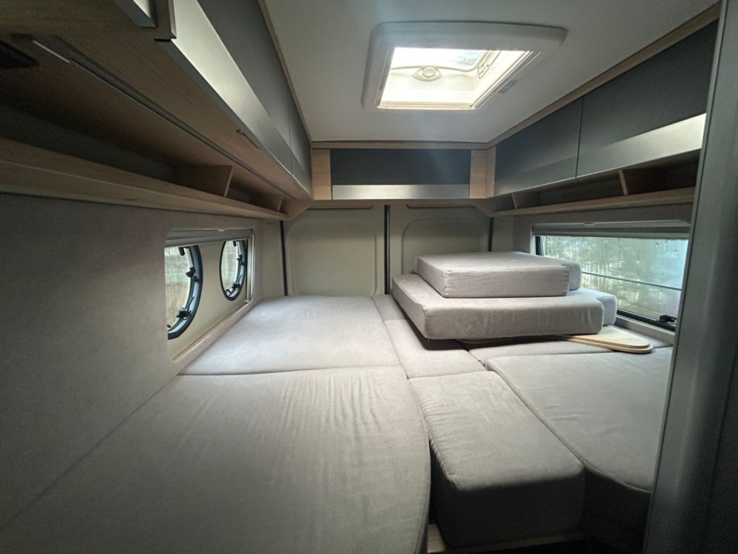 Fermeture porte coulissante latérale avec assistance électrique Softlock - Large marchepied électrique avec avertisseur sonore - moustiquaire de porte coulissante - Isolation performante - 2 trappes de rangement dans le plancher au niveau de la dinette - Mobilier de qualité - Réfrigérateur à absorption - Lit arrière empilable permettant d’agrandir le volume de la soute