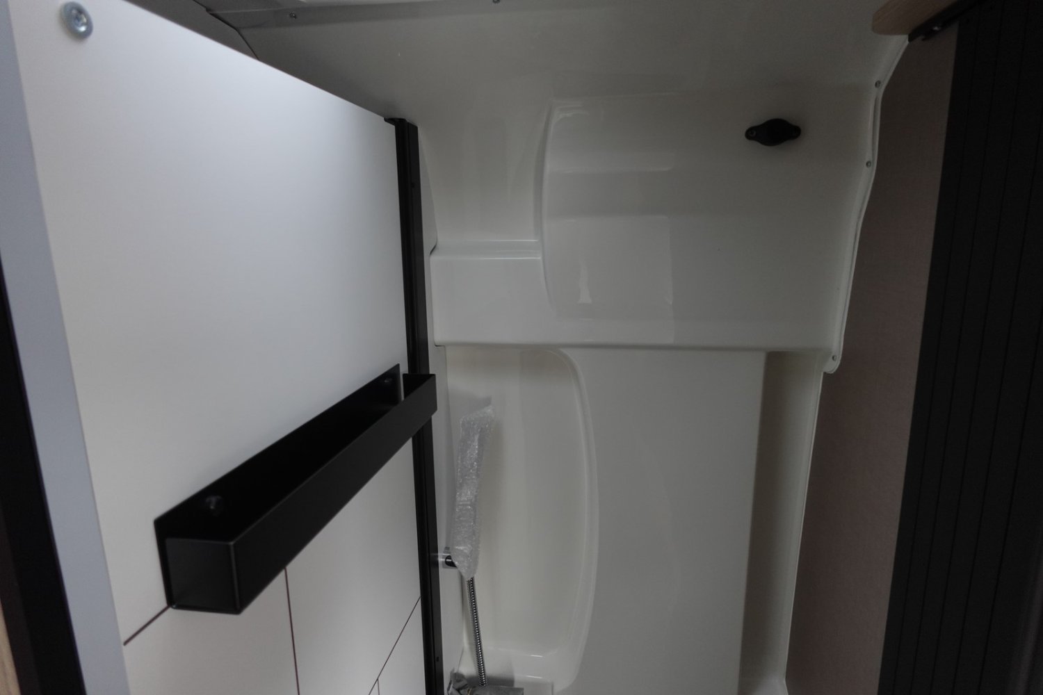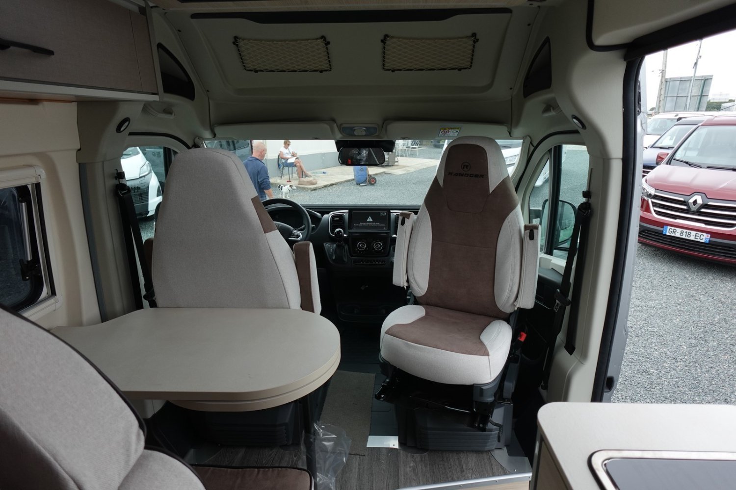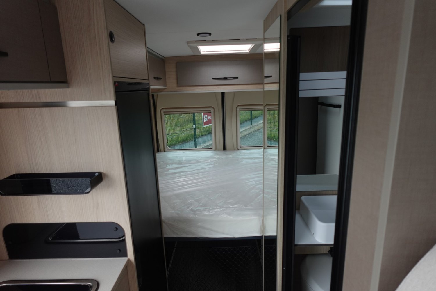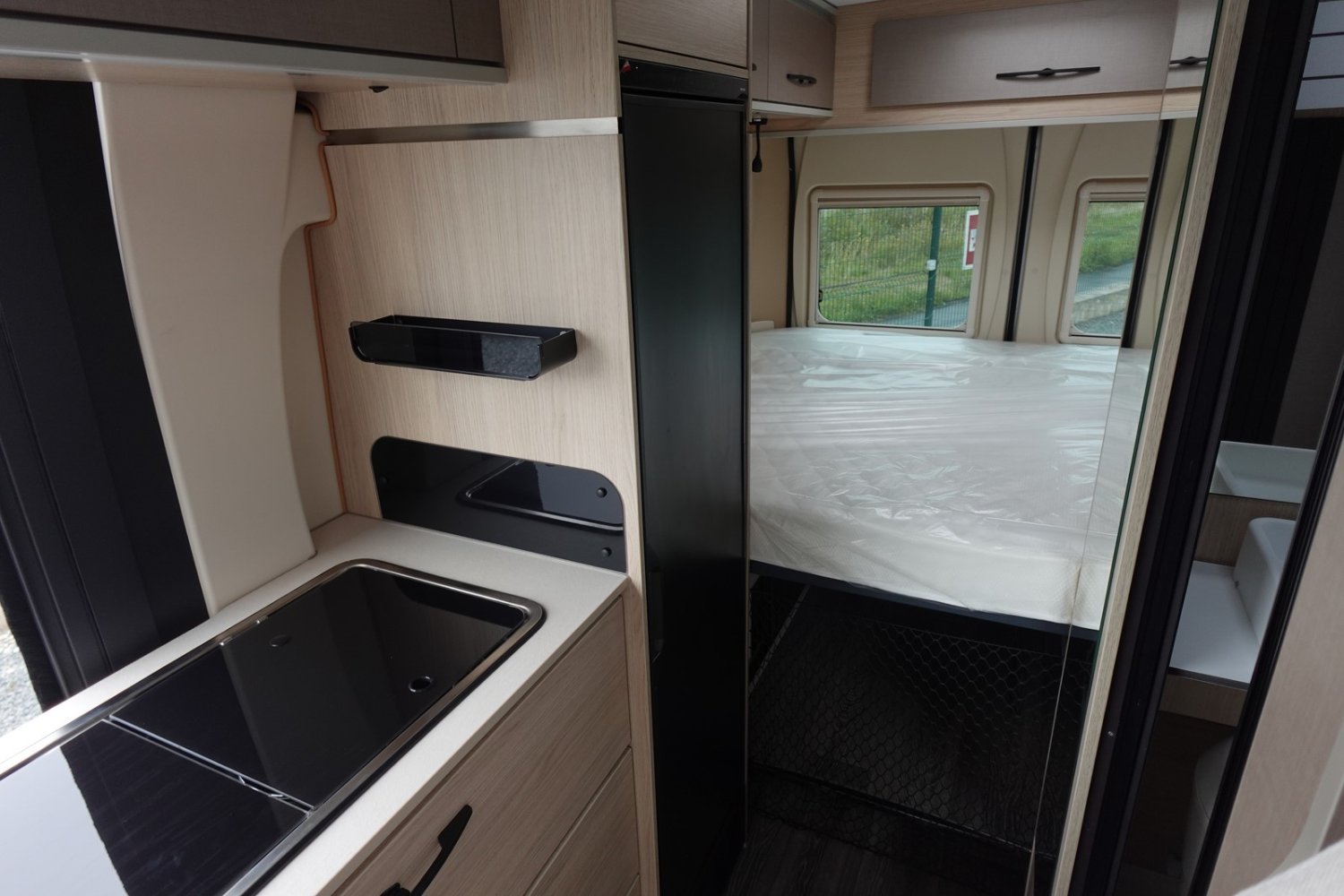 Magnifique fourgon comprenant un lit transversal, une cuisine avec de nombreux rangements, une salle d’eau avec douche séparée, un grand réfrigérateur et un salon avant panoramique.