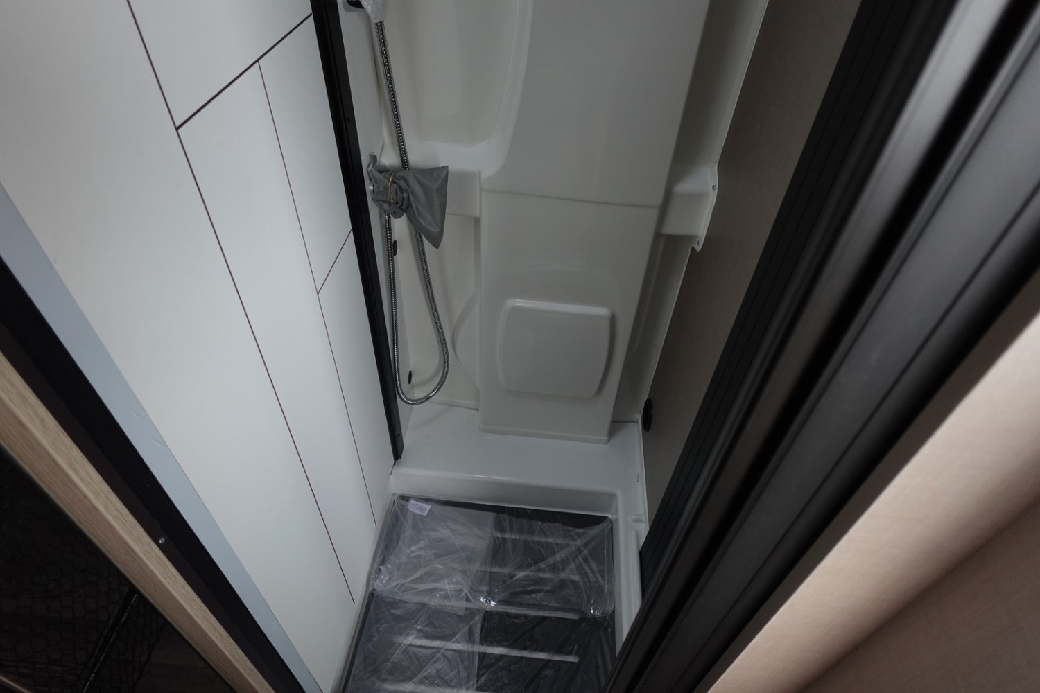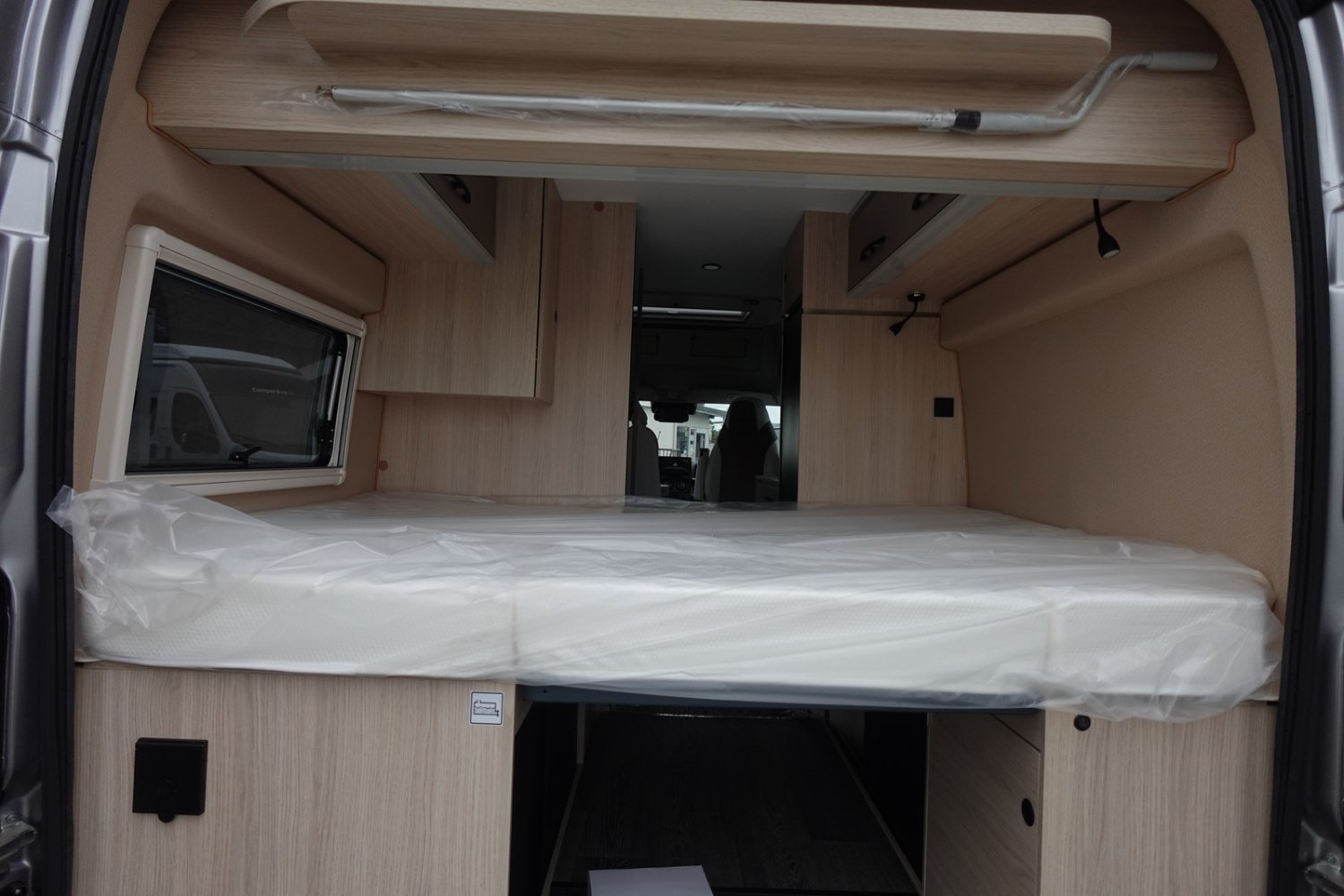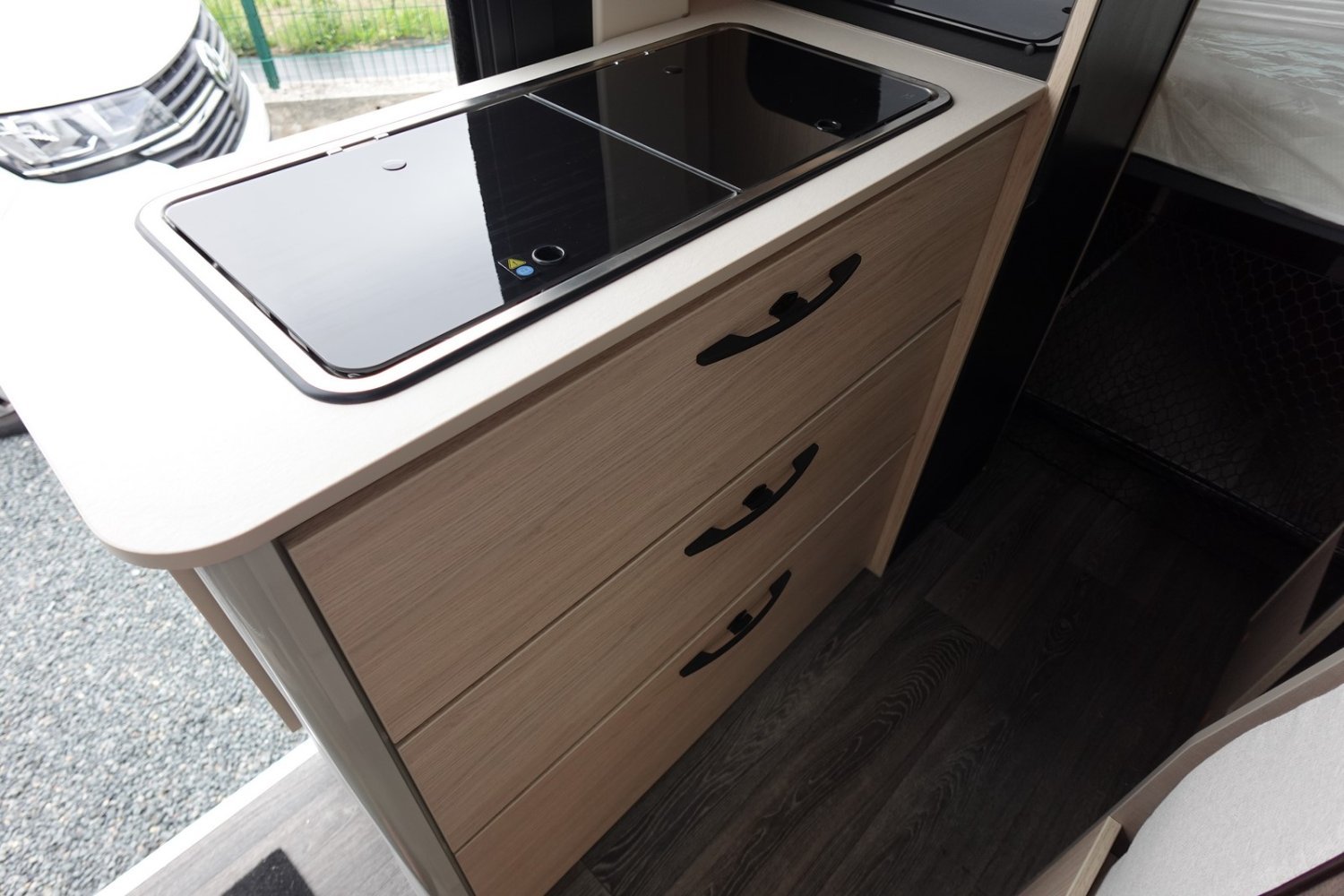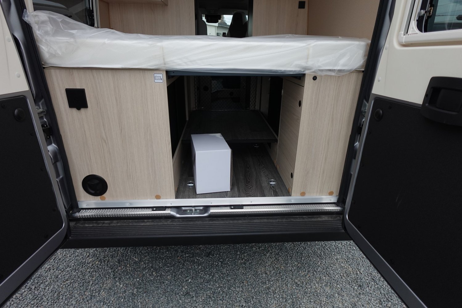 Magnifique fourgon comprenant un lit transversal, une cuisine avec de nombreux rangements, une salle d’eau avec douche séparée, un grand réfrigérateur et un salon avant panoramique.