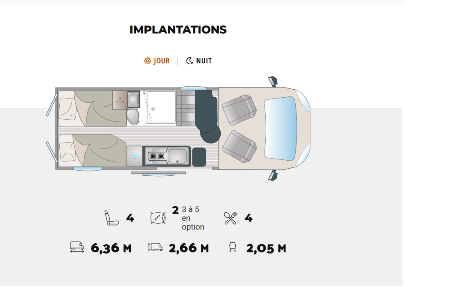- Dimensions : L 6.36m x l 2.05m x h 2.66m