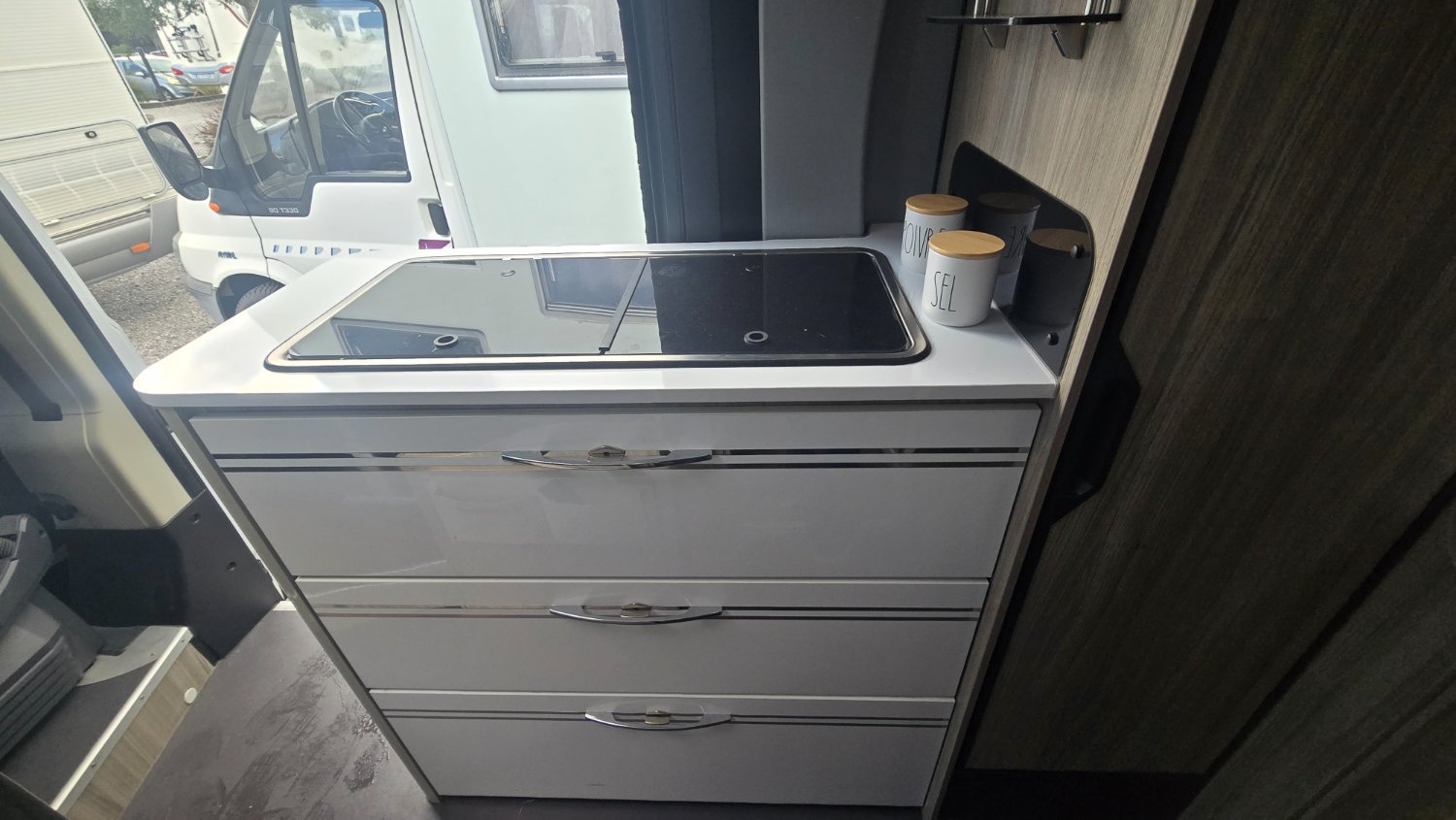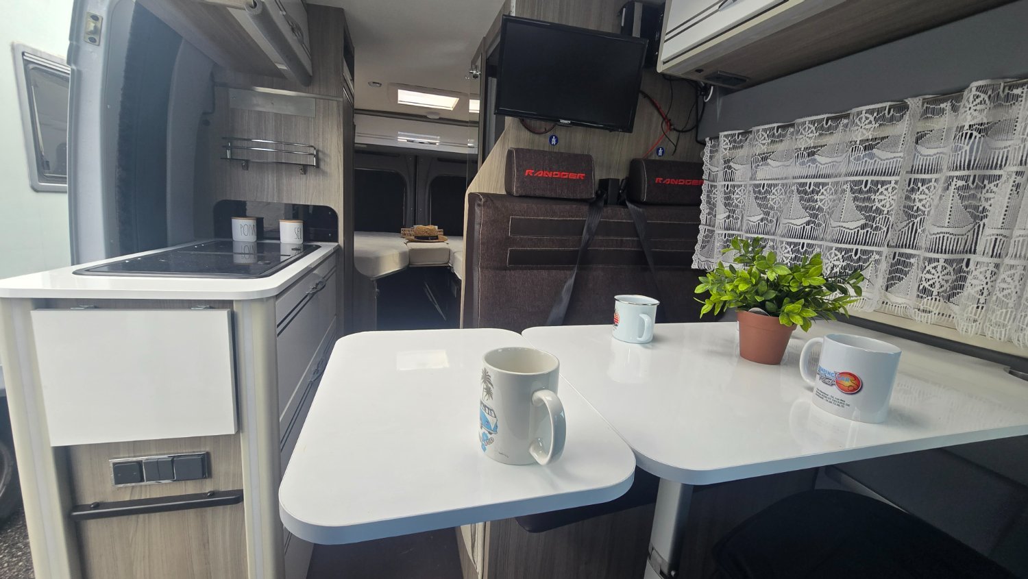 L'implantation est composée de deux grand couchages lit jumeaux et lit dînette, d'une vraie salle de bain, d'un grand réfrigérateur et son salon accueille quatre personnes.
