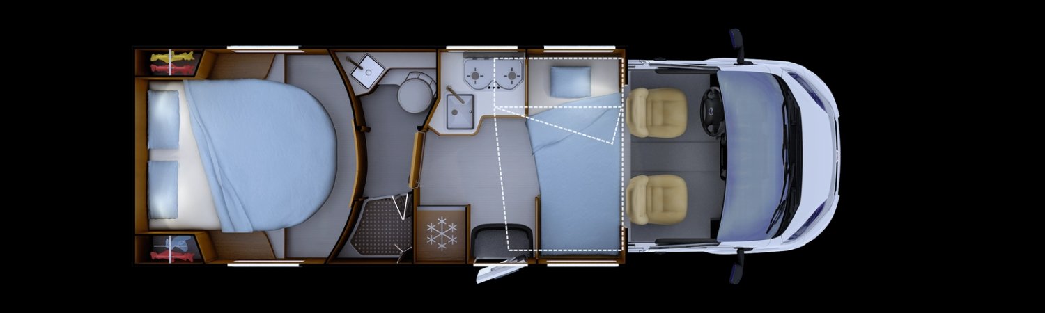 PACK SELECT: Caméra de recul avec écran de contrôle intégré au tableau de bord, Station multimédia DAB PIONEER® avec écran 6,8" et fonctions APPLE CARPLAY/ANDROID AUTO, Commandes au volant pour radio, Peinture pare-chocs avant couleur carrosserie, Skid plate noire, Phares antibrouillard avant, Pneus all season 3PMSF, Traction+ avec Hill Descent Control (aide au maintien de la vitesse en descente), Stores pare-brise et baies cabine double plissés à cassette, Porte cellule à serrure 2 points avec baie fixe et poubelle intégrée, Moustiquaire de porte cellule, Inverseur automatique, permet de rouler avec le chauffage gaz (système anticrash), 2e clef télécommandée (PLIP)