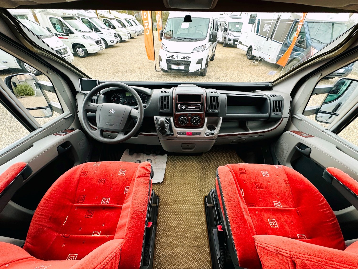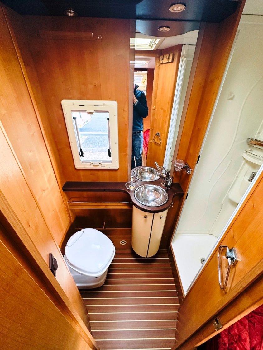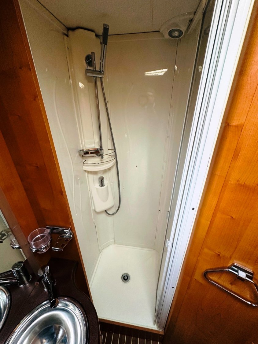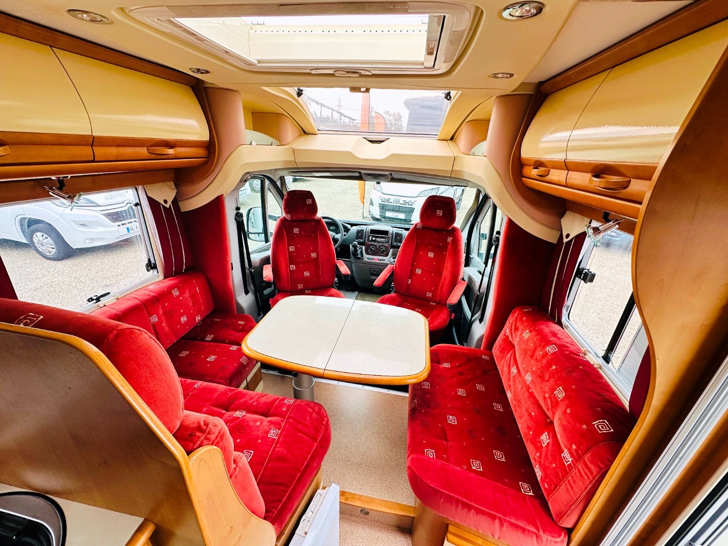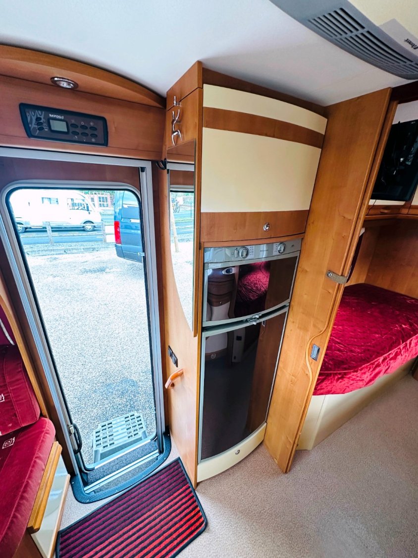 Profilé Rapido, fabrication Française haut de gamme, agencement confortable avec un lits jumeaux, 3 couchages, très grande salle de bain sur l’arrière de la cellule avec douche indépendante, une cuisine en L équipée d’un grand frigo automatique, et un vaste salon avant avec banquette latérale et sièges cabines pivotants convertible en un couchage d’appoint.