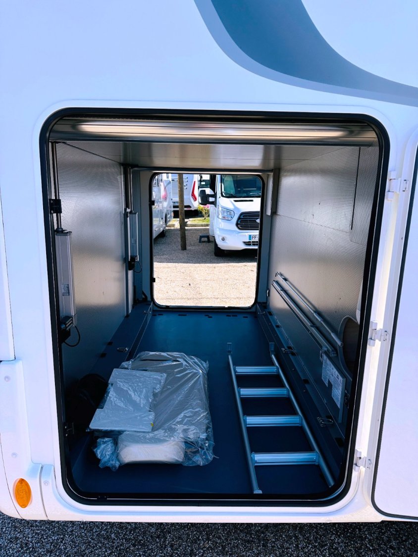 Intégral Rapido, lit central réglable en hauteur (électriquement), 4 couchages, salle de bain avec grande douche entièrement séparée, double fermeture chambre arrière, cuisine spacieuse et toute équipée, vaste salon avant avec sièges pivotant et table centrale, lit pavillon en cabine pour deux adultes.