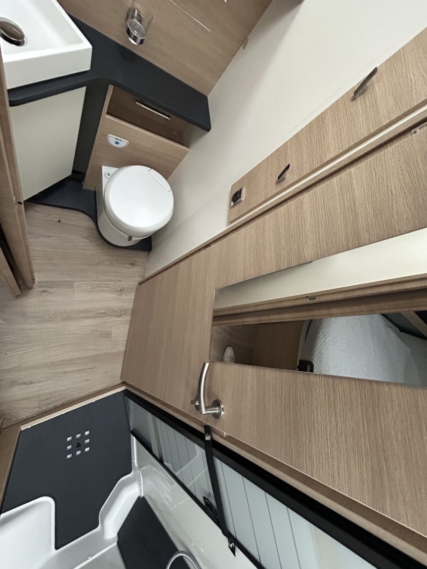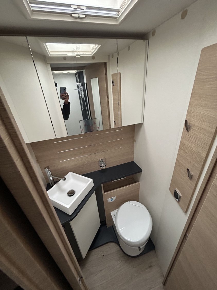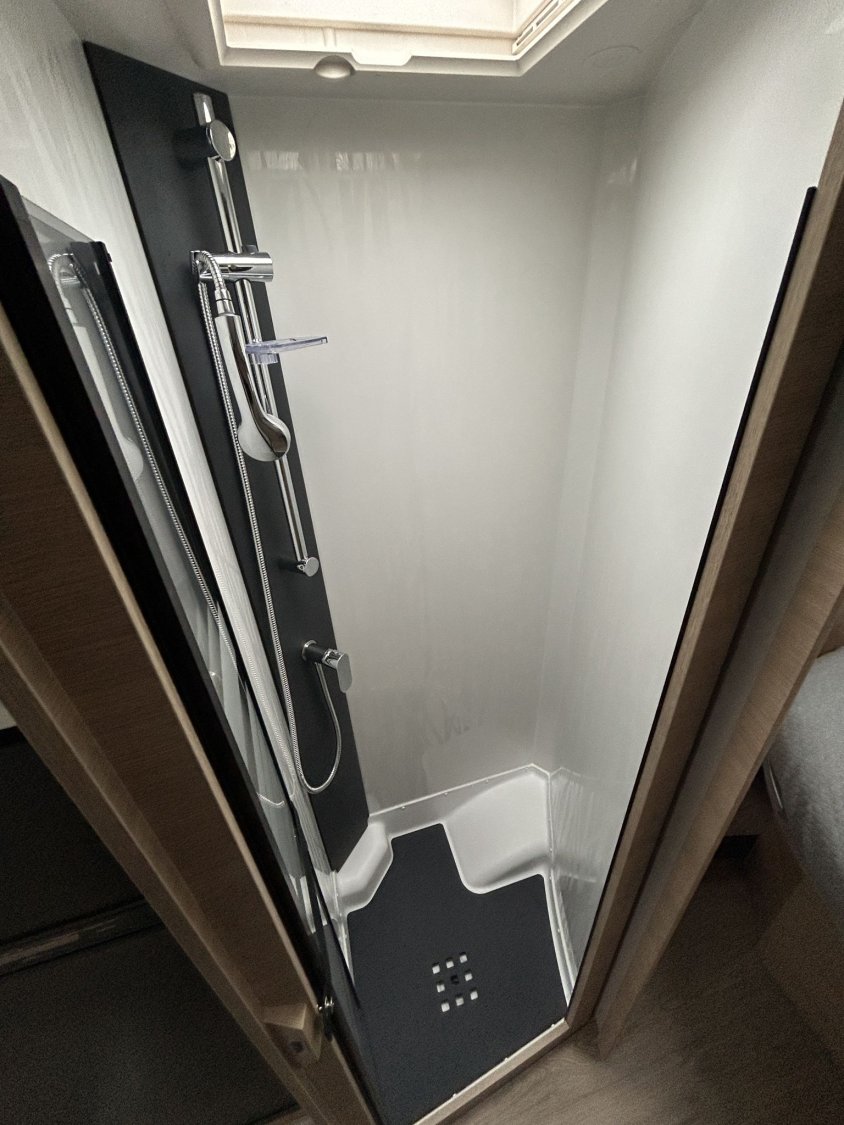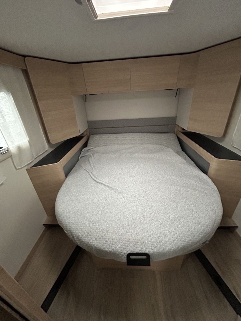 🛏️ Aménagement & confort intérieurLit permanent réglable en hauteur, assisté par vérins électriques