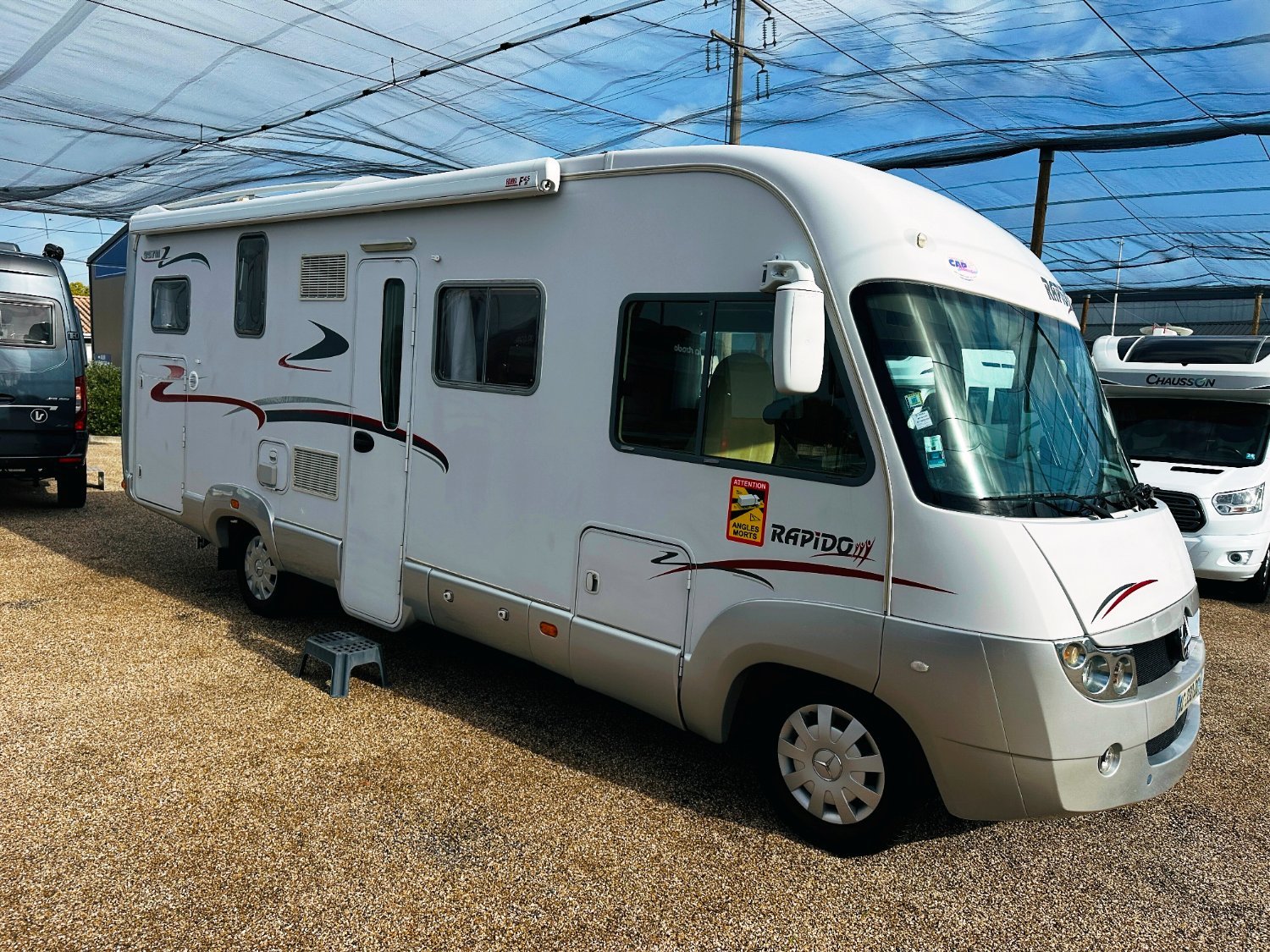 Intégral Rapido poids lourd (3.88 T), lit transversal sur immense soute garage, 4 couchages, salle de bain avec grande douche entièrement séparée, cuisine spacieuse et toute équipée, vaste salon avant avec sièges pivotant et table centrale, lit pavillon en cabine pour deux adultes.