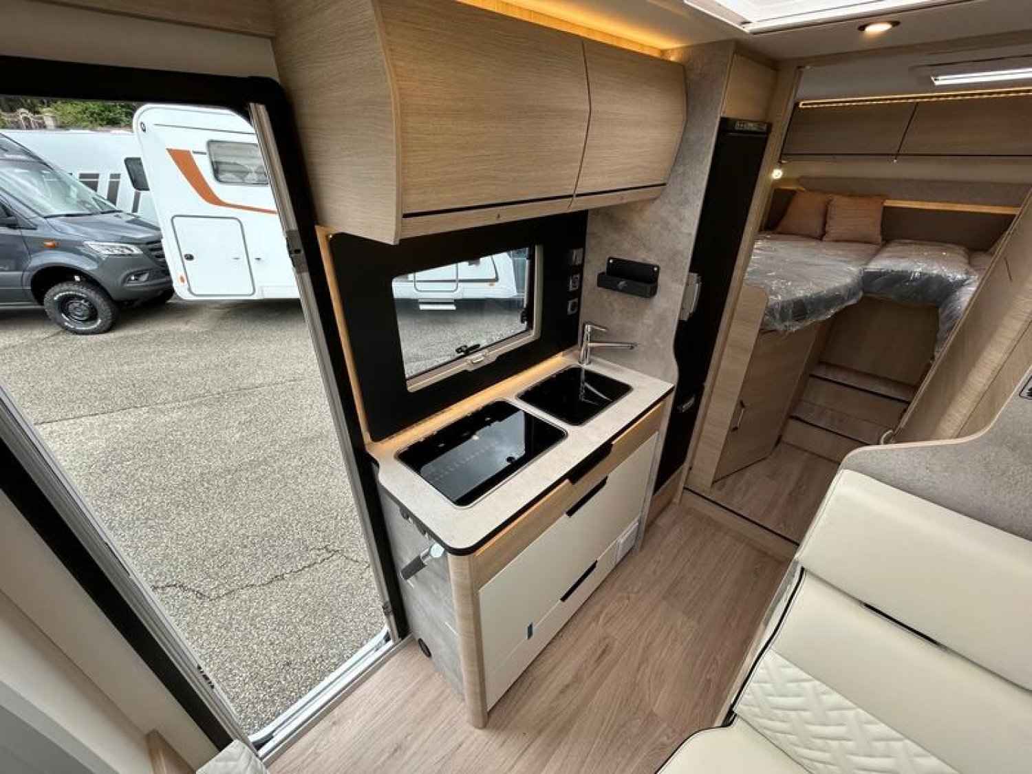 PACK SELECT Caméra de recul avec écran de contrôle intégré au tableau de bord •Station multimédia DAB PIONEER® avec écran 6,8" et fonctions APPLE CARPLAY/ANDROID AUTO •Commandes au volant pour radio •Peinture pare-chocs avant couleur carrosserie •Skid plate noire •Phares antibrouillard avant •Pneus all season 3PMSF •Traction+ avec Hill Descent Control (aide au maintien de la vitesse en descente) •Stores pare-brise et baies cabine •Porte cellule à serrure 2 points avec baie fixe •Moustiquaire de porte cellule •2e clef télécommandée (PLIP) •2e batterie cellule AGM 92 Ah : 4350 €
