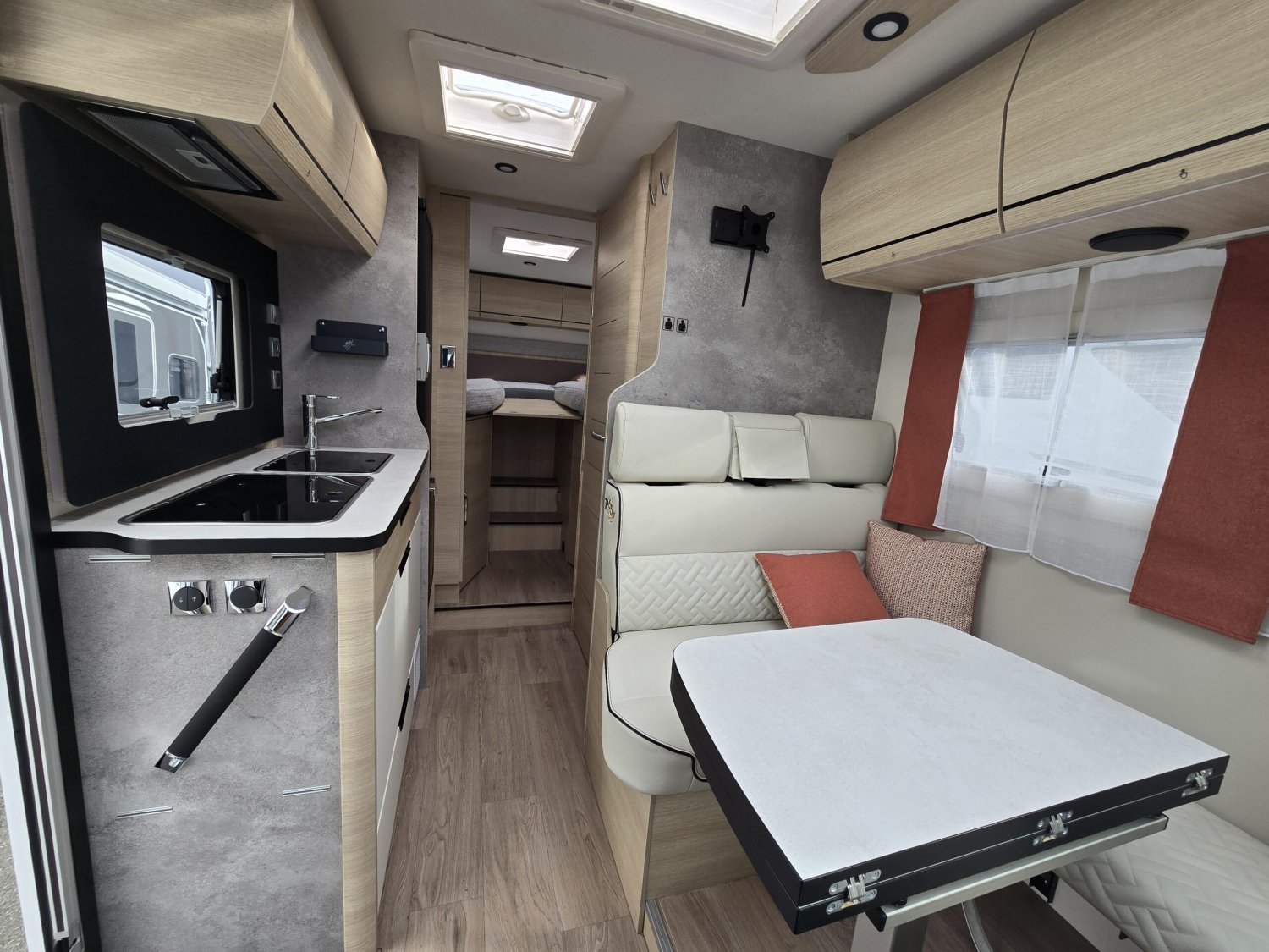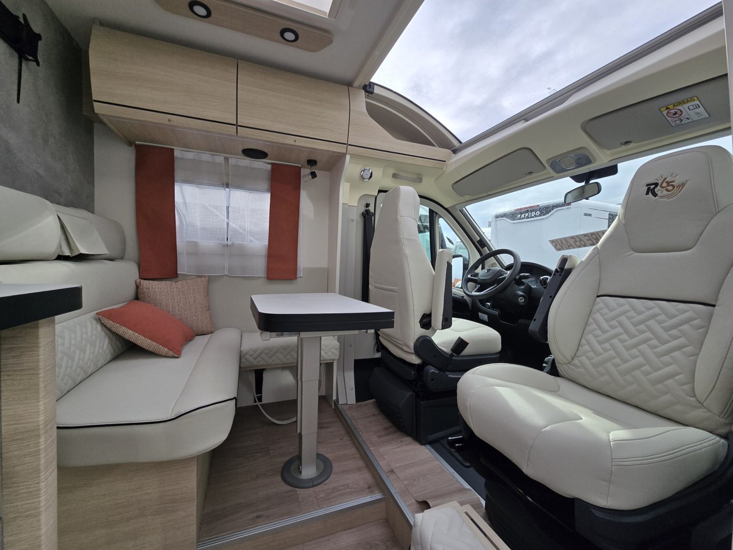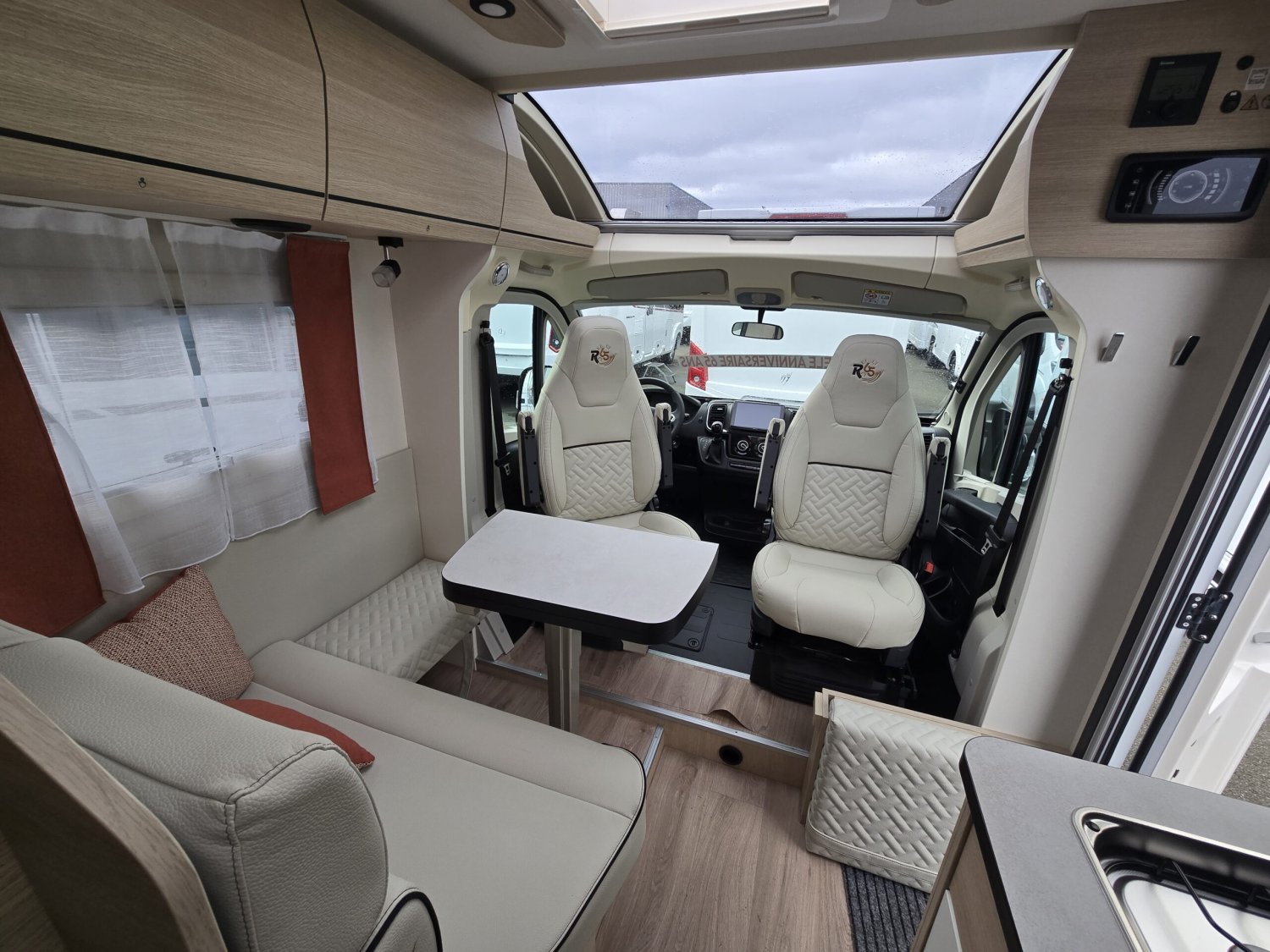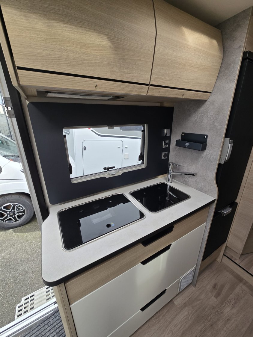 Frein de stationnement électrique – Batterie cellule LITHIUM 100 Ah – Habillage gris aluminium sur bouche d’aération – Commandes au volant pour radio-Volant et pommeau de levier de vitesses cuir- Réservoir d’eaux usées chauffé – TRUMA Combi 4 DIESEL avec kit altitude et commande de chauffage CP PLUS
