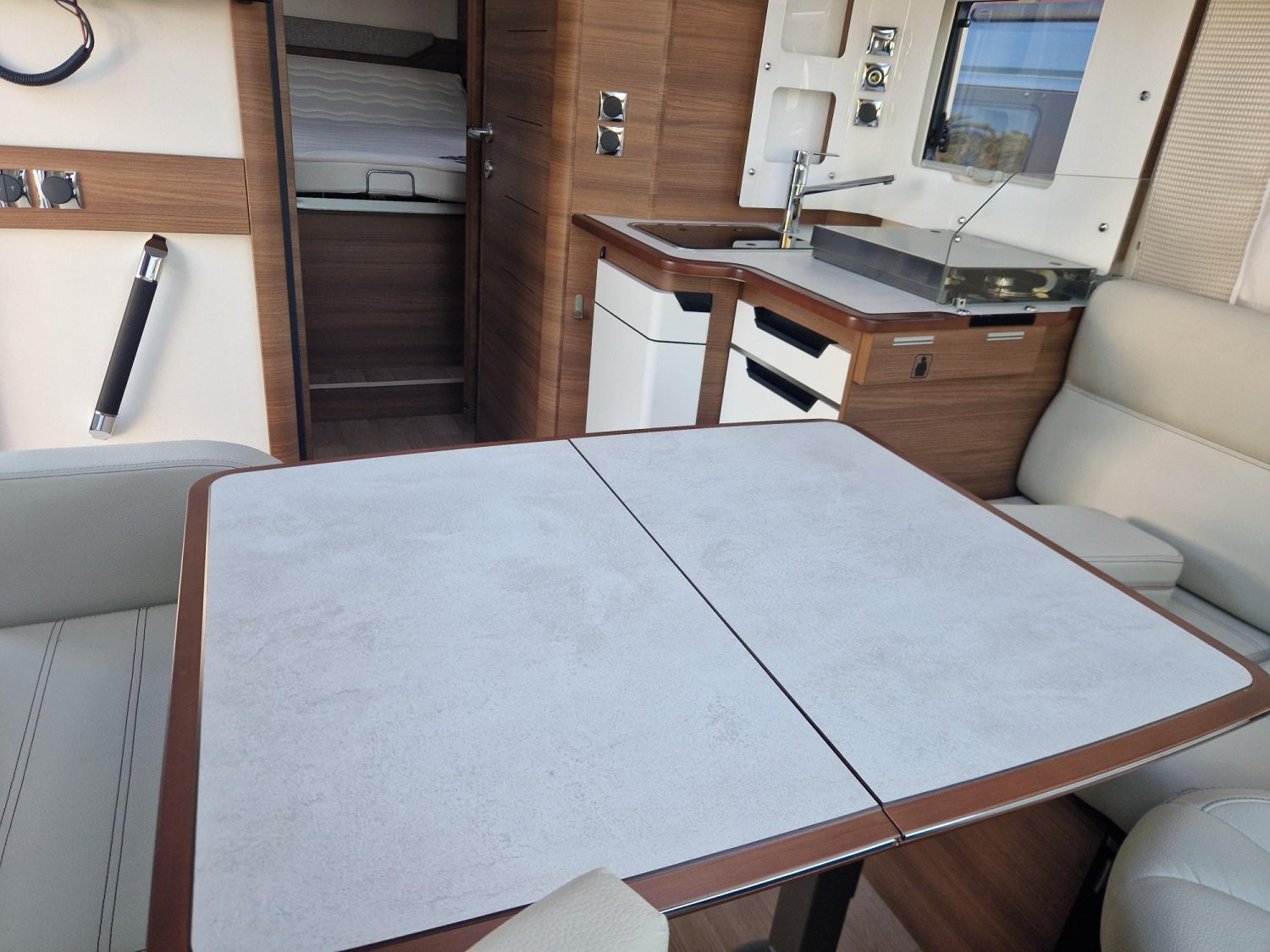 Profilé compact avec lit central modulable en hauteur, état neuf, très bien équipé, faiblement kilométré, entretiens à jour, sur une base Peugeot 2.2 l / 140 CV. A découvrir chez votre concessionnaire LIBERTIUM Muret.