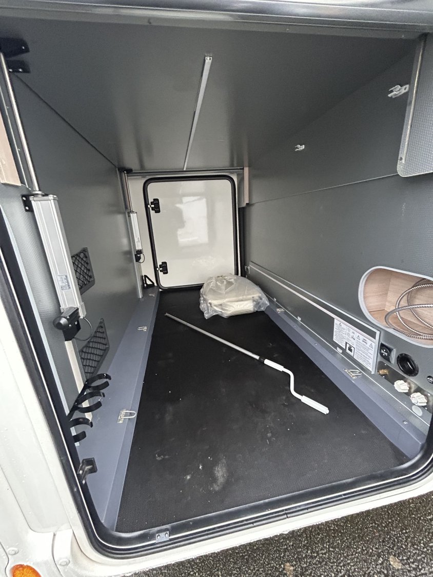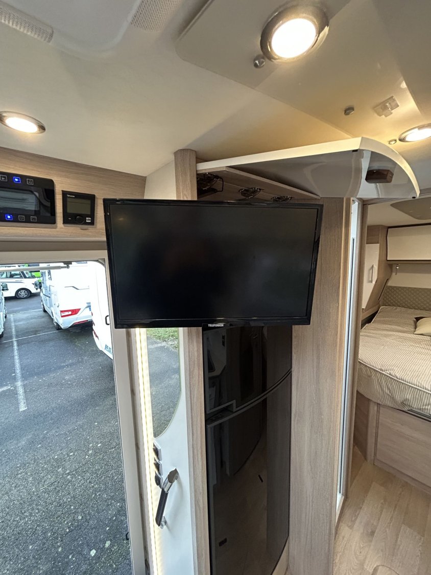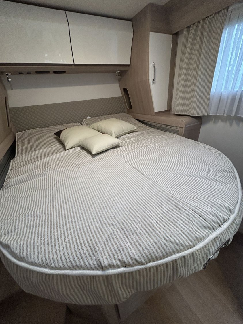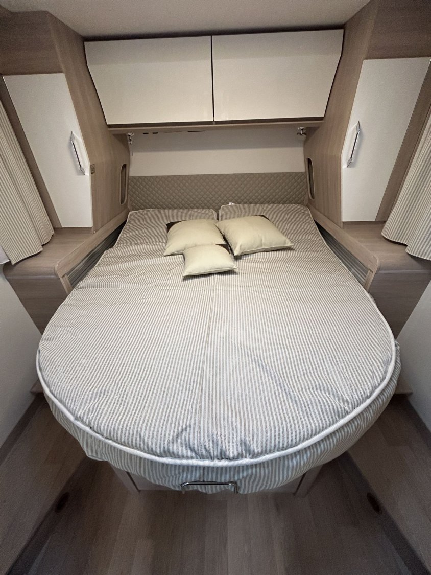 Avec ses 7,54 m, cet intégral propose un aménagement très apprécié : lit central réglable en hauteur avec surmatelas à mémoire de forme, lit pavillon électrique, jusqu’à 4 couchages et 3 places carte grise, dans un espace de vie spacieux, lumineux et parfaitement équilibré.