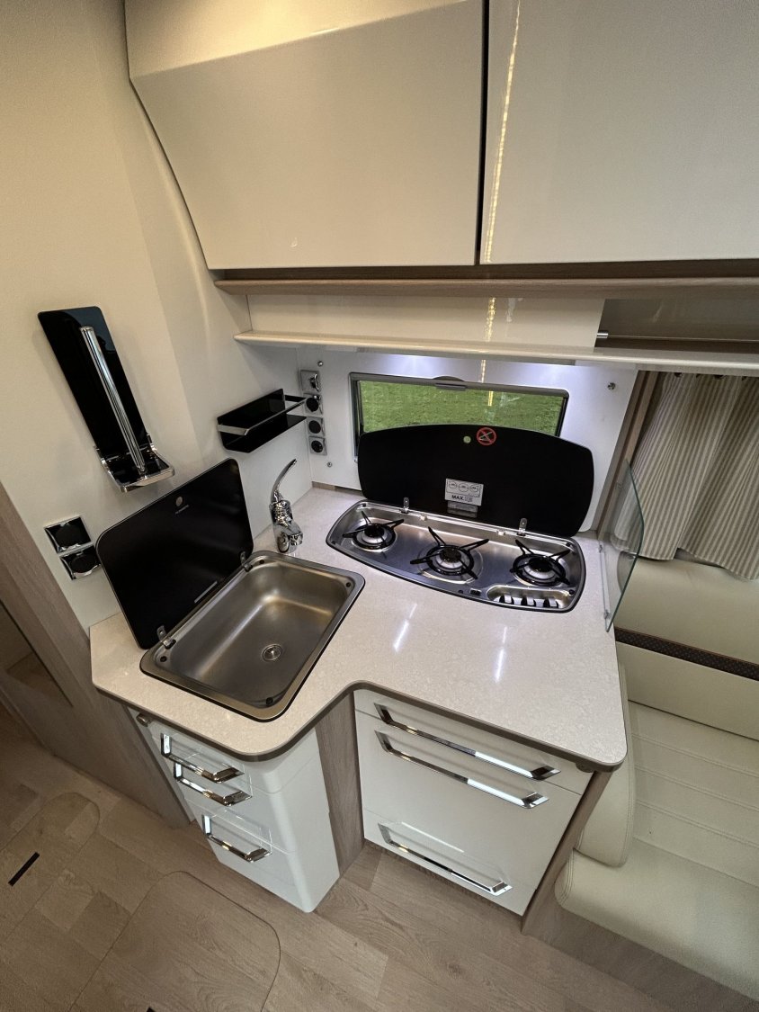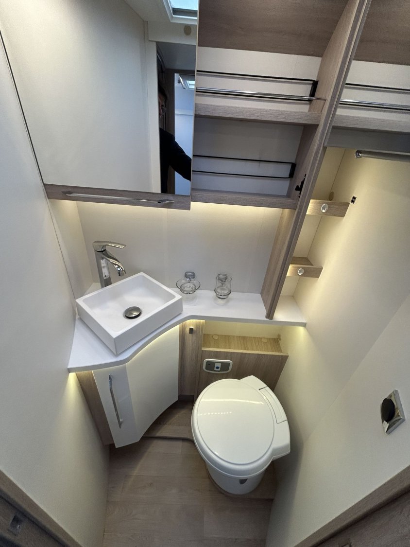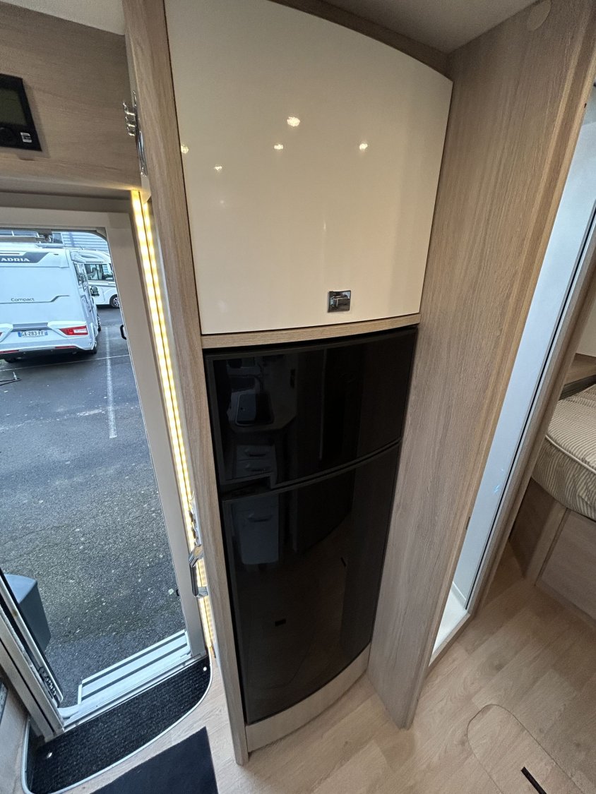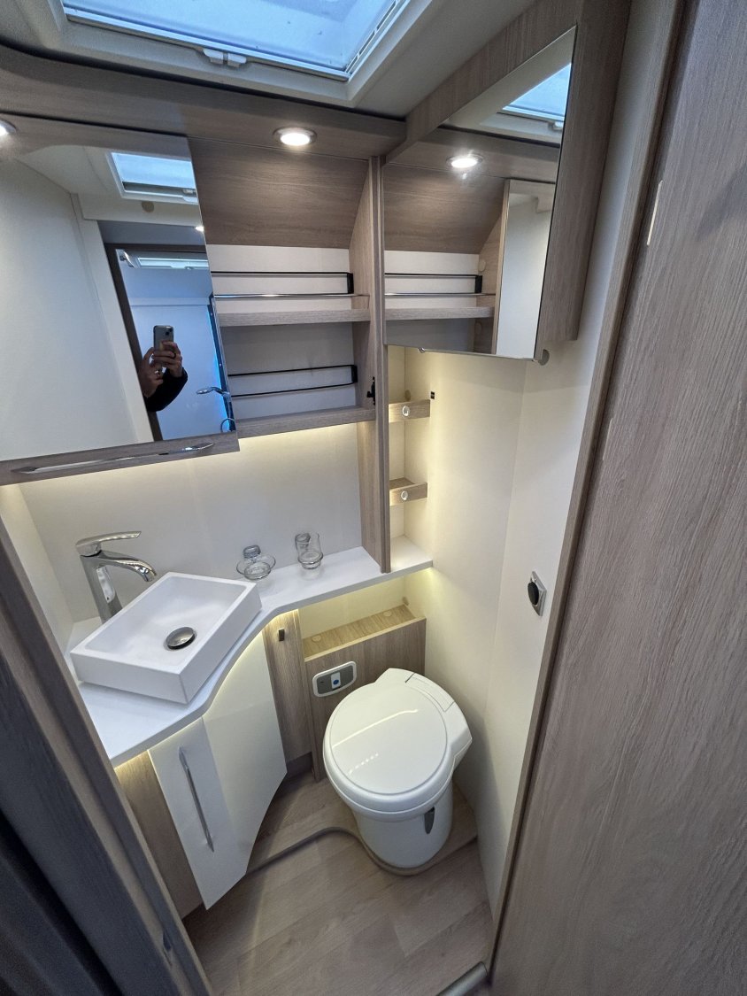 Avec ses 7,54 m, cet intégral propose un aménagement très apprécié : lit central réglable en hauteur avec surmatelas à mémoire de forme, lit pavillon électrique, jusqu’à 4 couchages et 3 places carte grise, dans un espace de vie spacieux, lumineux et parfaitement équilibré.