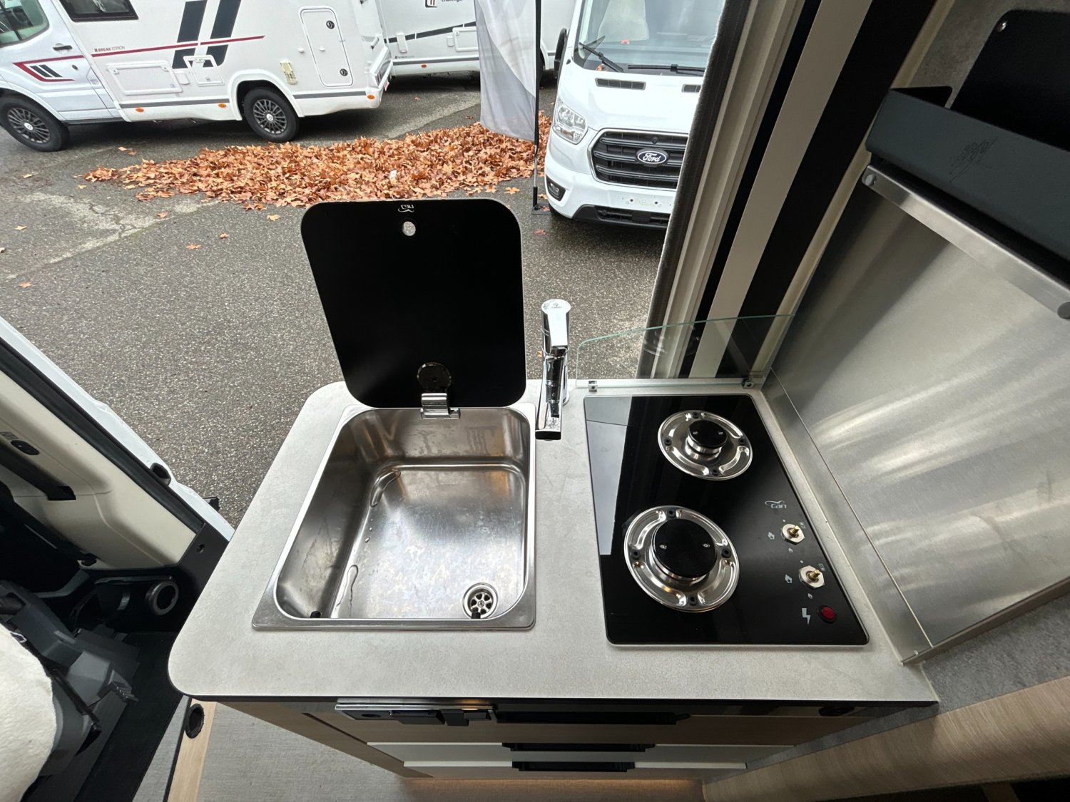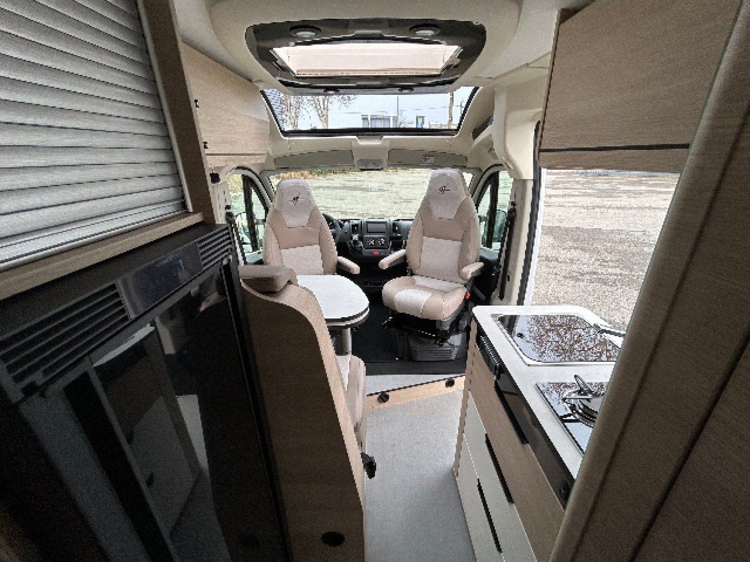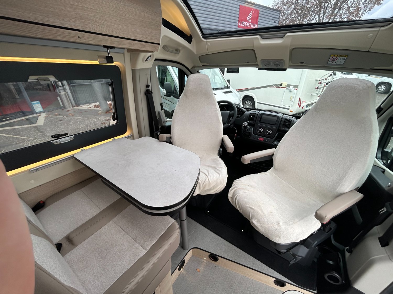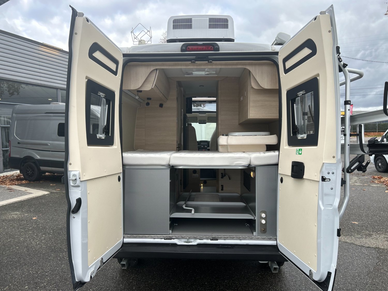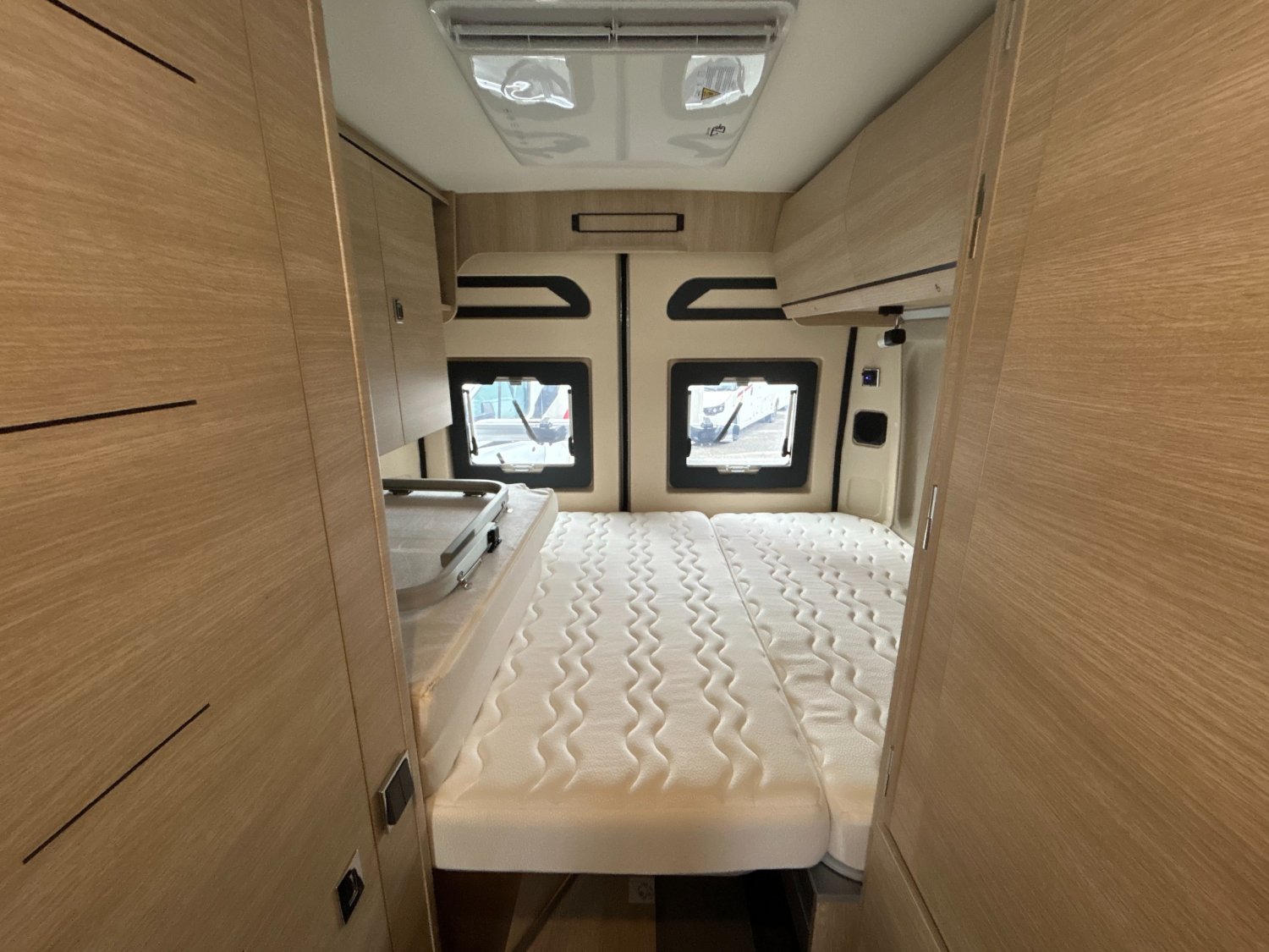 Profilé/van aménagé compact (˜ 5,99 m). 4 places carte grise / 2-3 couchages (lit transversal + banquette convertible). Motorisation 2.2 L – 140 ch sur porteur Peugeot / Peugeot Boxer. Lit arrière confortable 132 × 195 cm, salon modulable et convivial, cuisine équipée, salle d’eau avec douche séparée + WC, grand frigo (˜ 146 L) et rangements bien pensés. Isolation thermique renforcée, aménagement intelligent (penderie modulable « MODUL’SPACE® »), chauffage intégré et confort de conduite optimal : idéal pour voyager librement et profiter d’une vraie autonomie sans dépasser les 6 m.