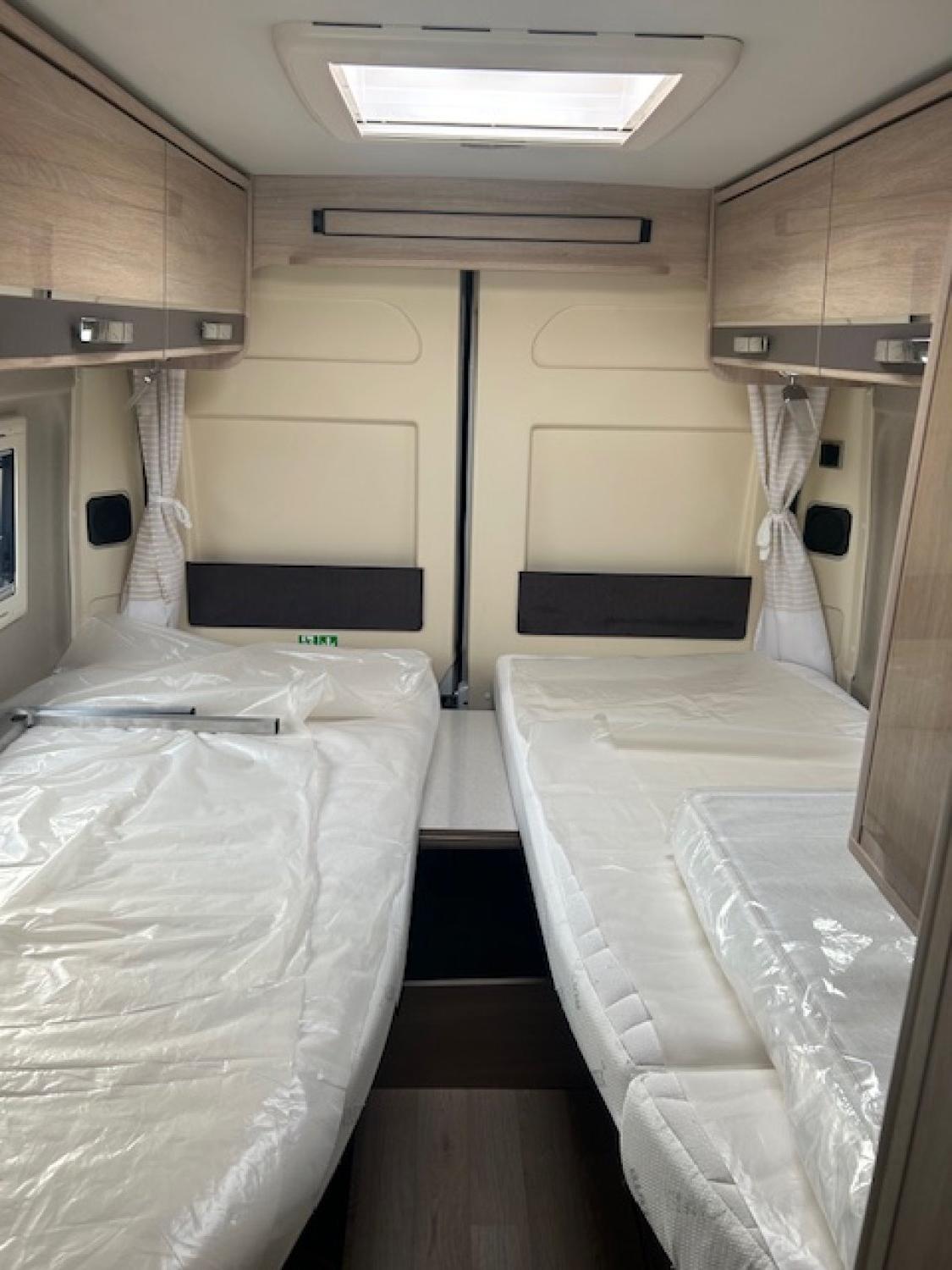 Ce fourgon de première main en très bon état vous propose un confortable couchage en lits jumeaux.
