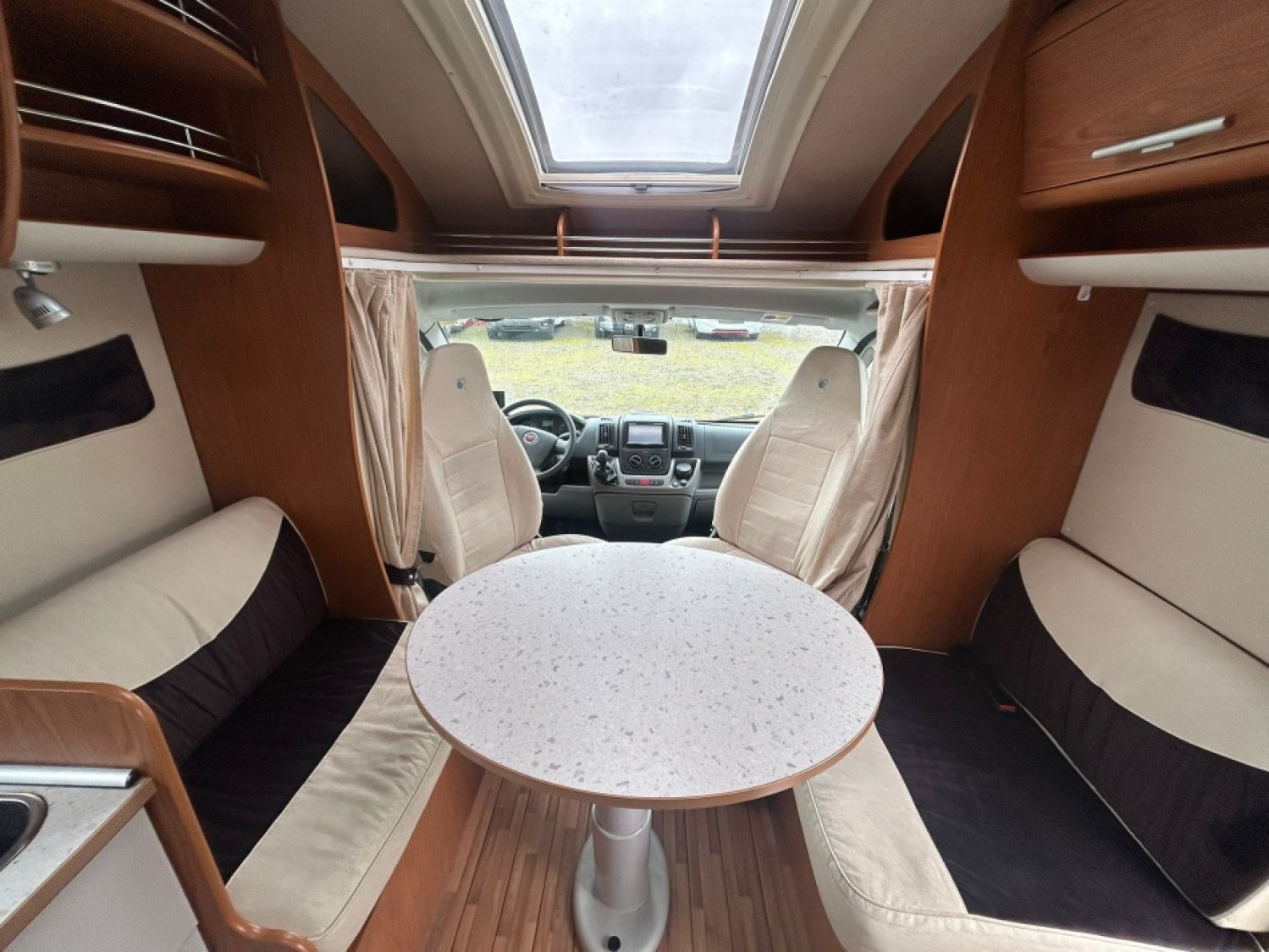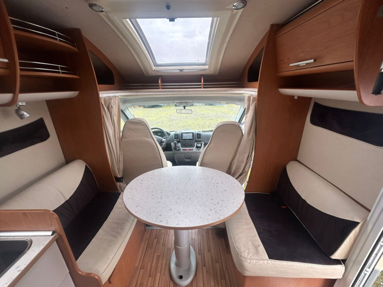 Véhicule profilé avec grand salon face/face, nombreux rangements, lit central, douche et toilettes séparées