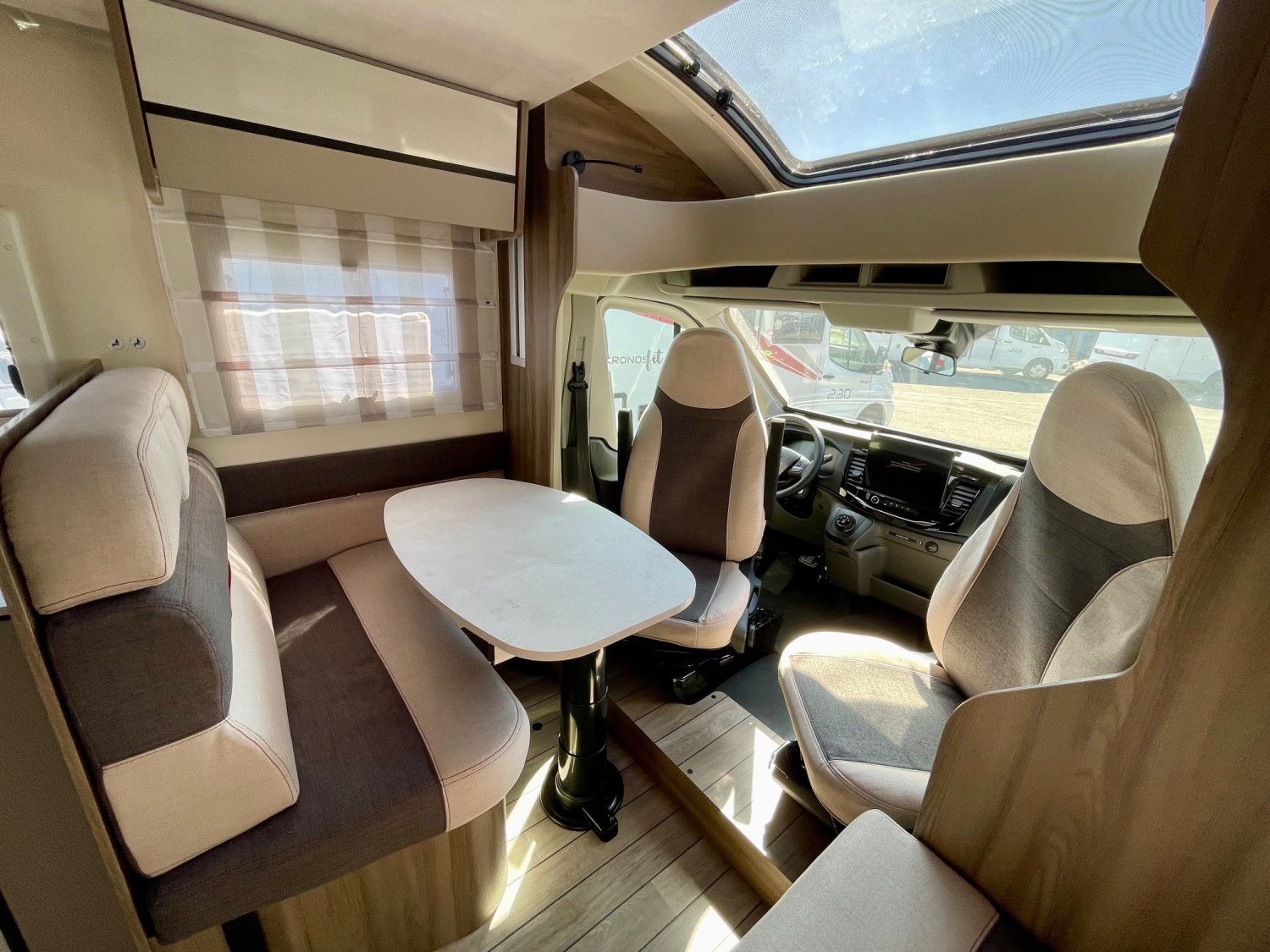 PACK KRONOS COMPRENANT, Motorisation 165CV, Feux diurnes "High Series", Boite à gants avec serrure, Habillage intérieur et tableau de bord finition "Trend", Pare-chocs et bas de caisse latéraux peints, Porte XL avec 2 points de fermeture, baie et centralisation, Panneau de controle CP Plus, Couvercle évier / Planche à découper, Panneau solaire 200W avec régulateur MPPT, Skyroof, Stores occultants cabine, Housses de sièges cabine