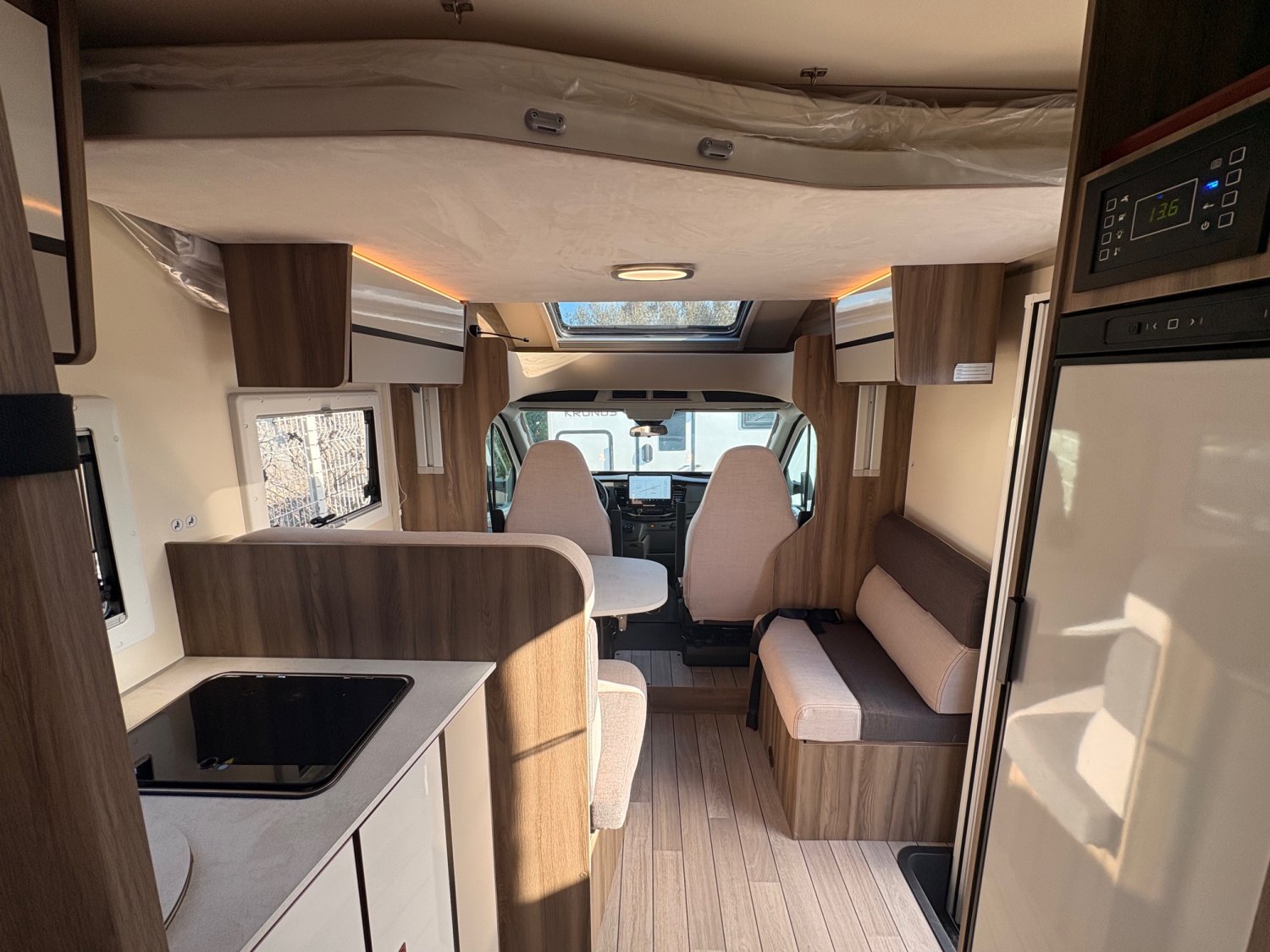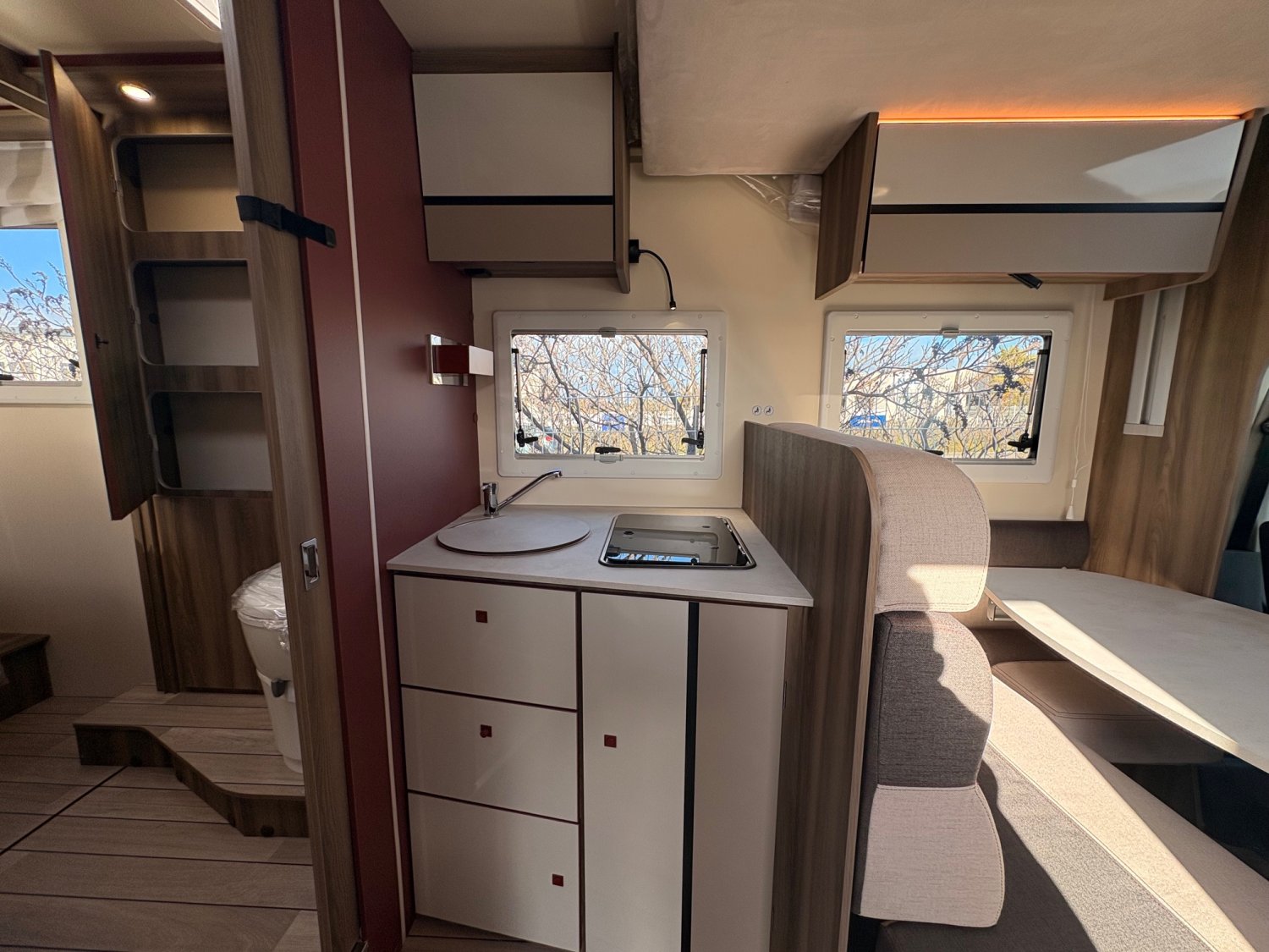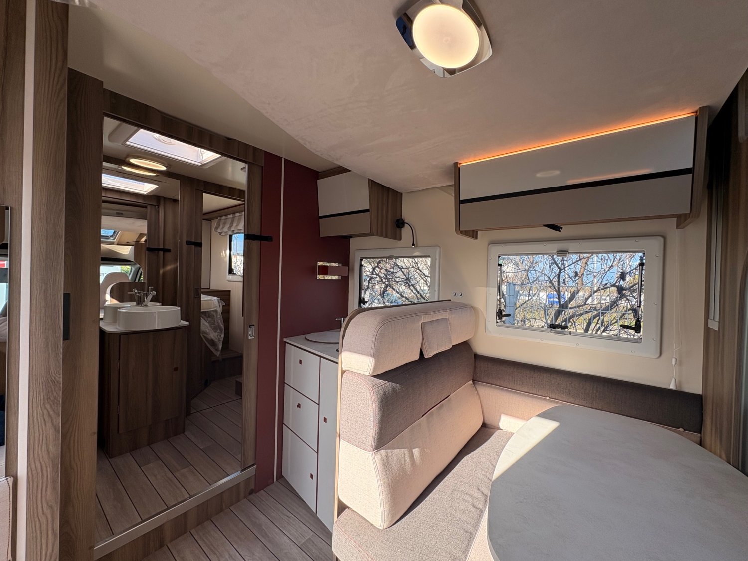 Il intègre une salle d’eau centrale, un lit central confortable, et un habitat lumineux, permettant d'accueillir jusqu'à cinq convives grâce à une banquette en L et un sofa latéral.
