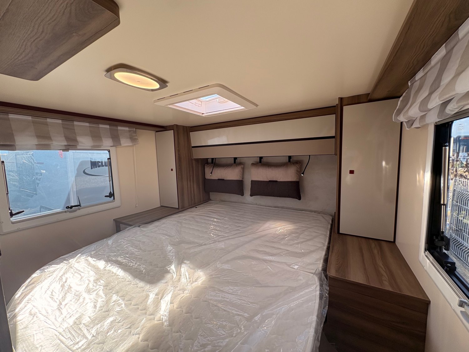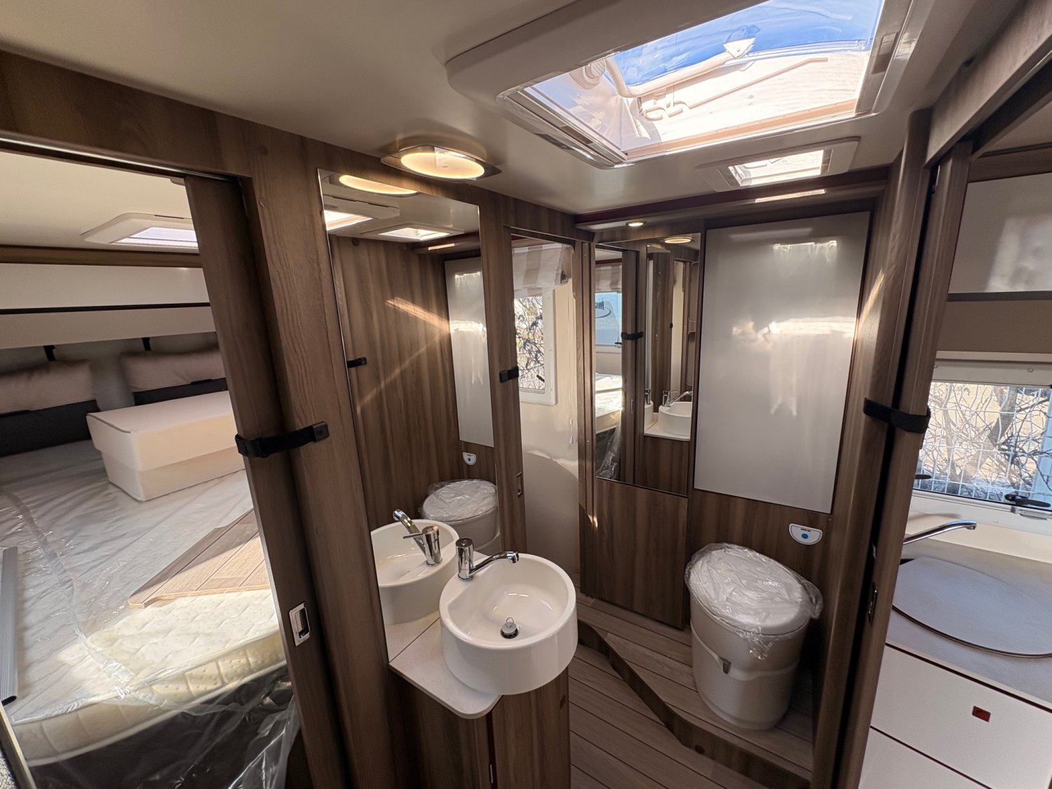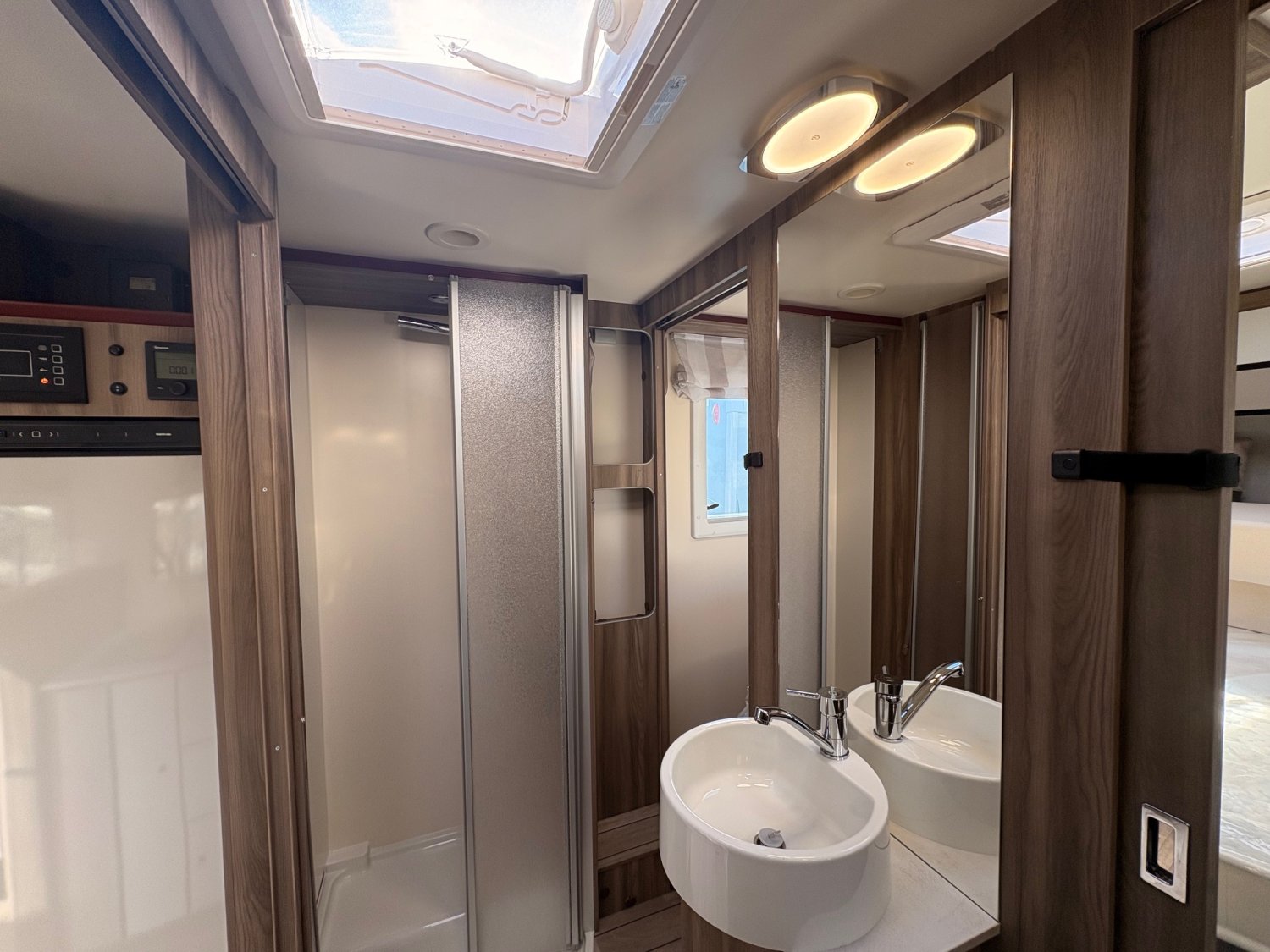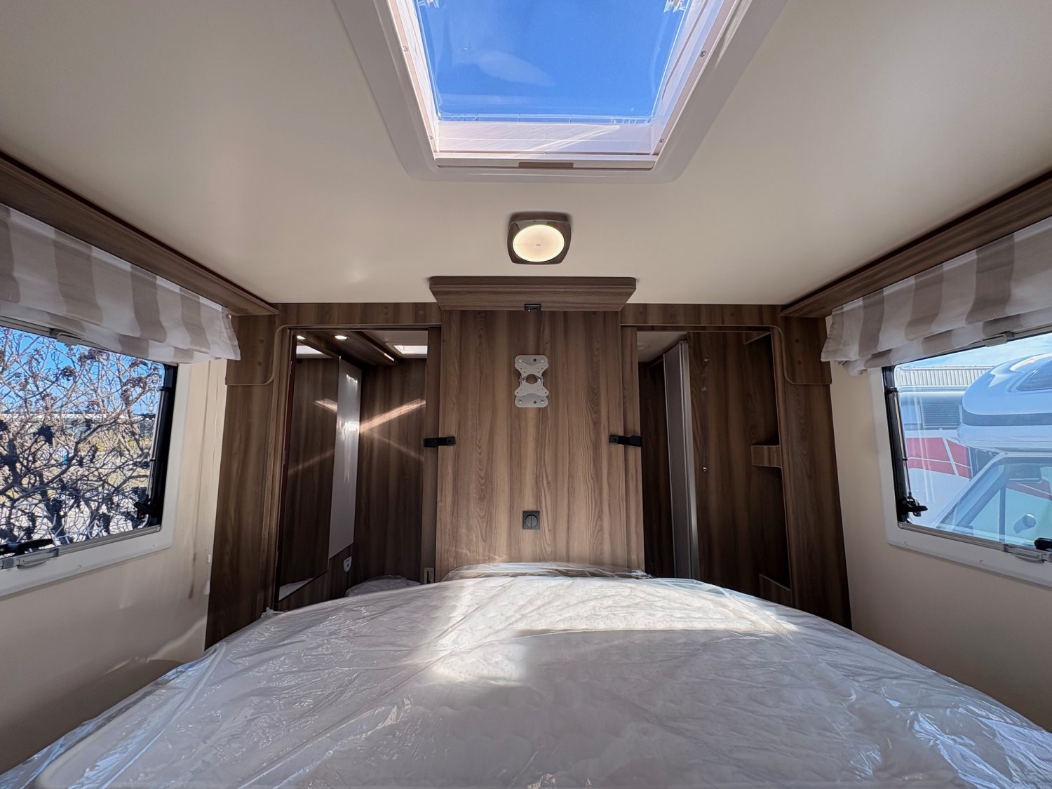Il intègre une salle d’eau centrale, un lit central confortable, et un habitat lumineux, permettant d'accueillir jusqu'à cinq convives grâce à une banquette en L et un sofa latéral.